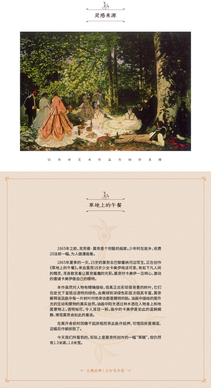 此款主题设计贯穿莫奈对外景写实的热爱,表达出树叶在阳光的照耀下呈现出来的鲜活生命力,此时25岁的青年画家莫奈与18岁花季少女卡美伊一见倾心,尽管景色宜人,阳光正好,也只是两人爱情的调味剂。