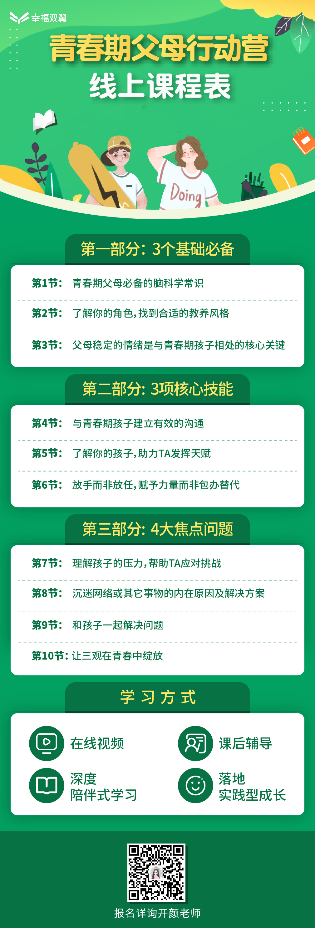 本课程将带领家长了解——父母必备的3个基础内容,掌握父母必备的3项核心技能,聚焦解决青春期孩子养育中常见的4大焦点问题,支持家长轻松陪伴孩子走过青春期,迎来全新的人生成长与蜕变。