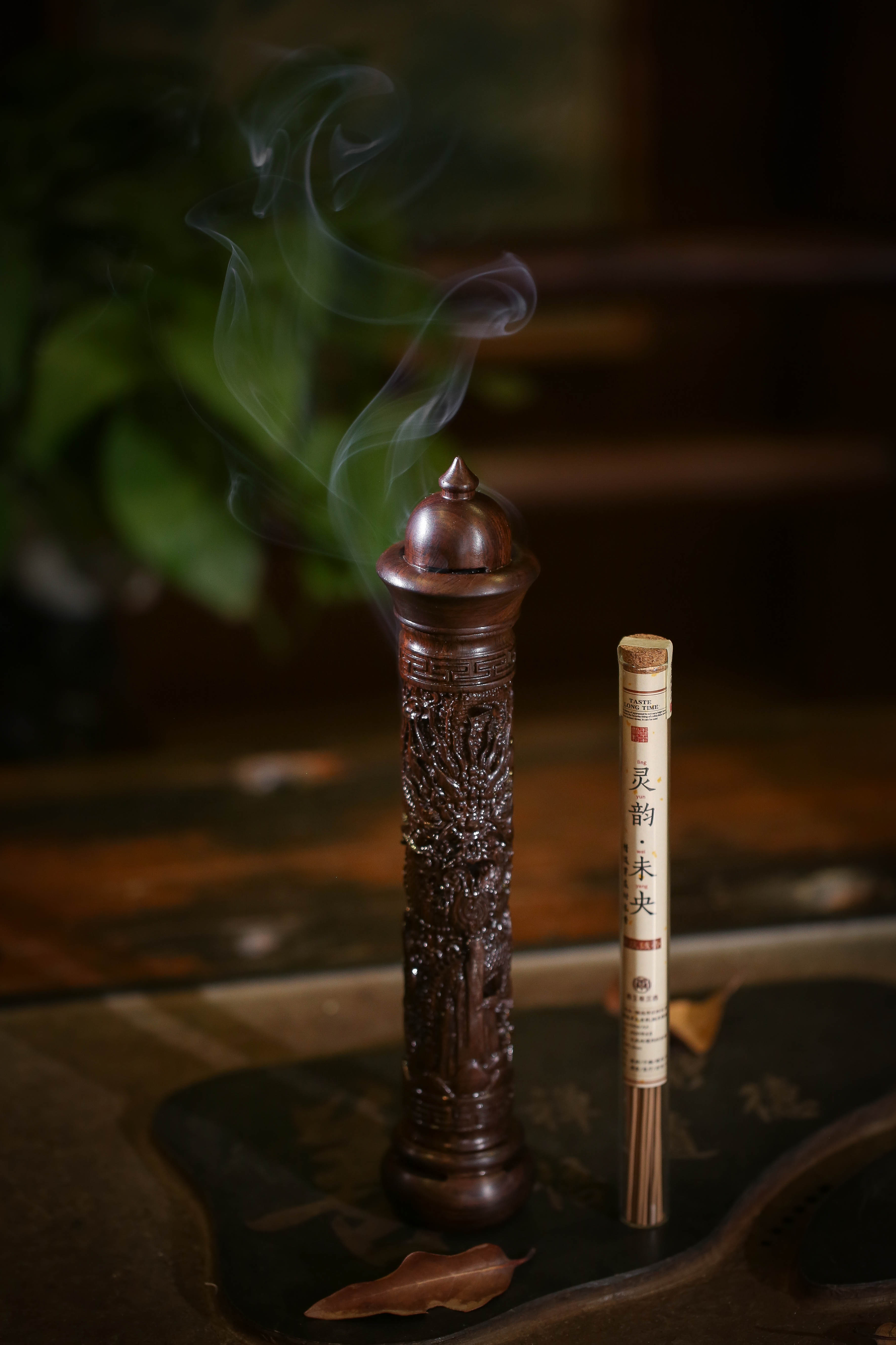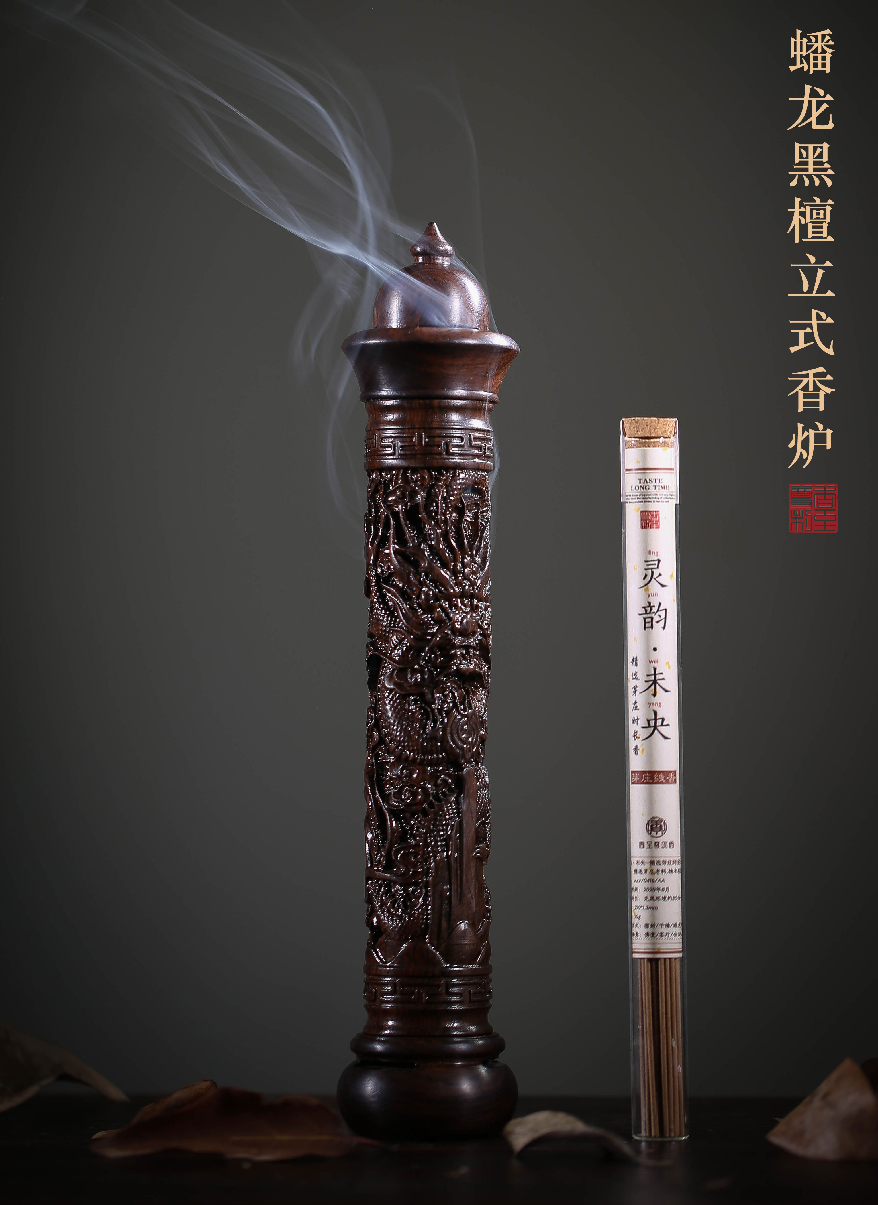精选名贵木料黑紫檀,传承中国龙之信仰,整体造型精美,镂空浮雕精湛,寄托蟠龙绕柱、消灾祈福的美好寓意,搭配天然沉香线香,品香观烟,相得益彰。