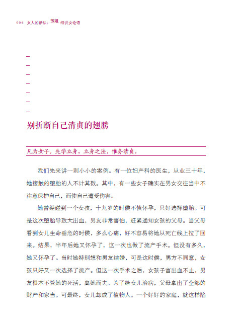 【基本信息】 书名:女人的活法:芳姐细讲《女论语》 作者:刘芳 出版社:世界知识出版社 出版日期:2018-01-01 ISBN:9787501254941 字数:219千 页码:339 版次:1 装帧:平装-胶订 开本:16开 定价:45元 【目录】 立身章 di yi 别折断自己清贞的翅膀 女子的好仪态 若能清净,芳香徐来 尊重别人就是尊重自己 亲附善友,时时有润 朋友是你德行的镜子 学作章 第二 爱家从担当家务开始 做事谨慎,不可匆忙 惜福 勤劳是一把金钥匙 未雨绸缪,遇事从容 衣着得体,端庄气质 出活儿为女子本分 学礼章 第三 待客有道,从礼开始 长养一颗谦卑的心 发自内心地尊重所有人 言语的智慧 太太称呼的由来 早起章 第四 养成早起的习惯 给生活加温 不要总吃烂苹果 恰到好处才幸福 世间容易的事是坚持 比别人早到五分钟 用心是一种尊严 抓住生命的每一分钟 别让后悔消耗你的人生 自信来自充足的准备 你代表着整个家族的荣耀 事父母章 第五 对父母保持一颗恭敬心 还有什么比父母的健康更重要 用父母喜欢的方式爱他们 接受批评是一种智慧 勇于改过是一种勇气 心态归零的空杯心态 不明白的地方,借问无妨 孝顺父母不能等 孝养父母是用心去感知 给父母一个拥抱 珍惜爸妈还在的每一天 祭祀是感恩 像父母爱我们一样去爱他们 事舅姑章 第六 对公婆如父母一样敬重 对公婆如父母一样亲爱 心好家好,心顺家安 家是好的修炼道场 做家文化的创造者和传承者 不孝子女天地不容 事夫章 第七 夫妻关系是五伦之首 找准自己的位置 前生缘分,今世婚姻 丈夫是天,妻子是地,天地相合 夫妻相合得益于一个“敬”字 助夫成德的本分 家中的女人就是那盏明亮的灯 患难见真情 磨难中爱的坚守 如水女人的智慧 爱是用心的陪伴 做那个嫁给谁都会幸福的人 训男女章 第八 父母是孩子任老师 给孩子找一位好老师 尊师重道接的是孩子的未来 用足够的爱心与耐心立好规矩 勤劳是受用一生的财富 有礼有节,进退有度 子女教养四规范 从小扎好德行的根 营家章 第九 经营家庭的两件法宝 天道酬勤 眼前爽利,家宅光明 男人成就的背后 也管理好自家的小动物 夫妻是两个身体一颗心 凡事提前做好规划和安排 待客章 第十 功夫用在平时 先他人后自己是一种美德 心里装得进他人是种幸福 妻子是丈夫的一张名片 心里装的人越多,格局就越大 和柔章 第十一 女子和柔之美无与伦比 只记别人的好处 家和万事兴 东邻西舍,礼数周全 远离是非,善护念 守节章 第十二 女子的名节,不仅仅关乎个人 做一个身心清正的好女子 保全名节须一生谨慎努力 珍视这一段夫妻之缘 致敬单亲妈妈 结语 女子精神的传承离不开我们每一位女子 学习分享 【内容提要】 《女论语》是对女子的言行典范,从日常生活的细节入手,指导女子时时事事都行在规范之上。其中的要求看似严苛,但越是细微的小事,越能磨炼心志。刘芳老师通过细讲《女论语》告诉我们,女子是一个家族家风家道的创立者、传承者,我们要立下志向,修身养德,影响更多的人,幸福更多的家庭。这是一份沉甸甸的责任。女人在,家就在。 【作者介绍】 刘芳 芳子美容创始人 致良知四合院志愿者 致良知女子学院创始人之一 20岁,走进农村,做乡村女教师;30岁,进入企业工会女工部;40岁,创办芳子美容,以“把每一个有缘走进芳子的姑娘培养成有用的人才”为使命;50岁,开始学习和传播中华优秀传统文化,做了300场“一个好女人,幸福三代人”的论坛分享,与致良知结缘,成了致良知四合院的志愿者。 从经营一个幸福的家庭开始,到创办一家优秀的企业,培养了优秀的接班人,终完成了企业传承的责任。在企业经营中,感知到女子的需求,不只是美丽容颜,还有心灵。心疼女子所面对的人生坎坷,毅然放下优越生活,投身到公益教育事业。于家庭,温暖与爱是永恒的主题。 当与致良知相遇,便知道天下女子有了一条自我解放、自我唤醒的路,坚信天下女子各有千秋,都可以自信地走向。自此,指引姐妹们牵手圣贤,依清澈良知,沿康庄大道,成一件小事,传一份美德。半生为小家,半生为大家,誓愿余生与的祖国同频共振。 如今扎根致良知四合院,“安得广厦千万间,大庇天下家庭俱欢颜”,与致良知四合院女子学院姐妹一起共担使命,扛起文化大旗,担起女性责任,做新时代中华女子的典范。出生于1957年的刘芳女士说:“60岁人生刚开始。” | ||