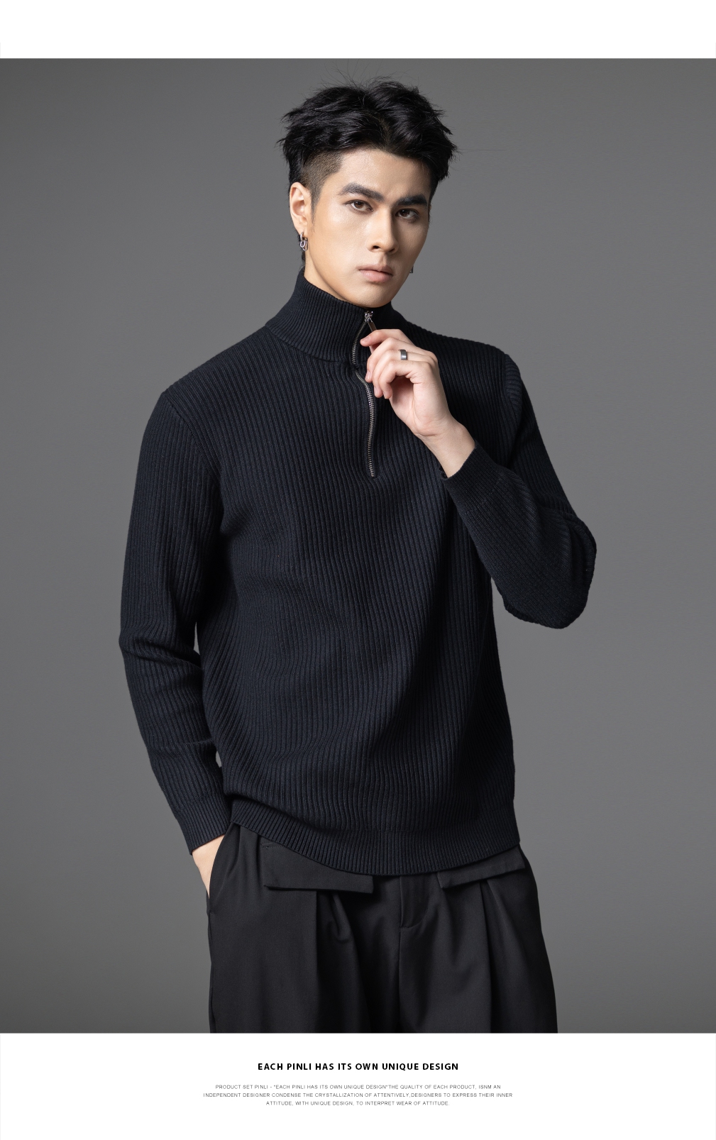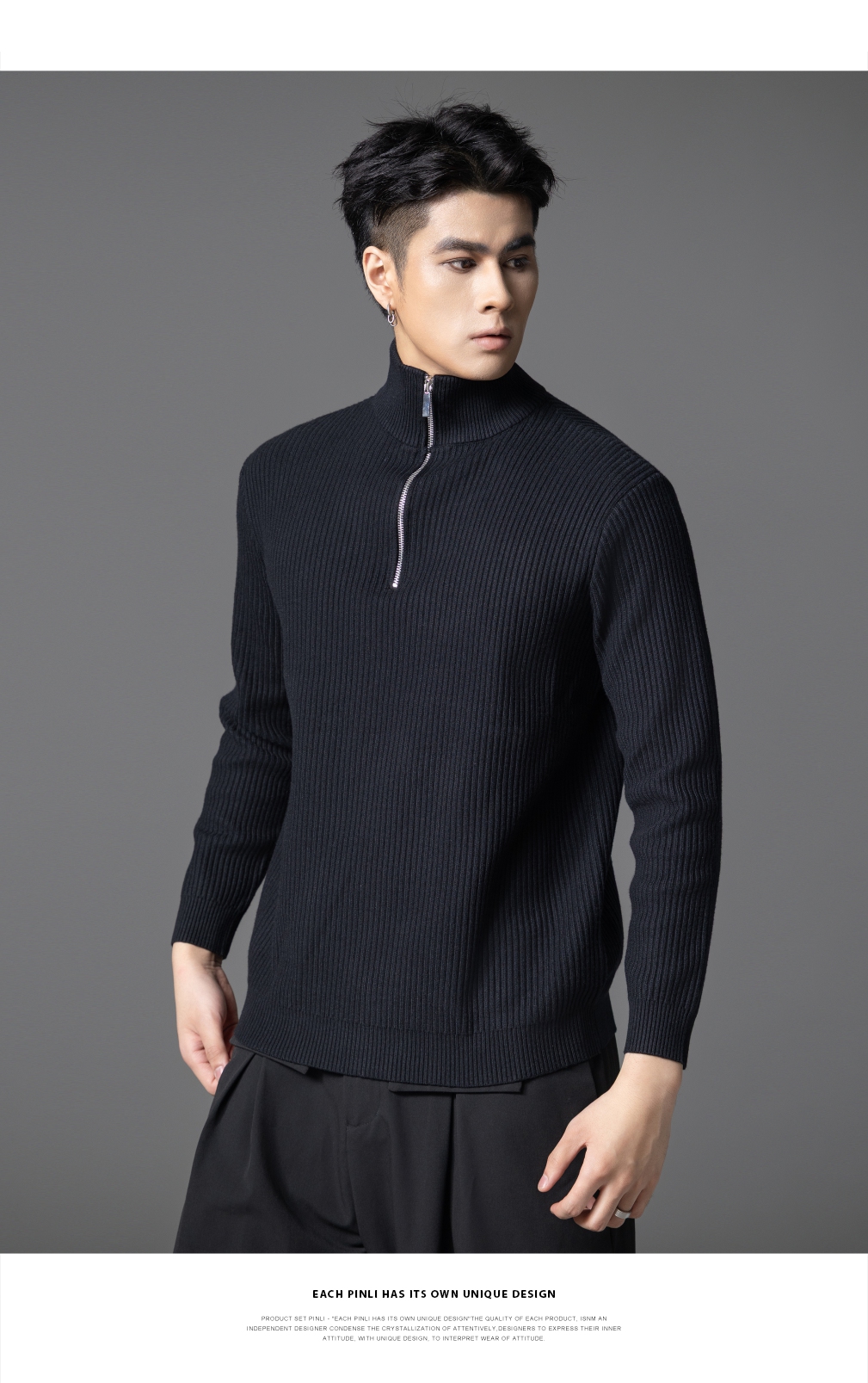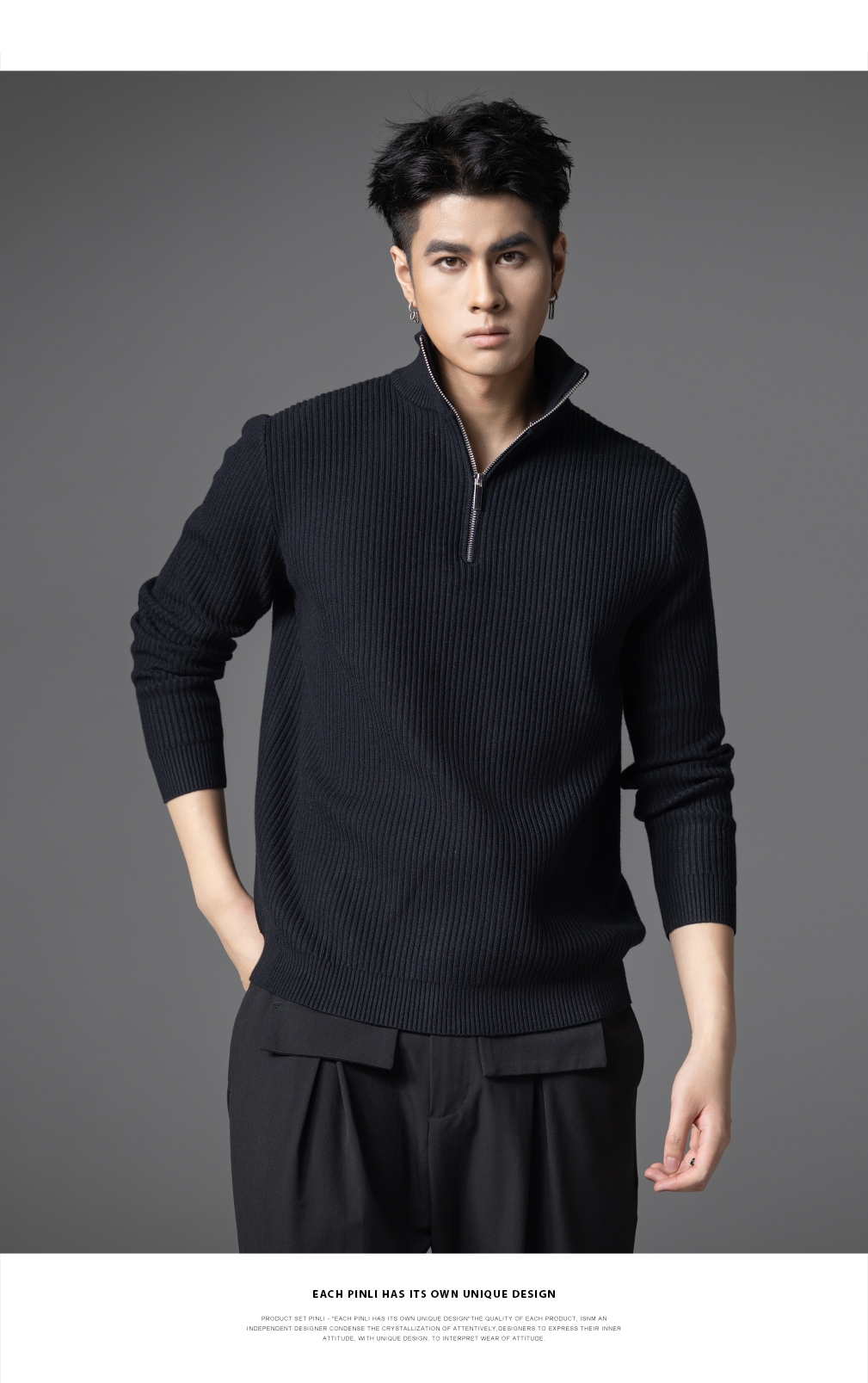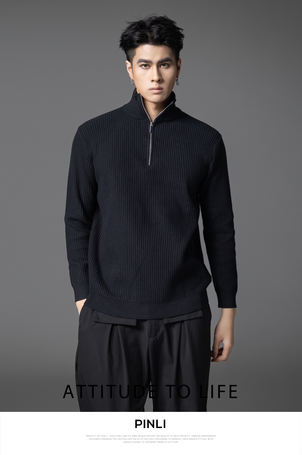 PINLI品立2025秋季新款男士拉链门襟高领条纹提花打底针织衫毛衣GD253110078