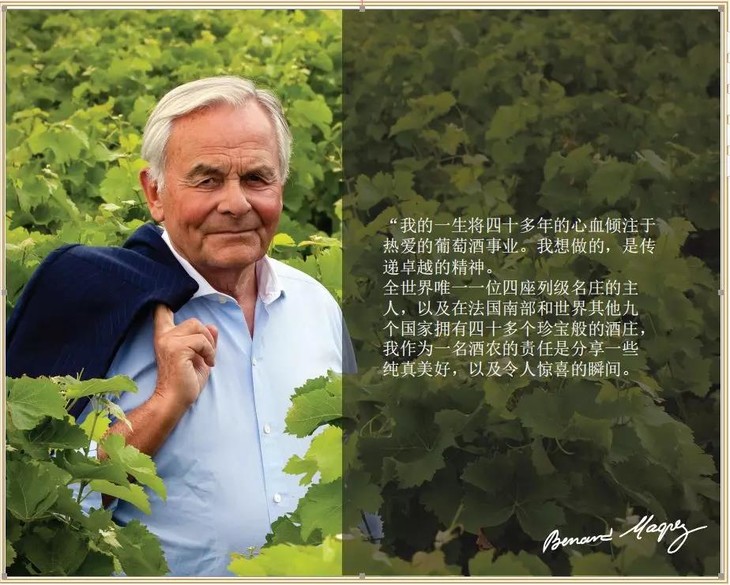 贝玛格雷(Bernard Magrez)这个名字在葡萄酒界有着举足轻重的地位。美国著名酒评家罗伯特·帕克(Robert Parker)曾称赞他为“波尔多极具前瞻性的先锋者”。他是现今葡萄酒业界内唯一一位拥有4家列级酒庄的庄主,在全球各地共有42座酒庄!