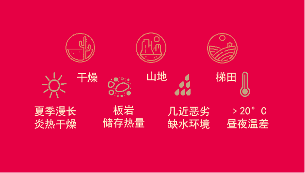 深厚的土层寒冷潮湿,葡萄根部必须穿过板岩的裂缝,向深处寻找水分,以在整个生长周期中为葡萄提供营养。近乎“恶劣”的缺水环境,让葡萄园单位产量极低,却保证了每串葡萄复杂浓郁的精华。白天的高温被凉爽的夜晚抵消,昼夜温差保正了葡萄不因炎热而失去爽脆的酸度,为最终的葡萄酒增添色彩!