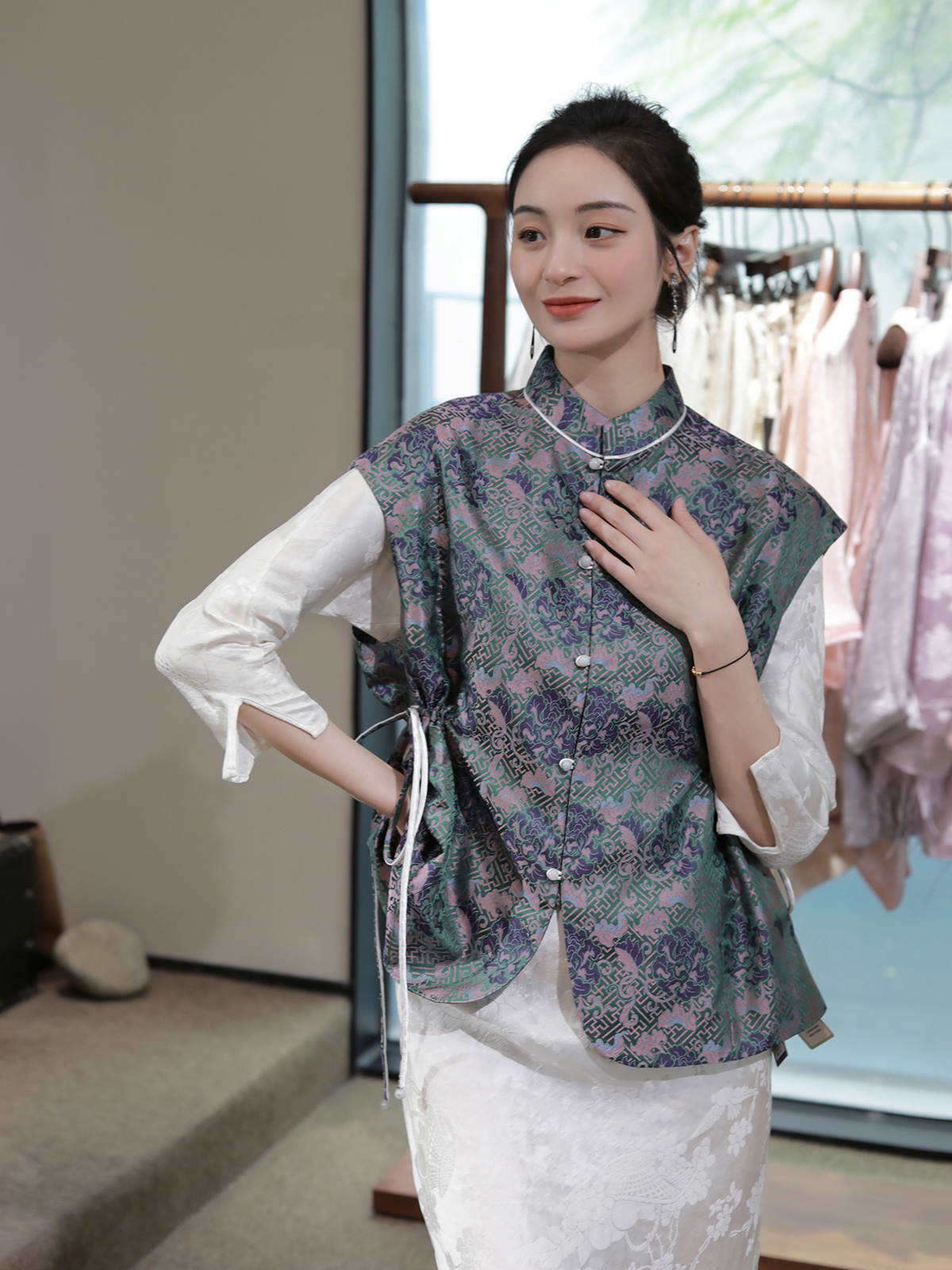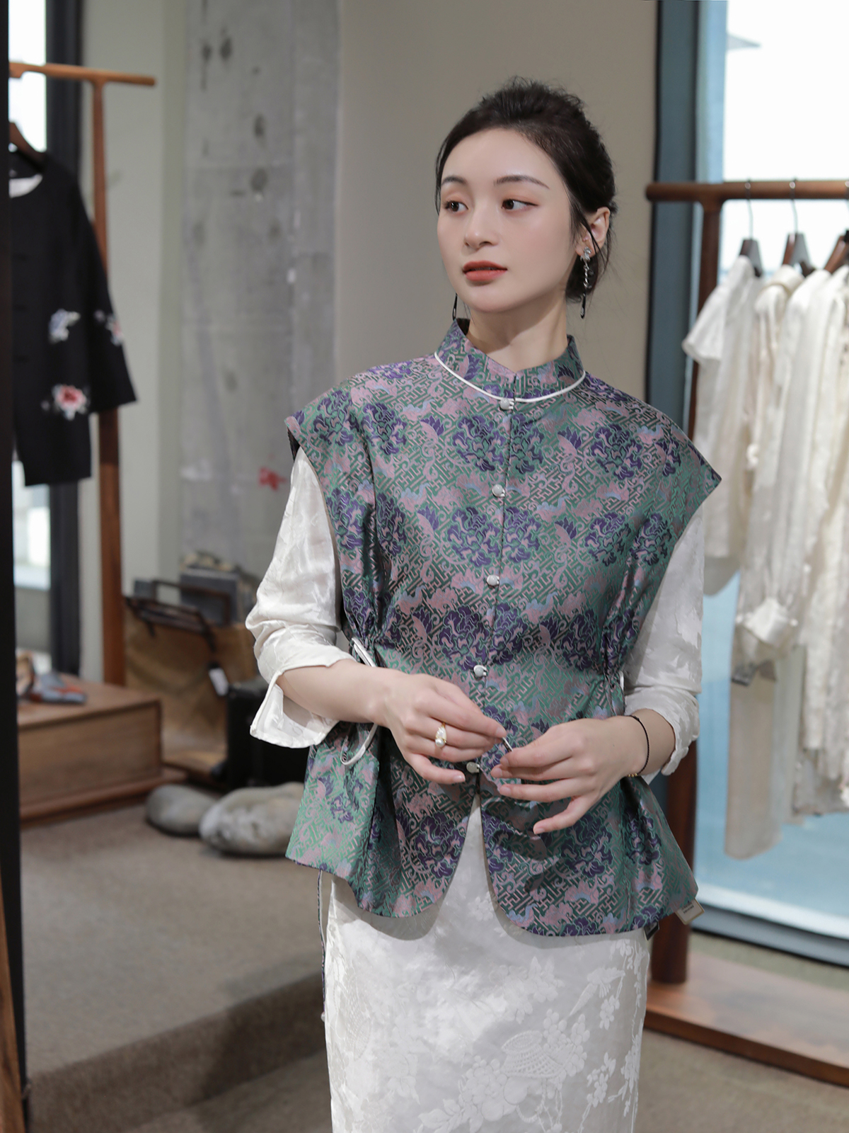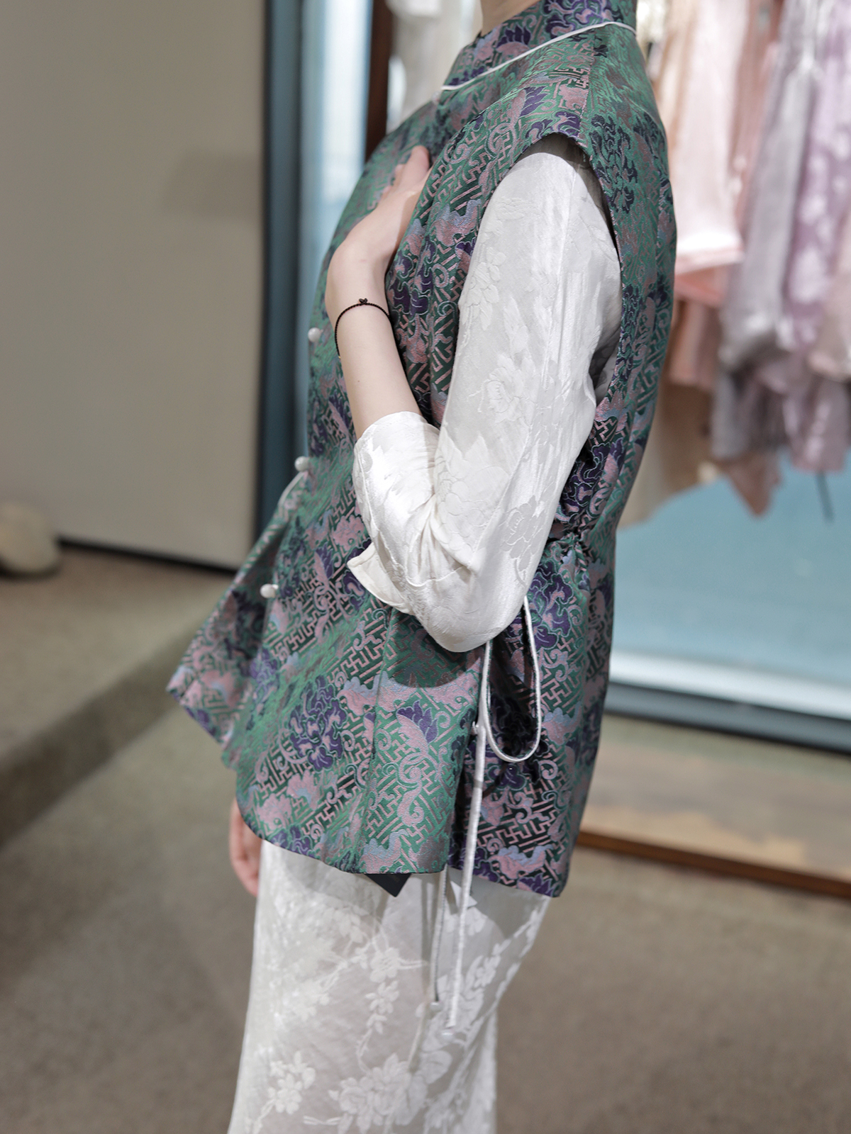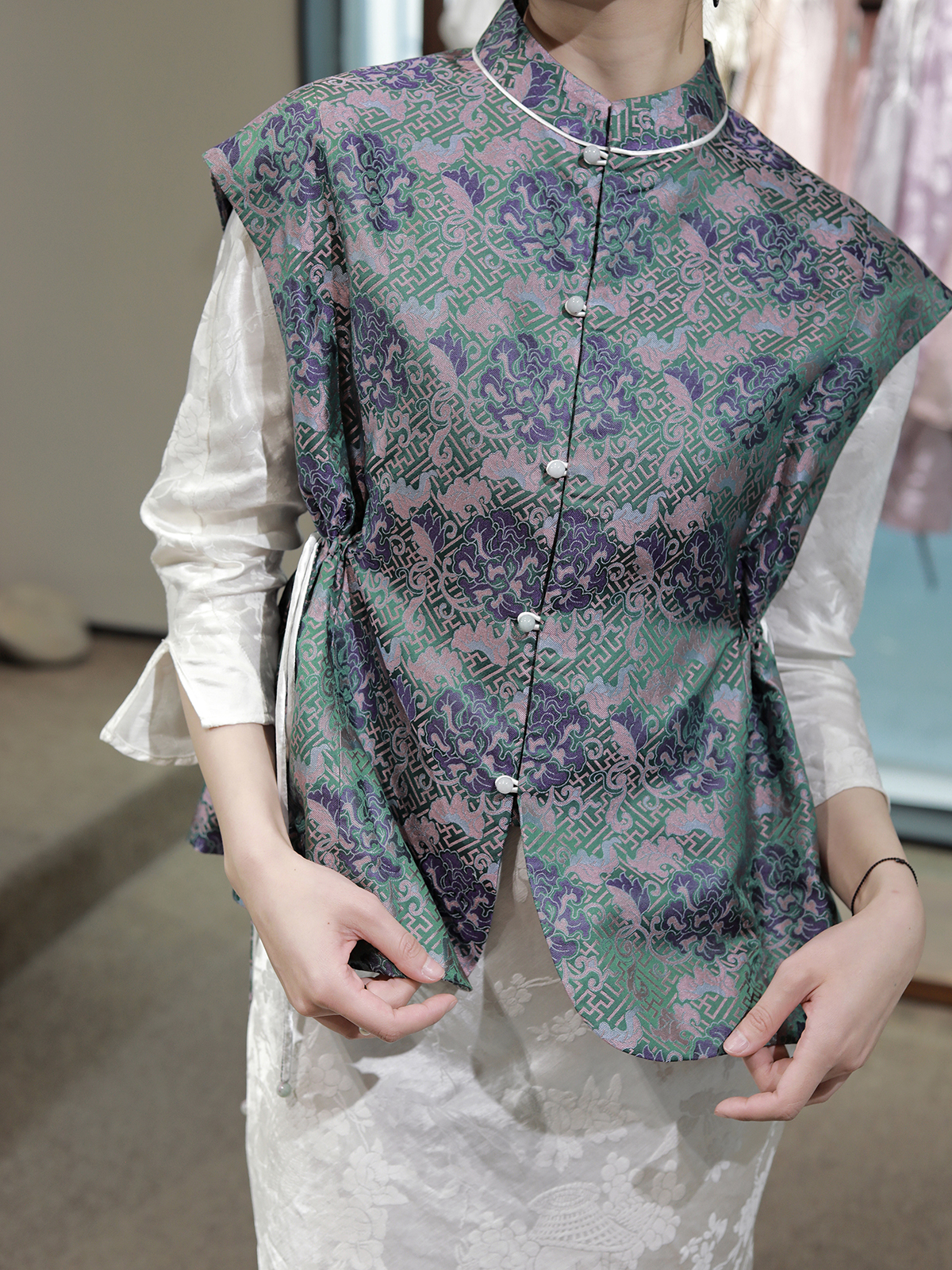 盛唐牡丹 |宋锦万寿无疆牡丹纹对襟马甲