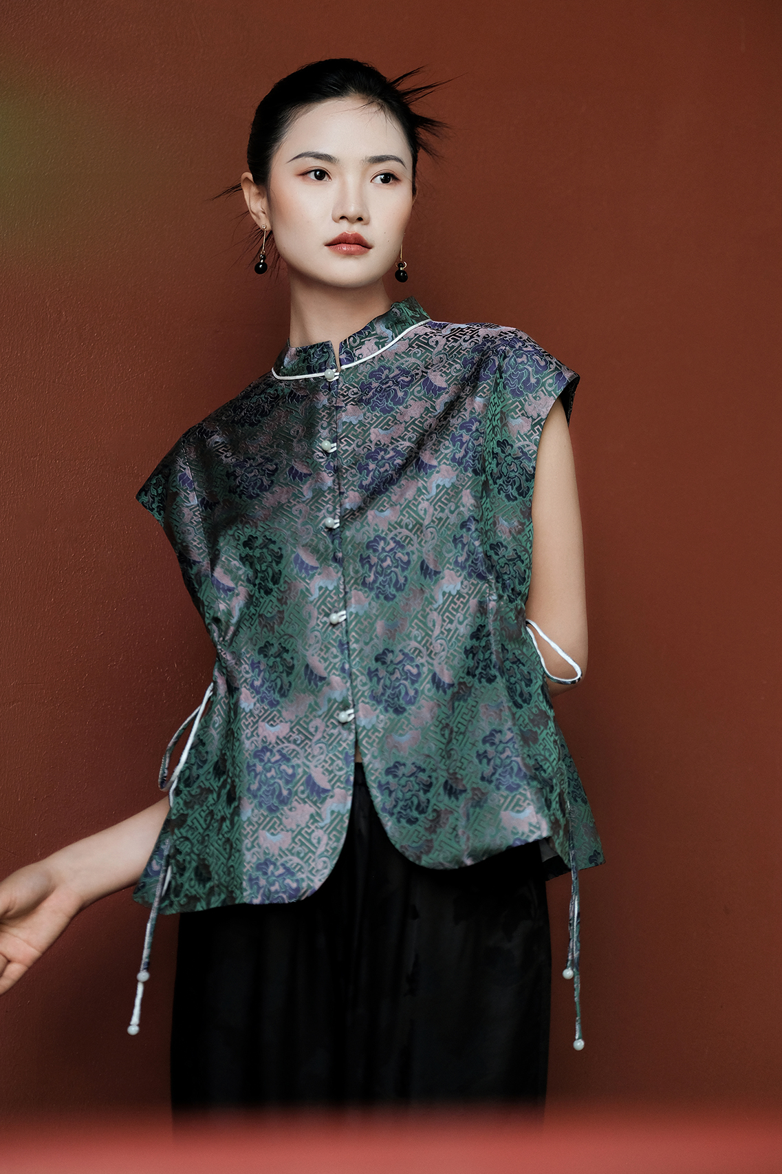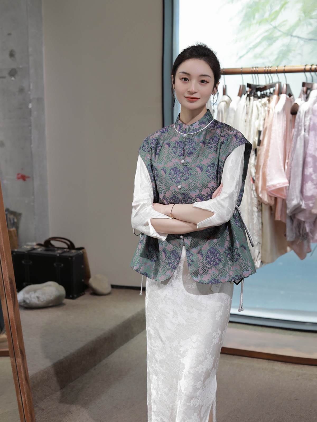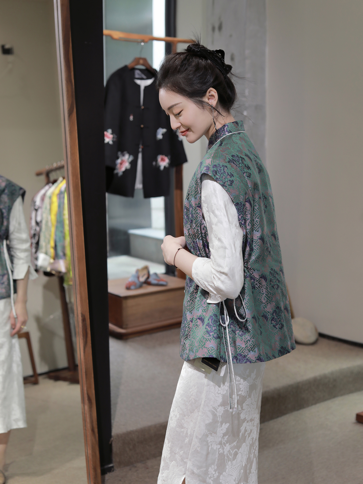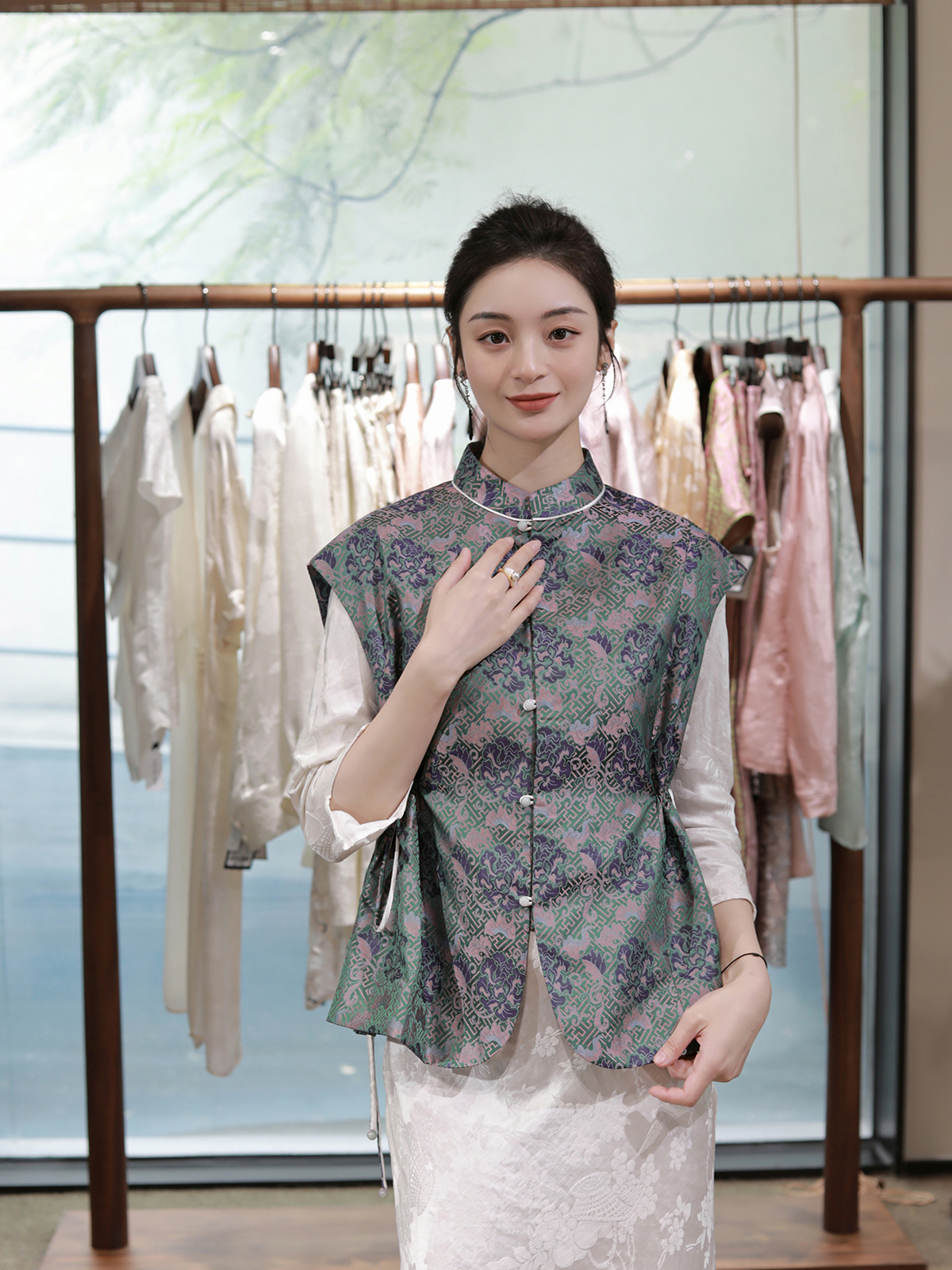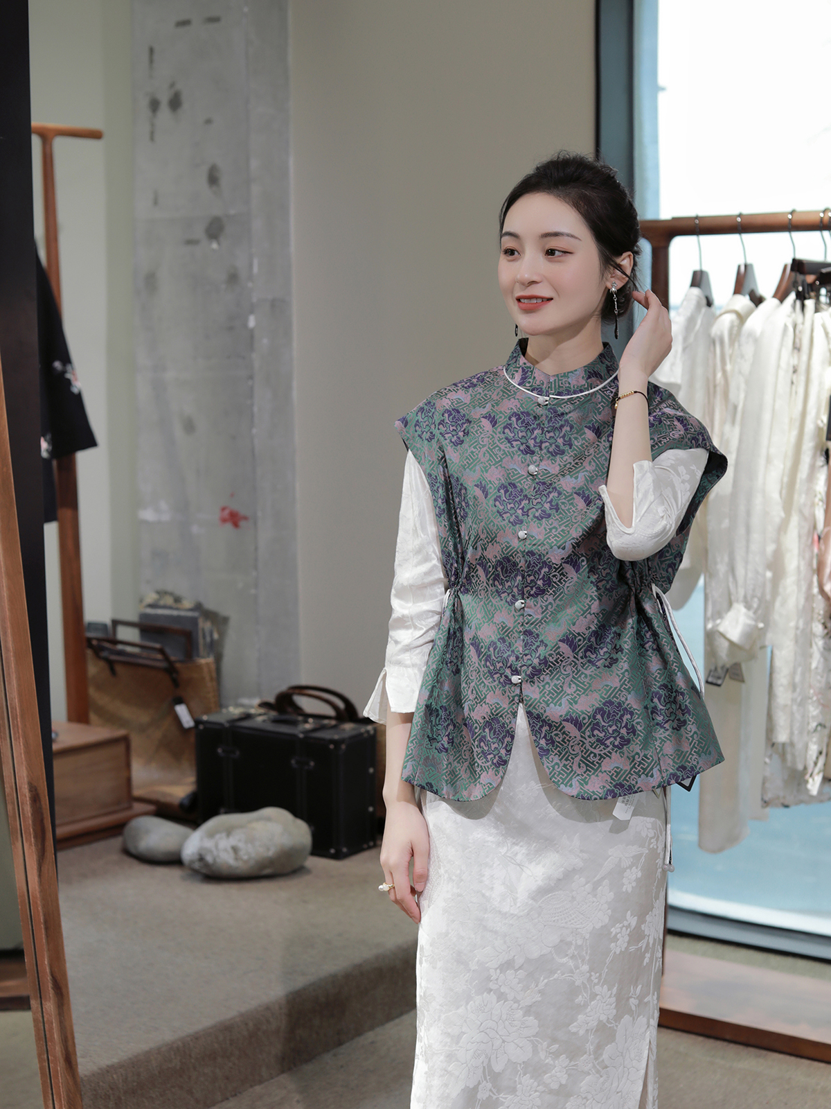 盛唐牡丹 |宋锦万寿无疆牡丹纹对襟马甲