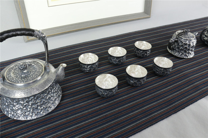 此系列由提梁壶、小持壶、公道杯与6只茶杯组成,纹饰为精美陨石纹,独特的防氧化做旧工艺,古朴中展现奢华气质,精湛工艺与美学设计完美结合,是一套极具收藏价值的手工银器佳作。