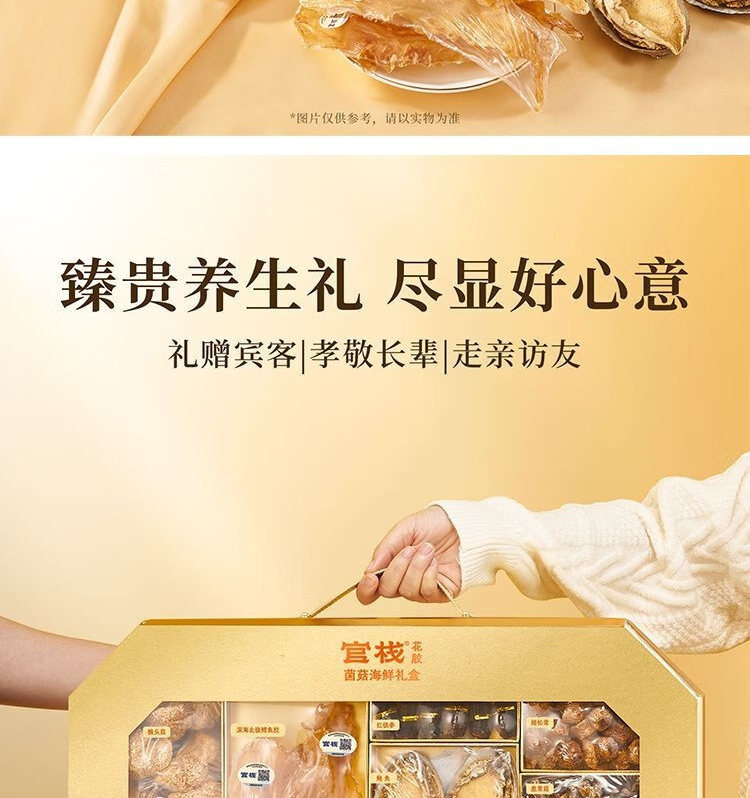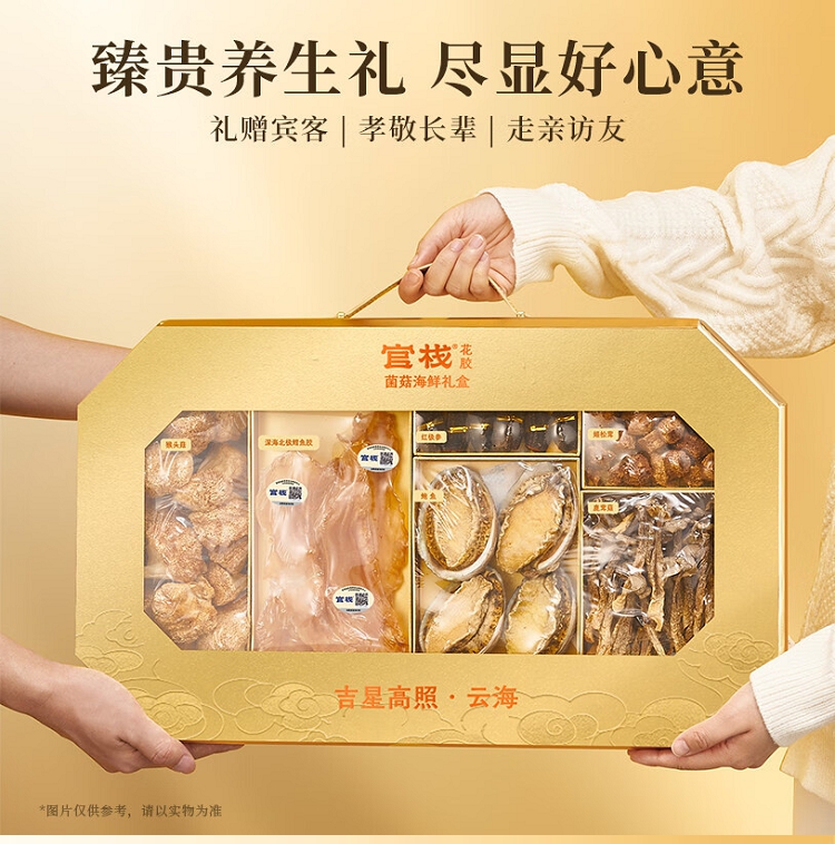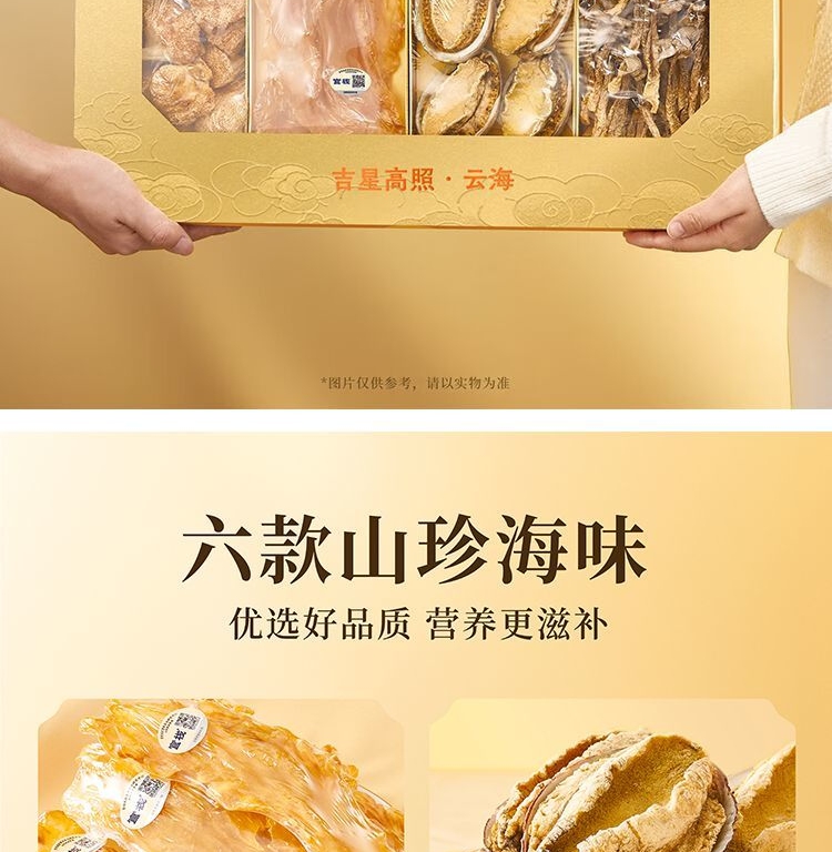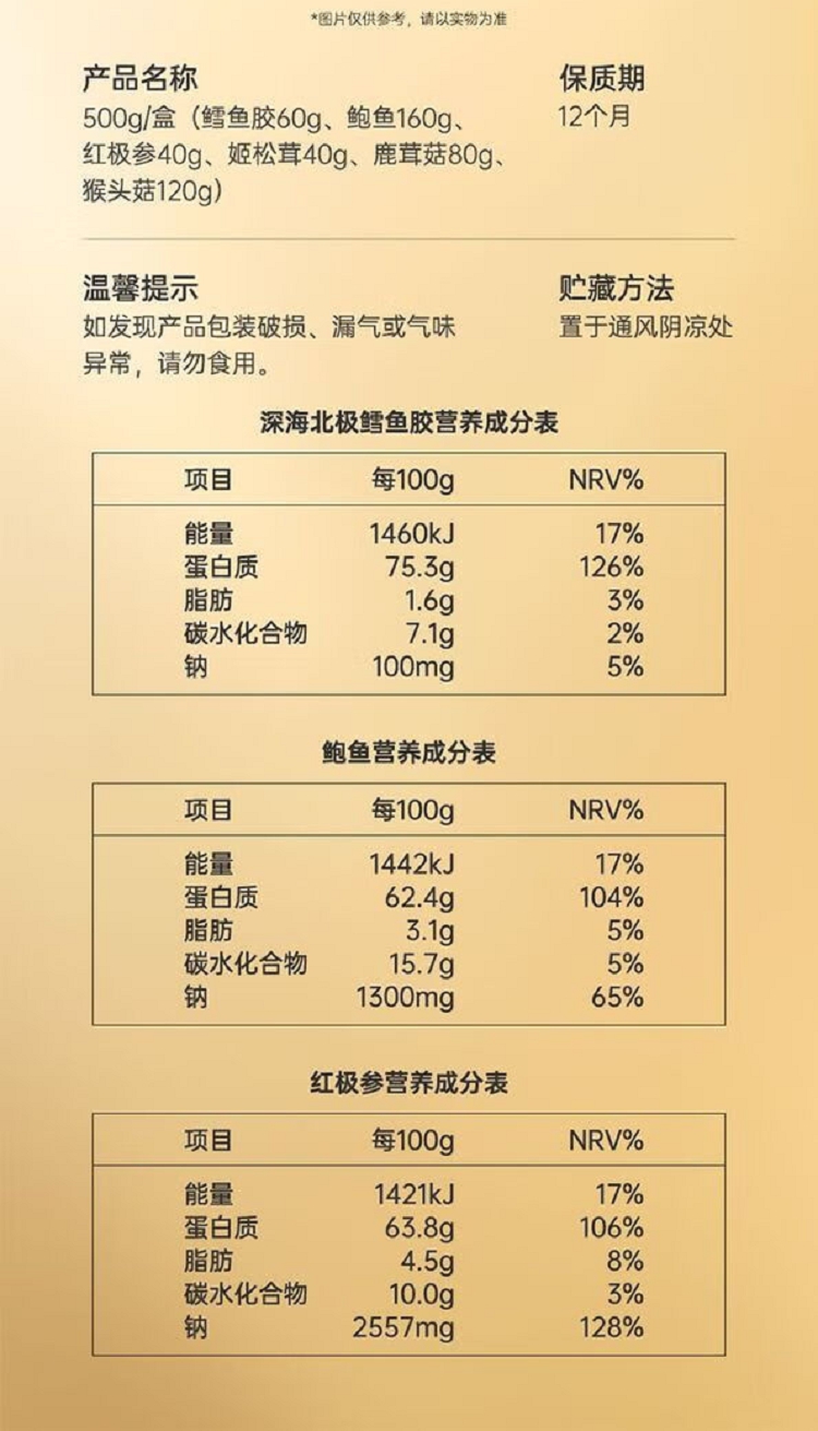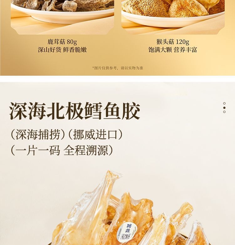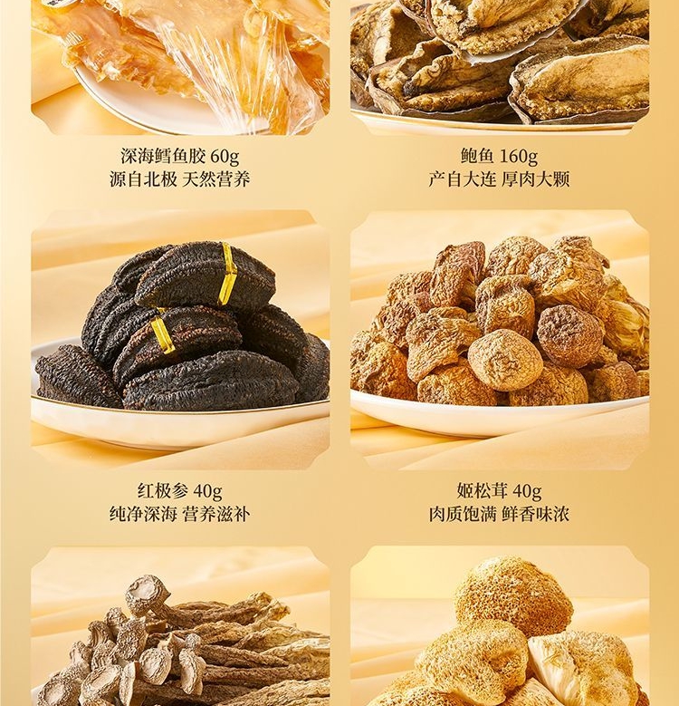 (35头鳕鱼胶60g+鲍鱼160g+红极参40g+姬松茸40g+鹿茸菇80g+猴头菇120g)