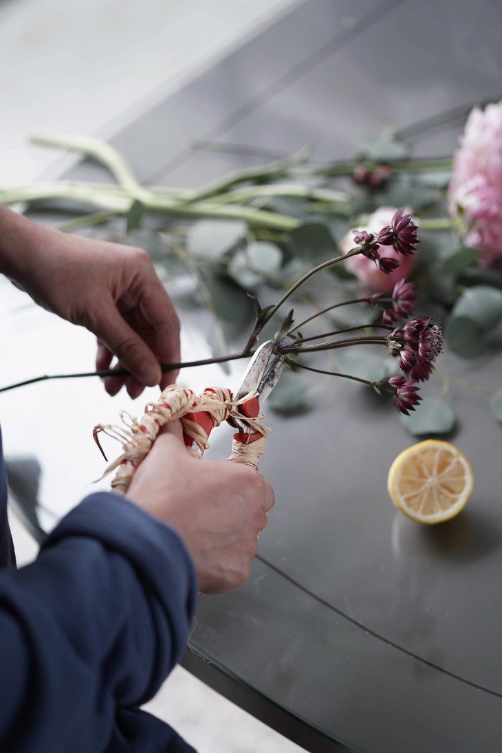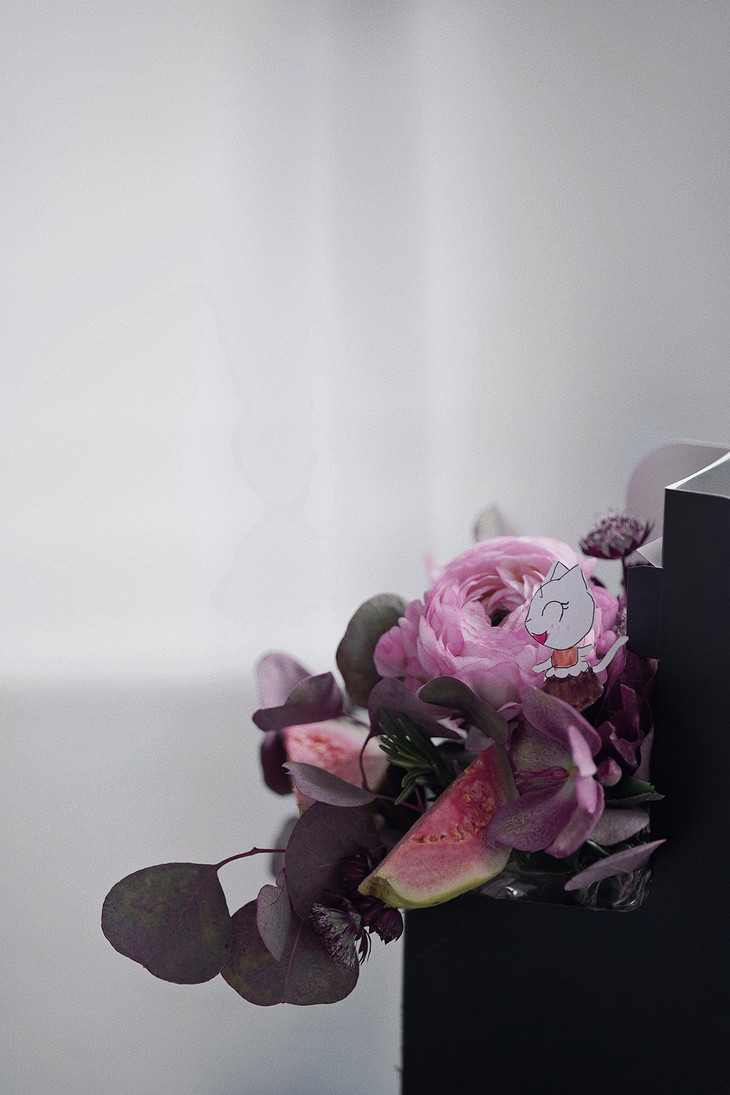【花材主角是两种水果:柠檬和番石榴。这也是常见的两种咖啡中的风味,你可能在浅烘焙的埃塞俄比亚咖啡中感受到过。铁筷子、蝴蝶花毛茛、锦鲤毛茛、圆叶尤加利、迷迭香、这些春季的花材作为配角,与它们共同出现。】