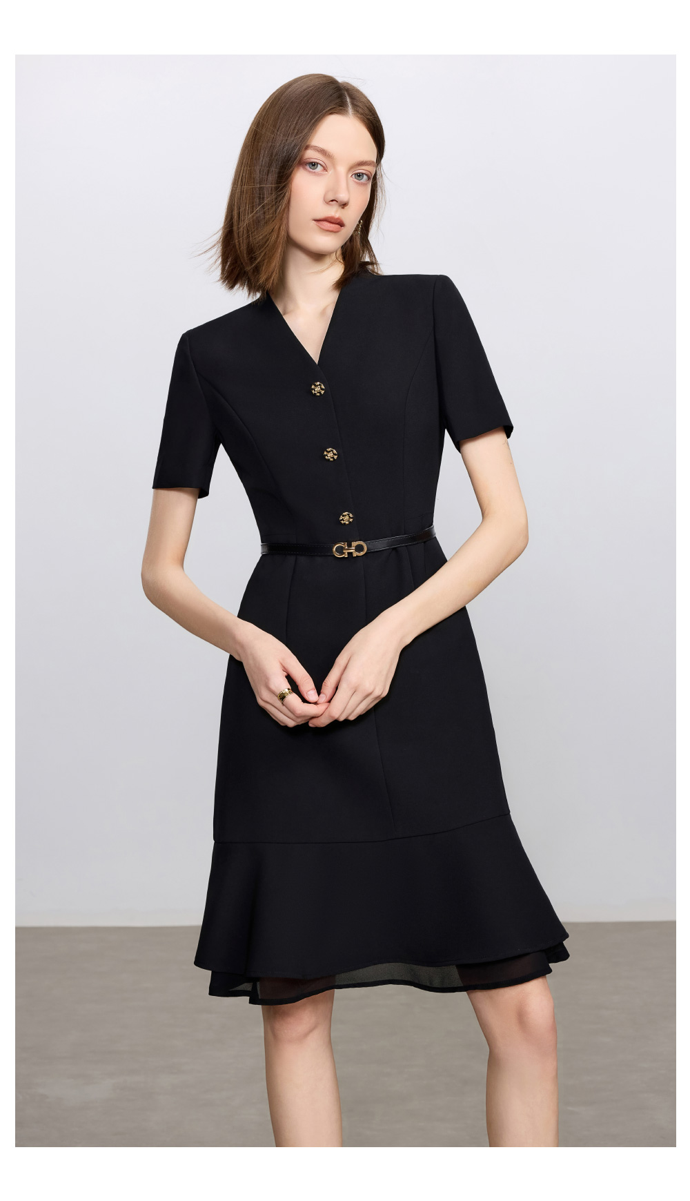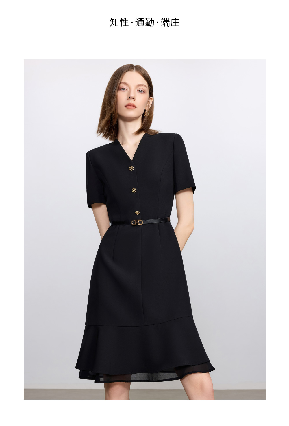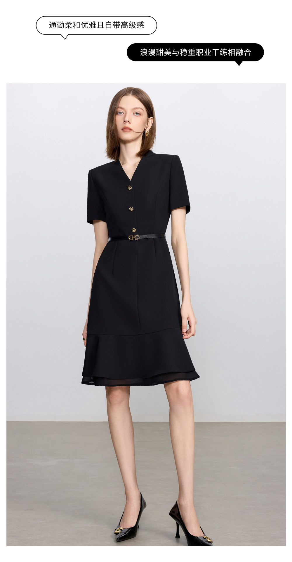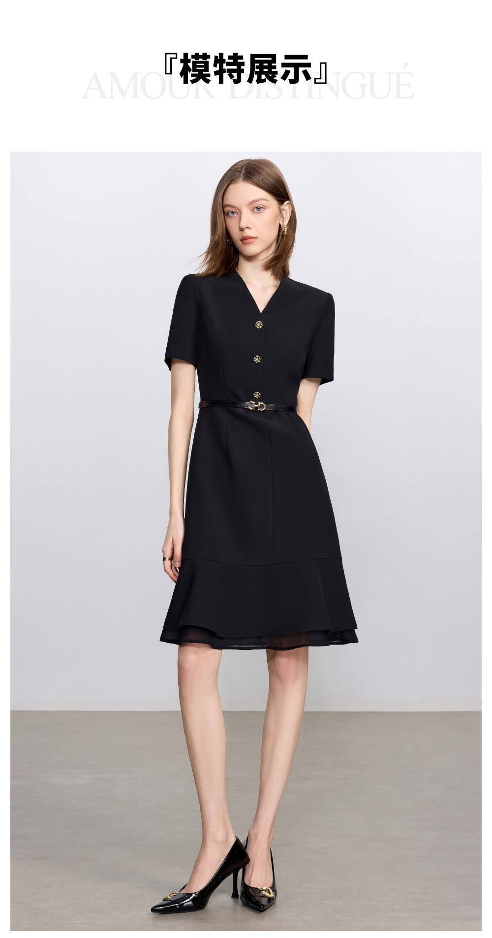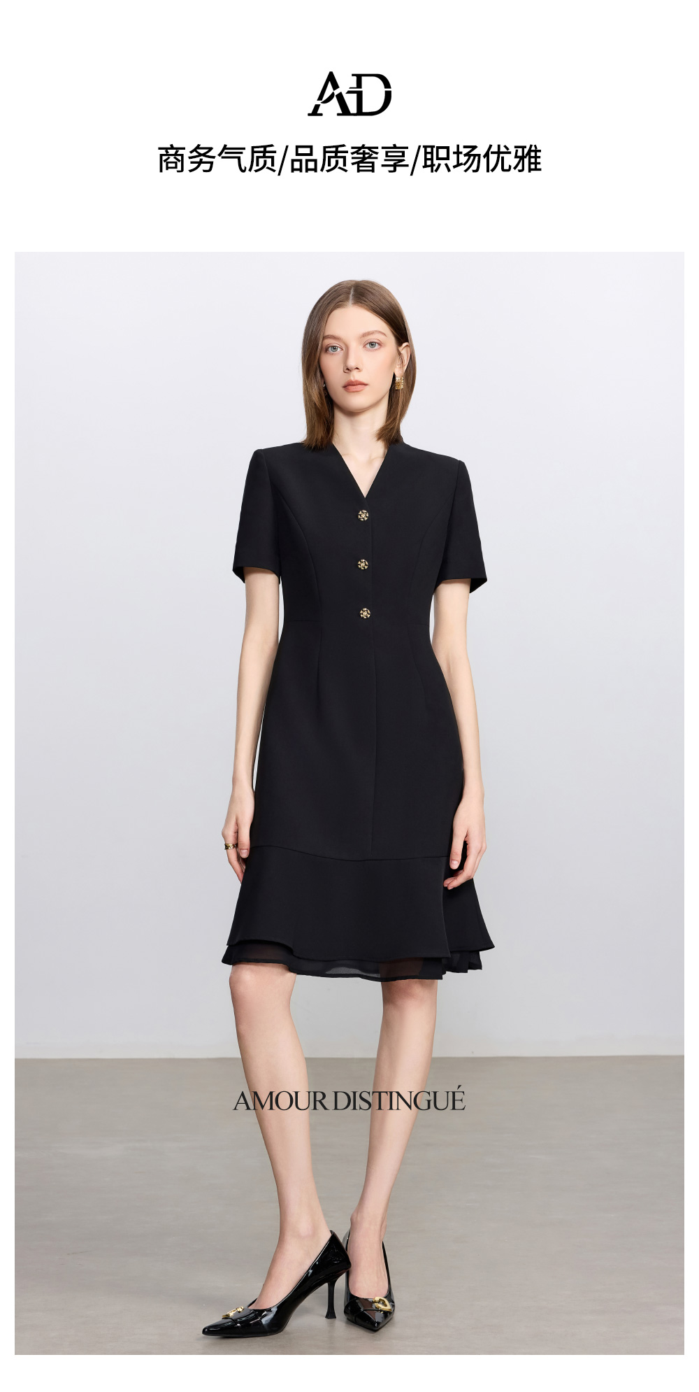 AD职业连衣裙女新款气质时尚V领连身裙2025高级感双层纱鱼尾裙夏