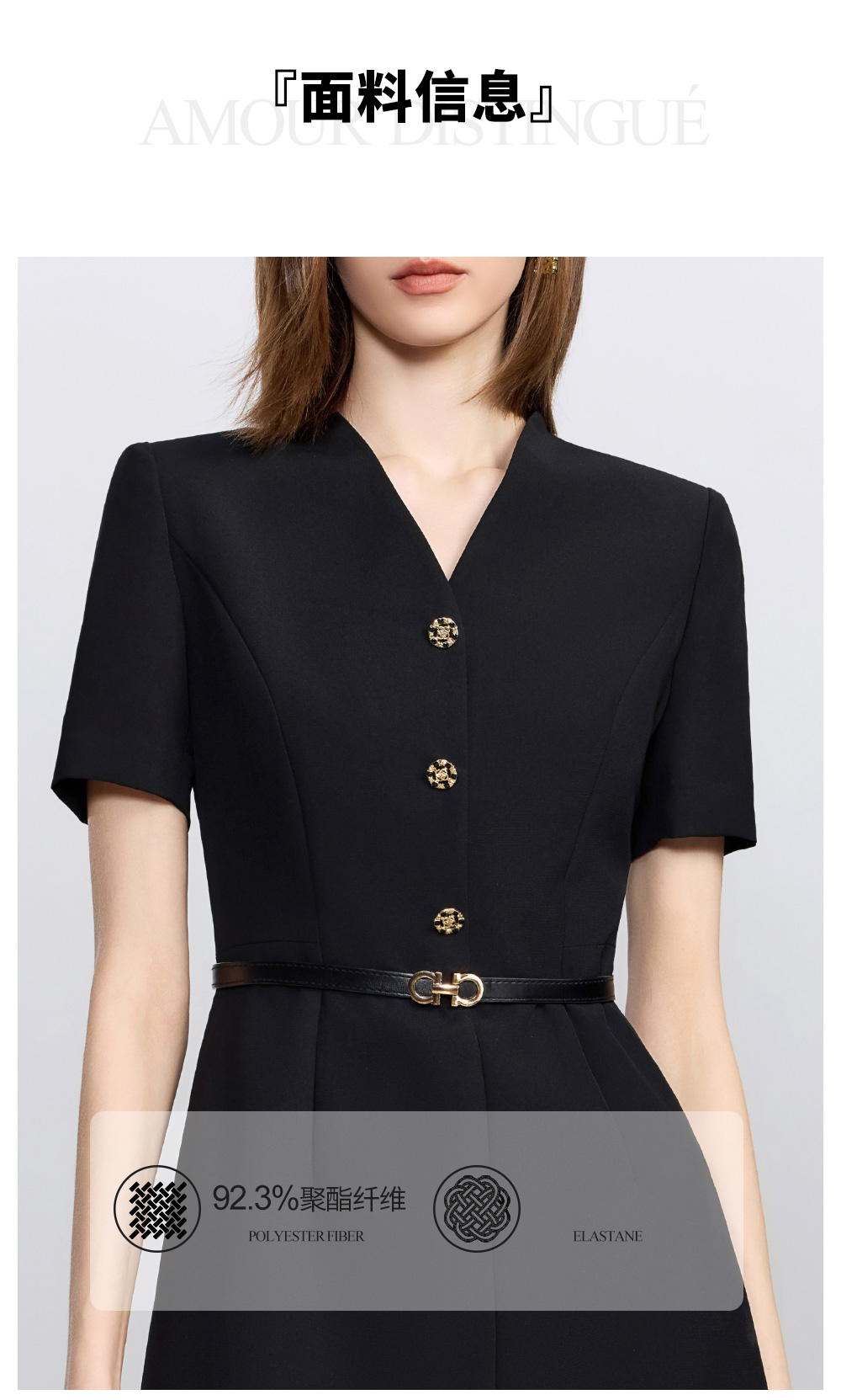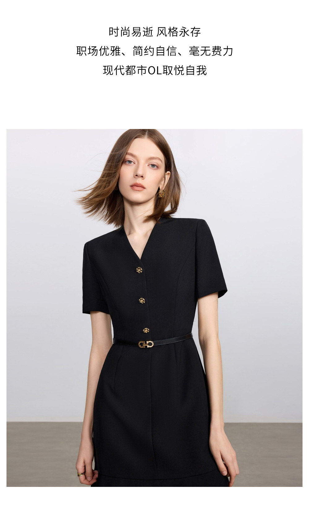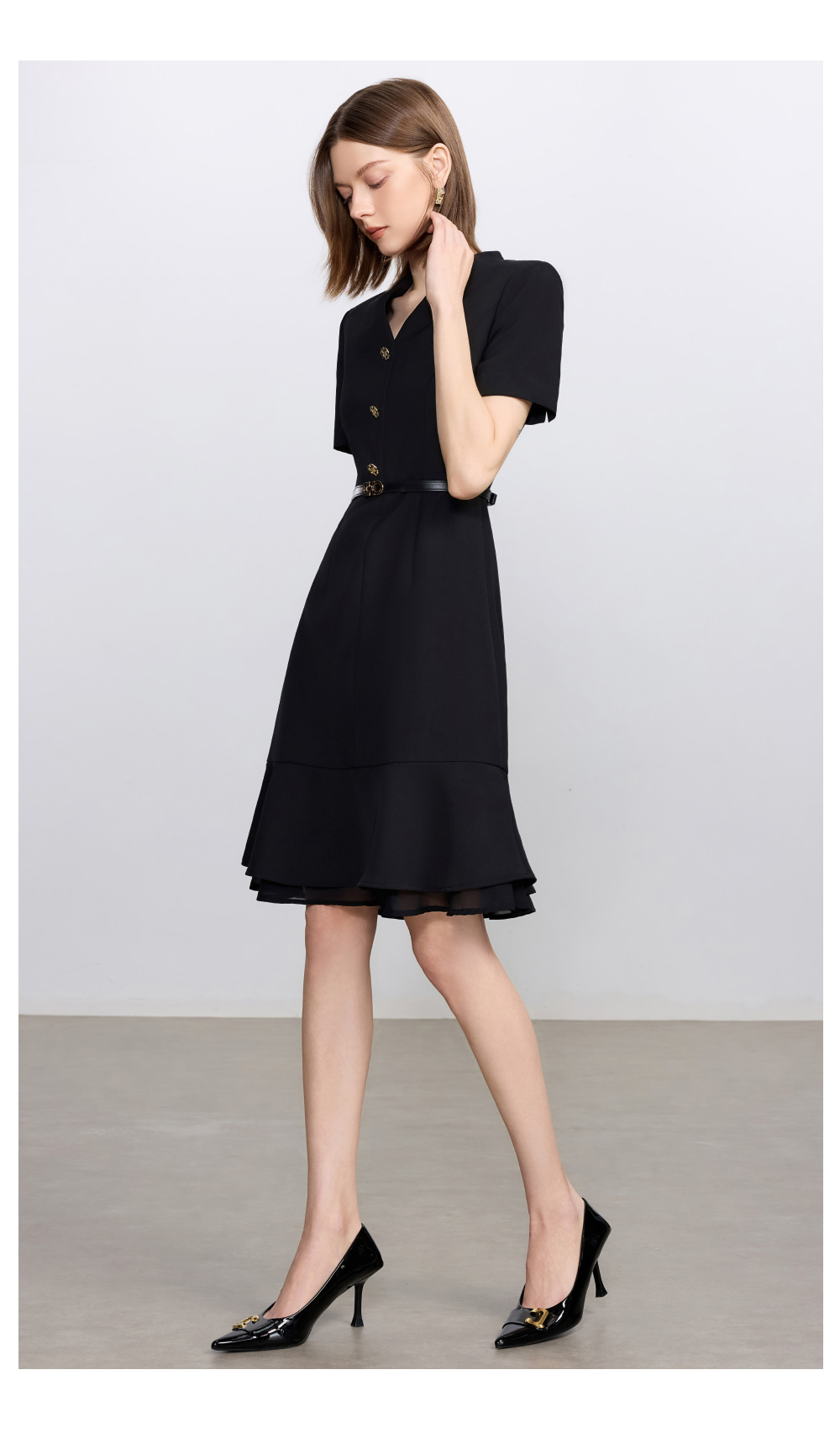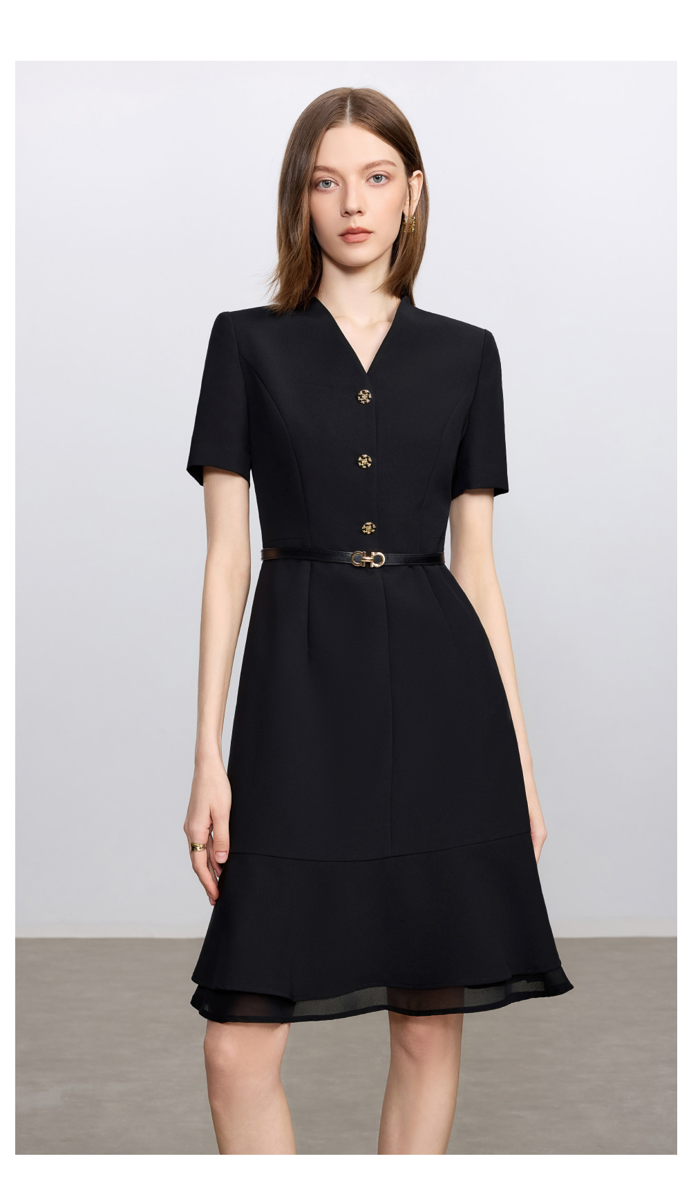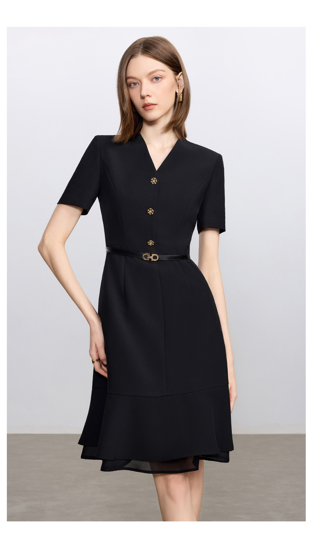 AD职业连衣裙女新款气质时尚V领连身裙2025高级感双层纱鱼尾裙夏