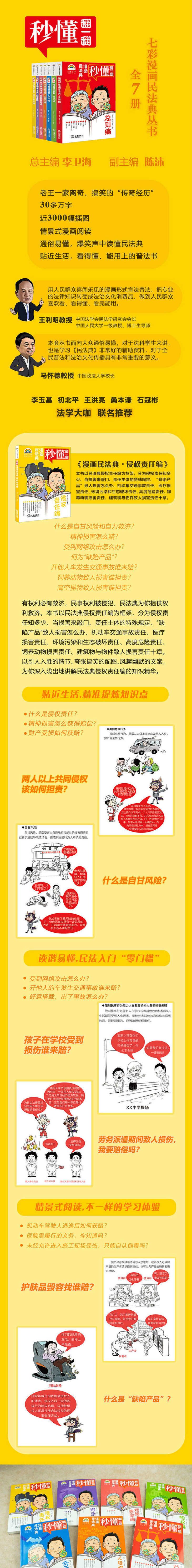 本书是“七彩漫画民法典丛书”系列之一,以民法典侵权责任编为框架,分为侵权责任知多少、当损害来敲门,怎么办、责任主体的特殊规定,你知道吗、“缺陷产品”致人损害怎么办、机动车交通事故责任、发生医疗损害怎么办、环境污染和生态破坏责任、高度危险责任怎样担责、饲养动物损害责任、建筑物与物件致人损害谁担责十个章节。本书以漫画形式对民法典侵权责任编重点法律知识、法条规定进行讲解剖析。用图文并茂的形式,把法律知识详细解读,所配插图不但生动形象,还融入时尚元素,风趣幽默,在辅助理解的基础上,大大增强了可读性,真正做到了人民*众喜欢看、看得懂、看完能用,切实增强了普法工作的针对性和实效性,从而达到了不断提升全体公民法治意识和法治素养的目的。
