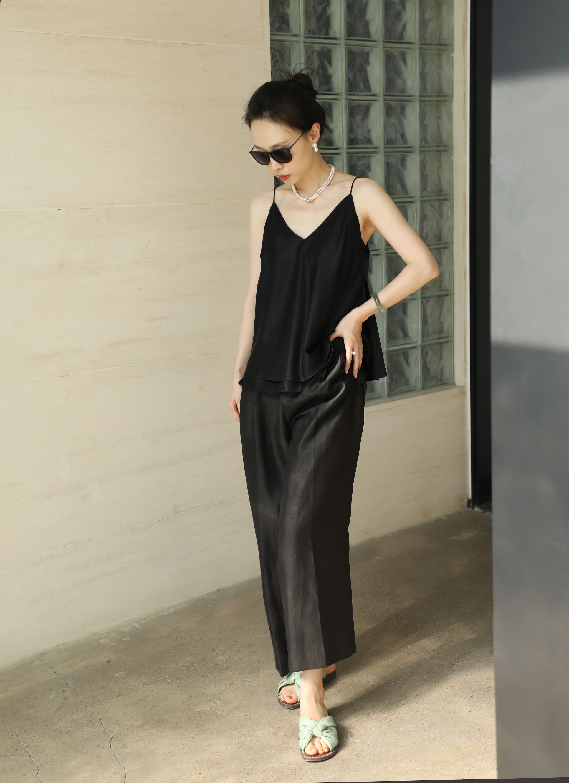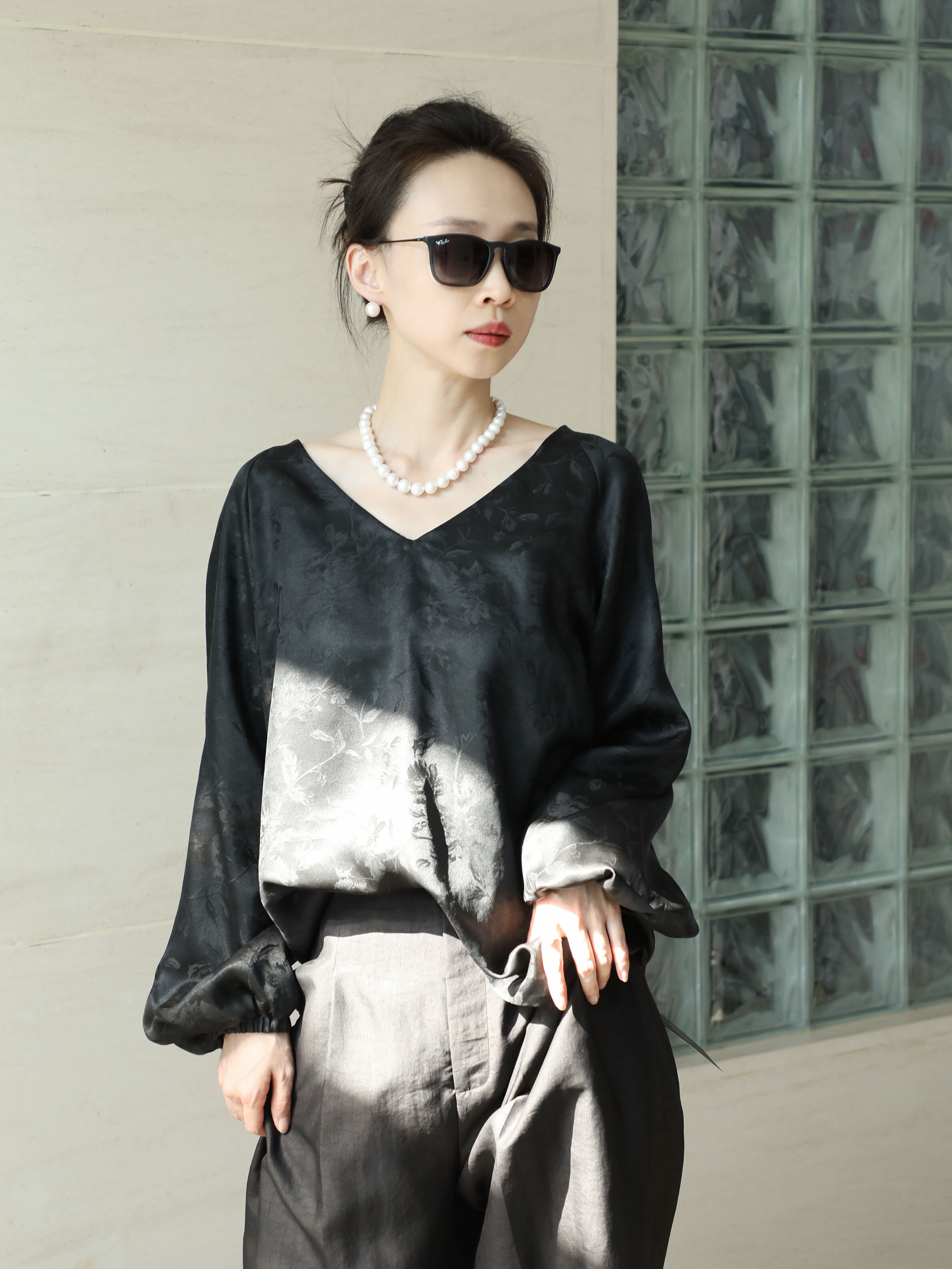 盛唐婧 |桑蚕丝重缎折枝玫瑰花直筒裤-黑色