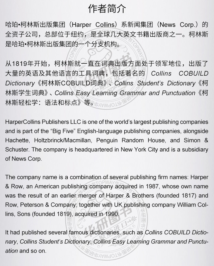 哈珀·柯林斯出版集团(Harper Collins)系新闻集团(News Corp.)的全资子公司,总部位于纽约,是全球几大英文书籍出版商之一。柯林斯是哈珀·柯林斯出版集团的一个分支机构。从1819年开始,柯林斯就一直在词典出版方面处于领军地位,出版了大量的英语及其他语言的工具词典,包括著名的Collins COBUILD Dictionary《柯林斯COBUILD词典》、Collins Student’s Dictionary《柯林斯学生词典》、Collins Easy Learning Grammar and Punctuation《柯林斯轻松学:语法和标点》等。