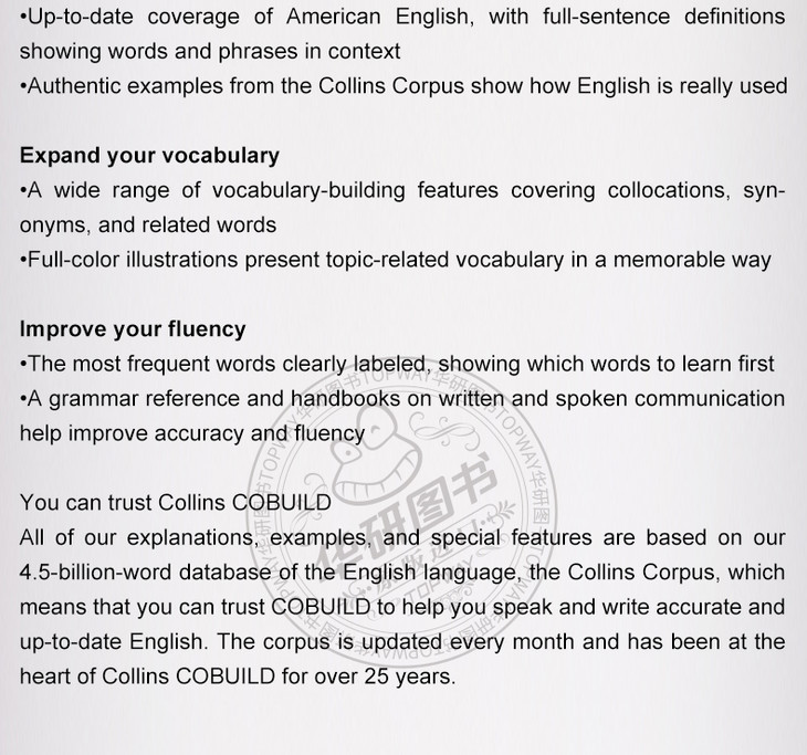 All of our explanations, examples, and special features are based on our 4.5-billion-word database of the English language, the Collins Corpus, which means that you can trust COBUILD to help you speak and write accurate and up-to-date English. The corpus is updated every month and has been at the heart of Collins COBUILD for over 25 years.