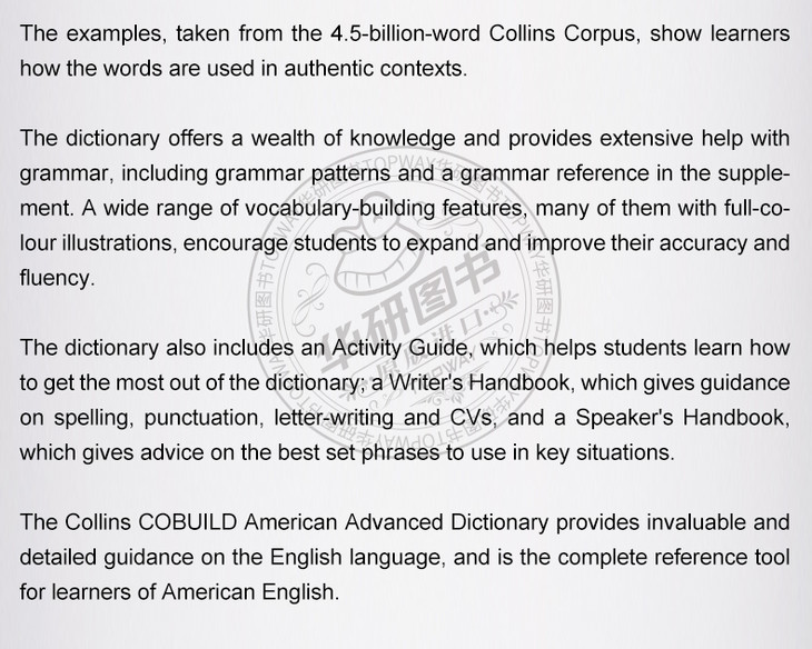 Collins COBUILD Advanced American English Dictionary《柯林斯高阶美语词典》是英语学习词典界先锋Harper Collins推出的一本专注于美式英语的英英词典。本词典承袭柯林斯特有的整句释义法,帮助美语使用者和有志于去美国留学的读者扩大词汇量,提高口语及写作能力,增强使用英语的自信心。本书虽说书名为“高阶词典”,但其实也非常适合中级和入门的英语学习者使用。