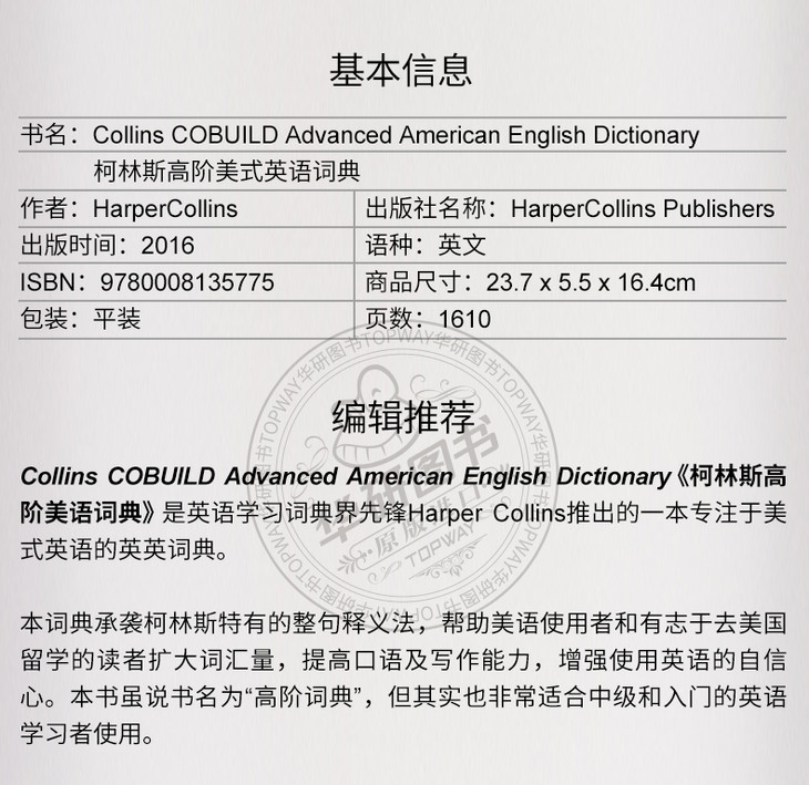书名:Collins COBUILD Advanced American English Dictionary柯林斯高阶美式英语词典