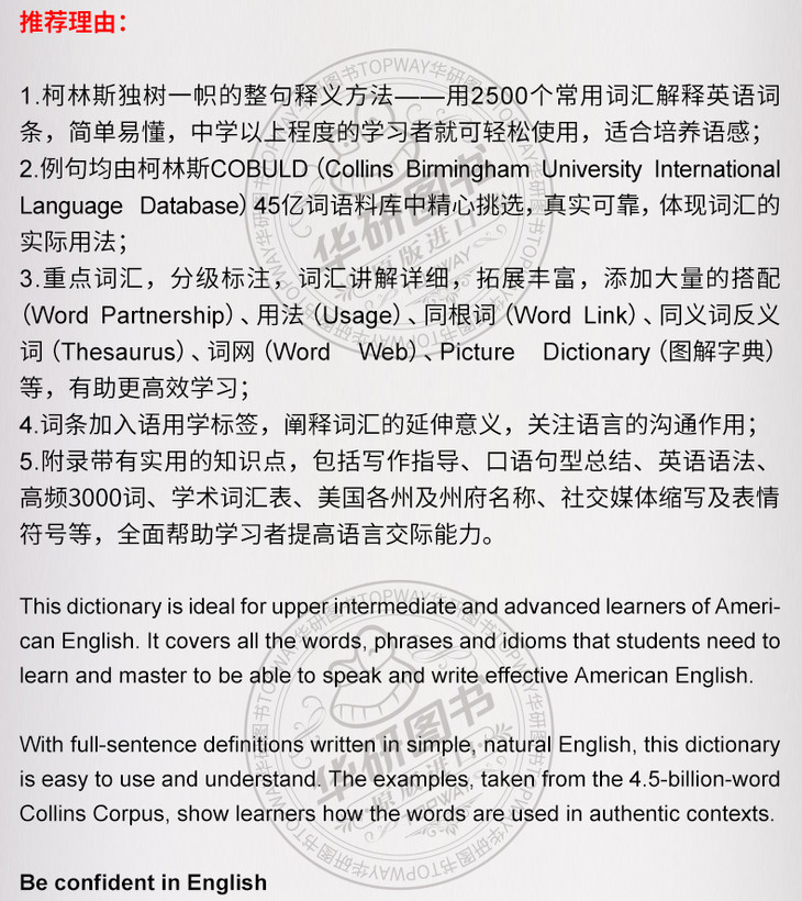 1.柯林斯独树一帜的整句释义方法 ——用2500个常用词汇解释英语词条,简单易懂,中学以上程度的学习者就可轻松使用,适合培养语感;