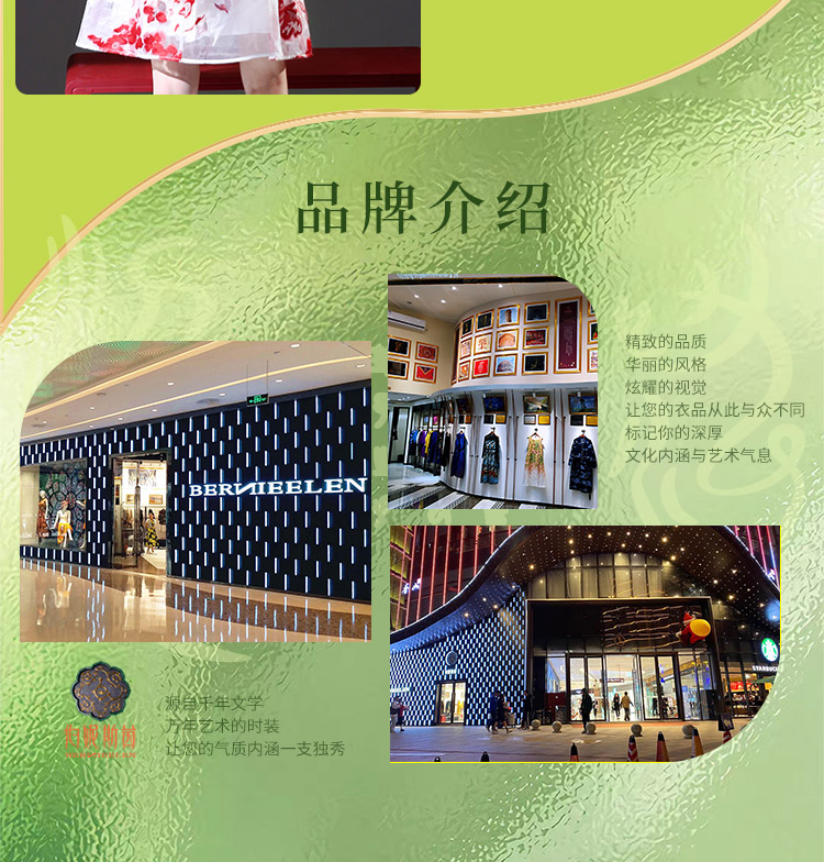 行业首家从事文创研发的女装品牌-伯妮斯茵 品牌风格:源自千年文学和万年艺术的时装,让你的气质内涵一枝独秀,精彩的品质,华丽的风格,炫耀的视觉,让你的衣品从此与众不同,标记你深厚的文化内涵与艺术气息。