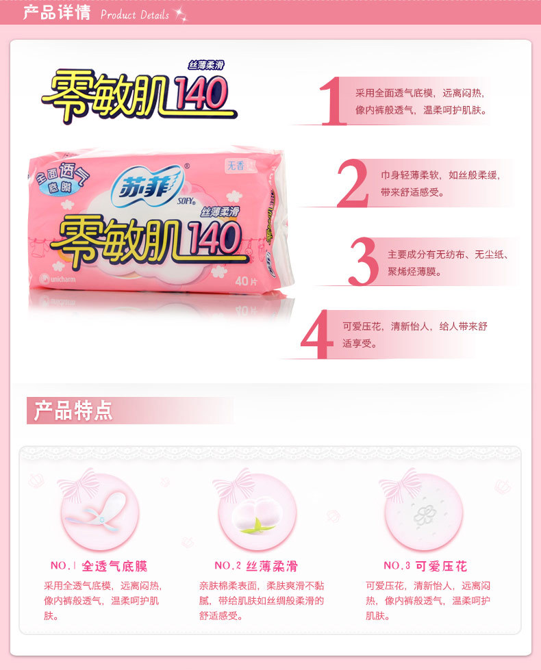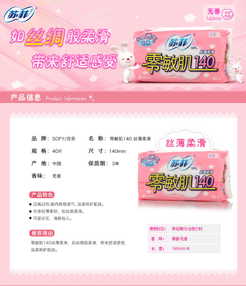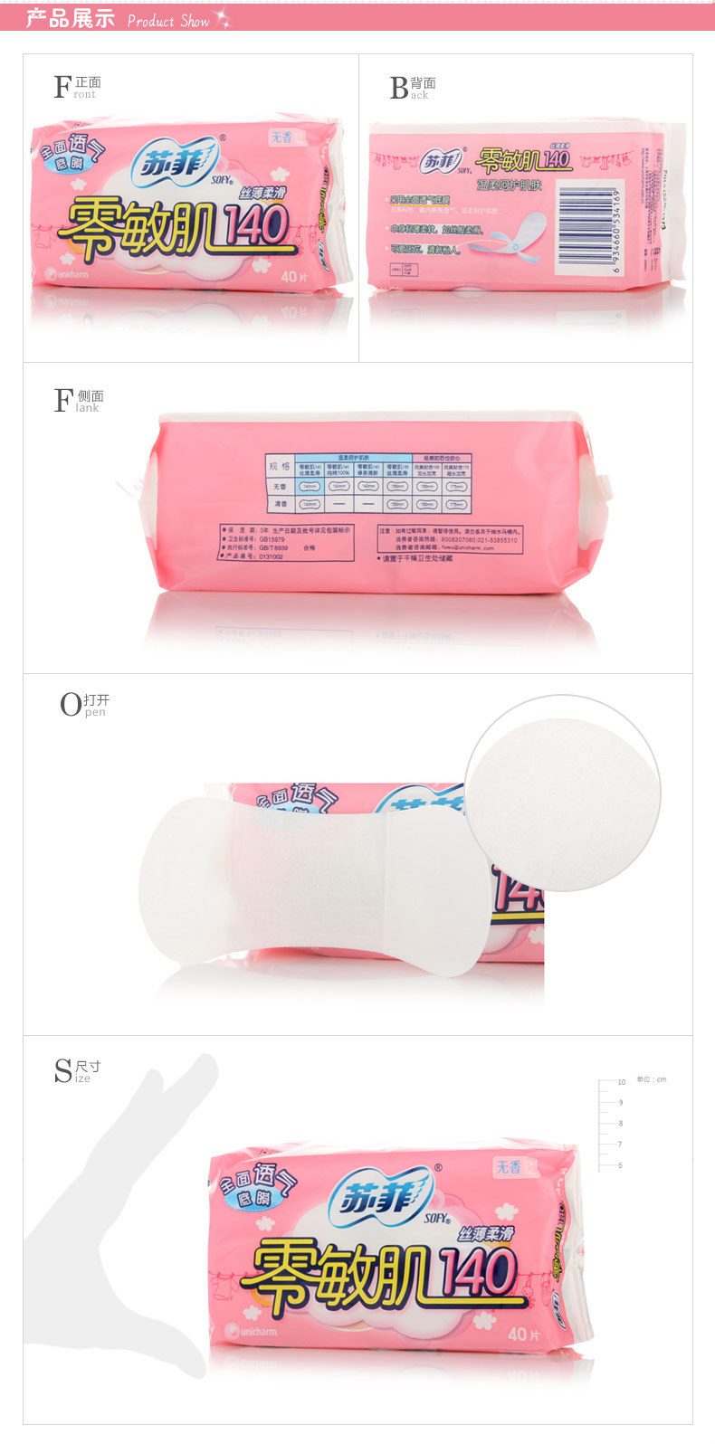 苏菲护垫140mm*40片零敏肌丝薄柔滑无香护垫超薄透气亲肤零感姨妈巾