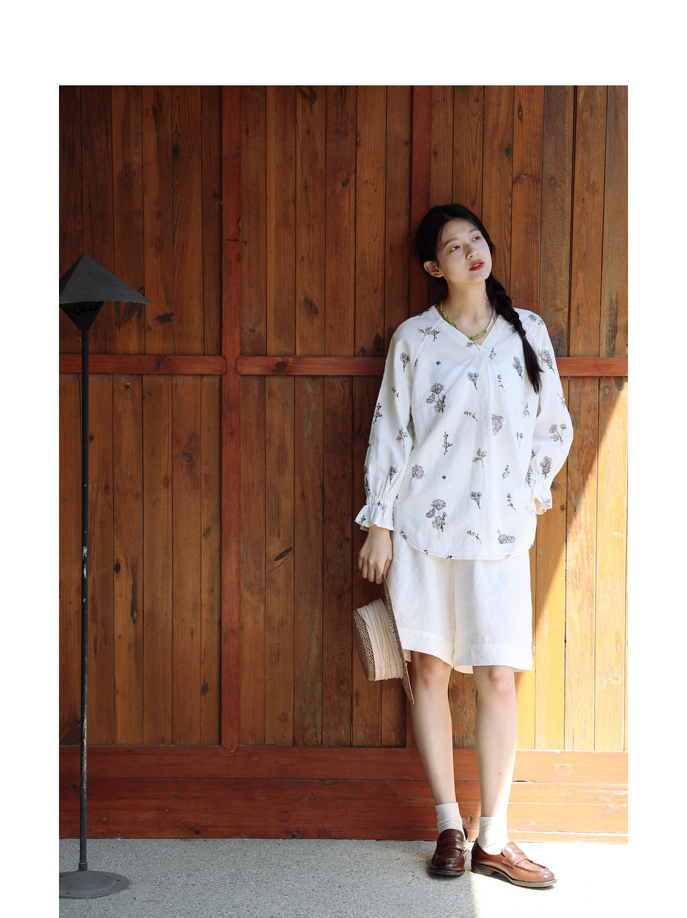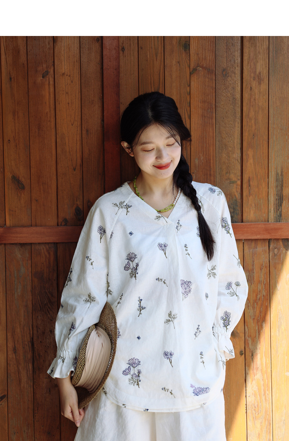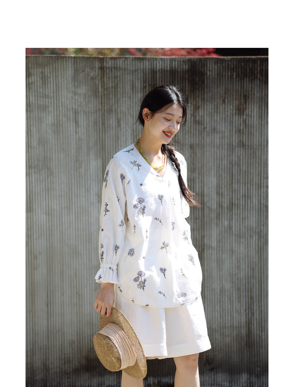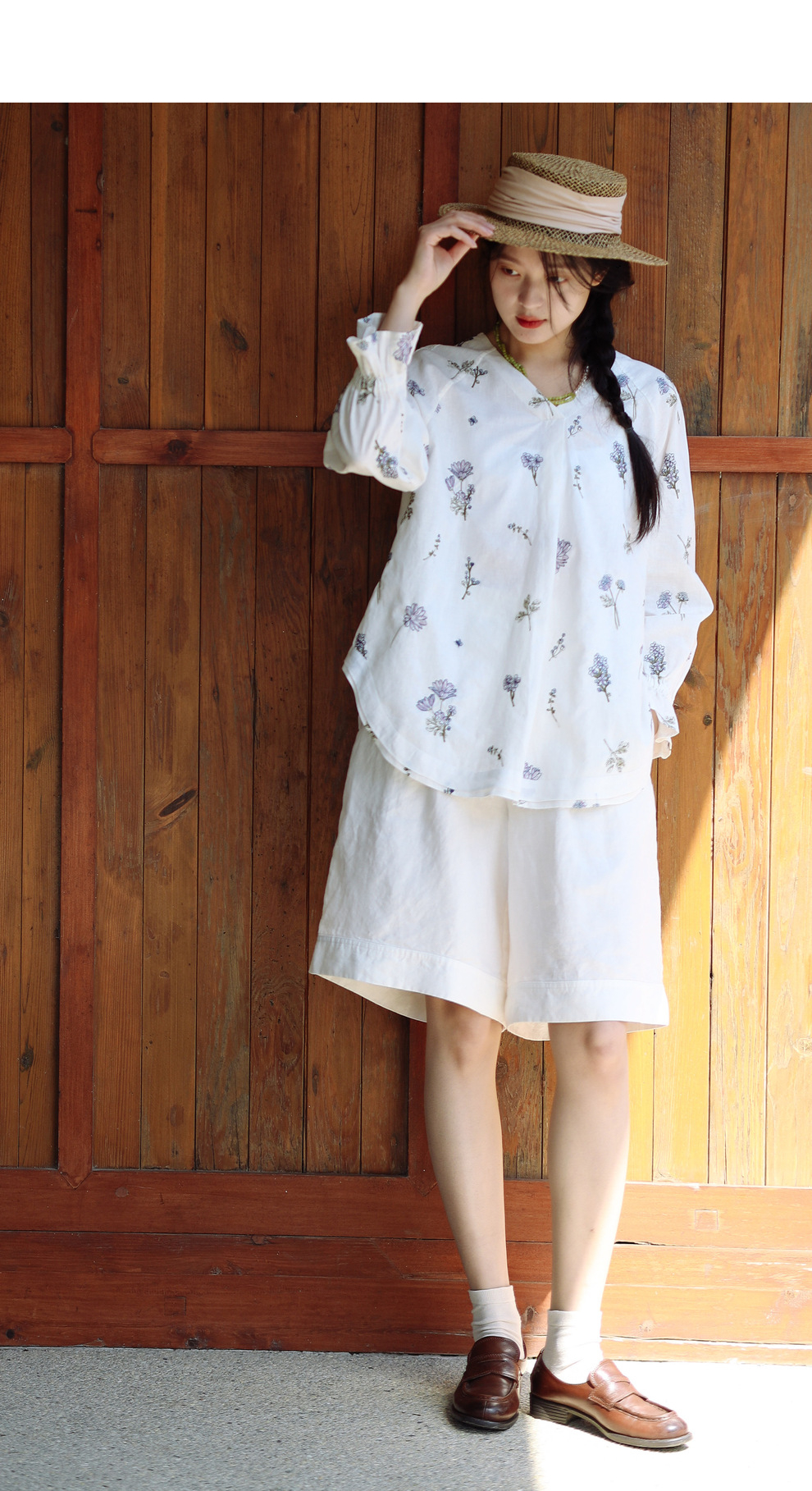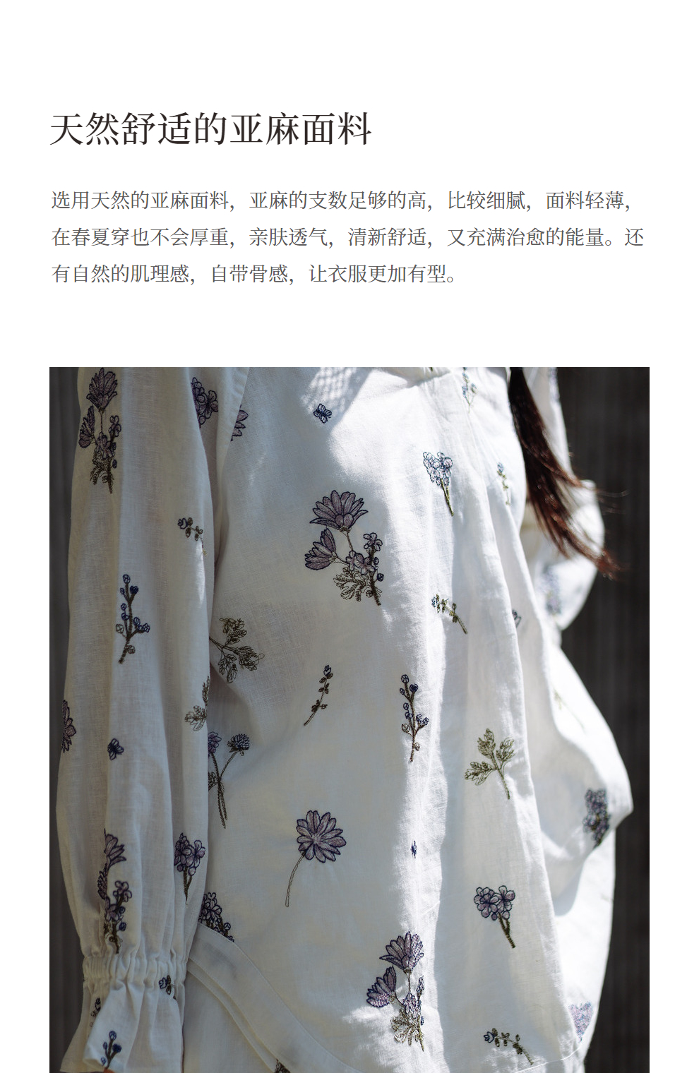 绽放245朵/白底刺绣亚麻衬衫旅游穿搭V领荷叶边下摆贴边长袖衬衣
