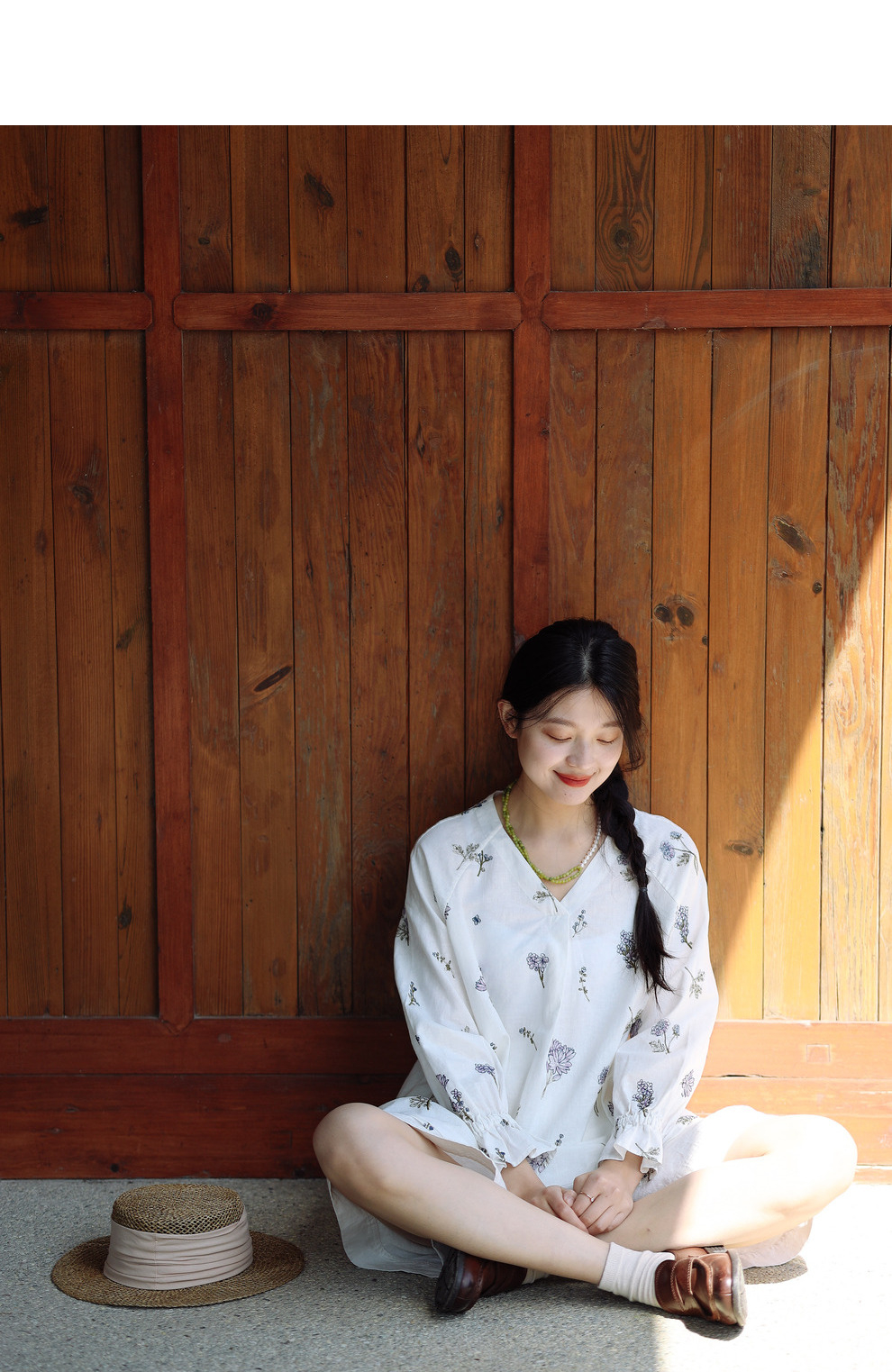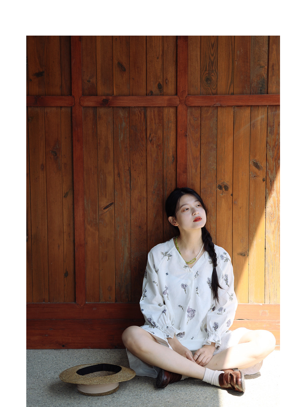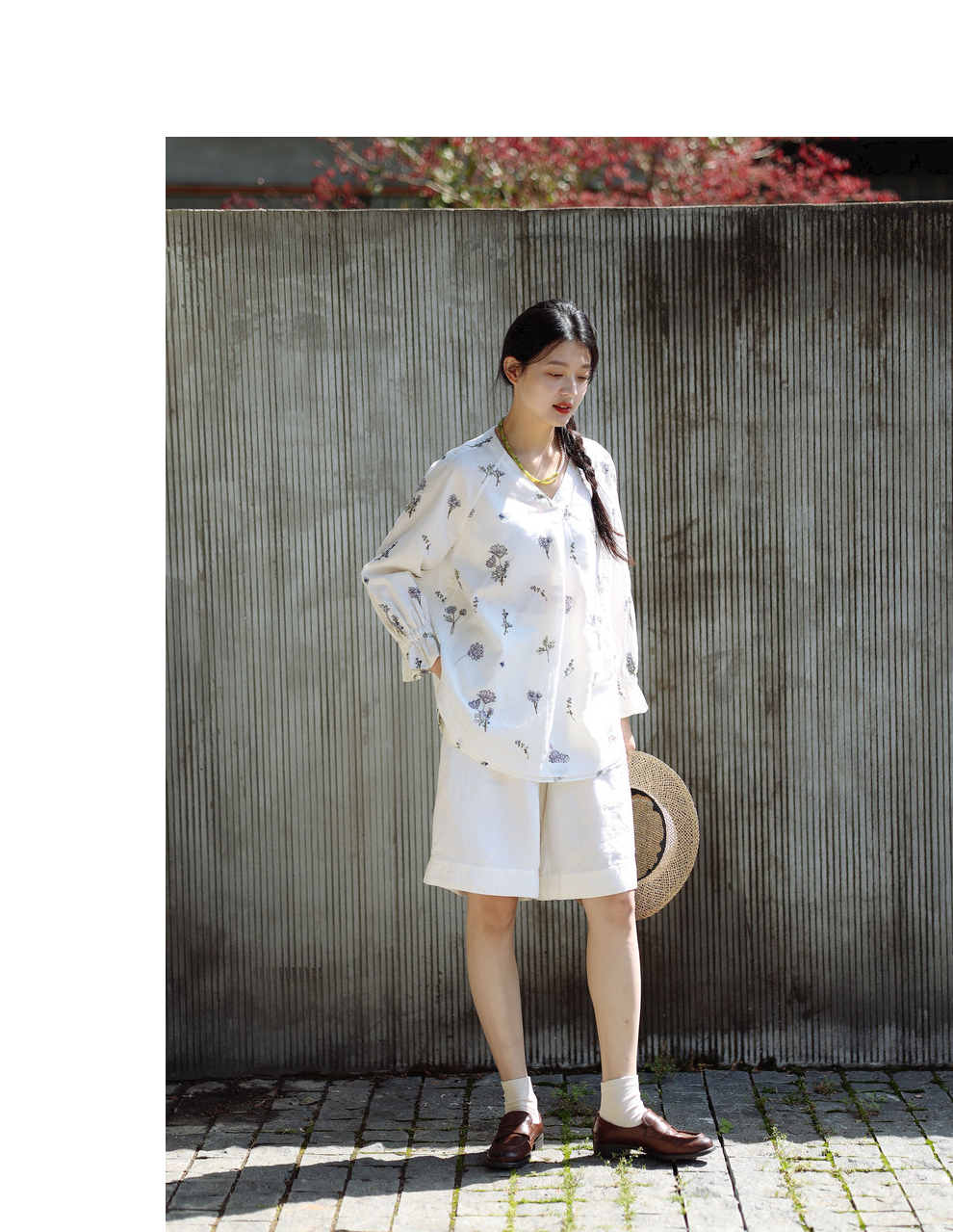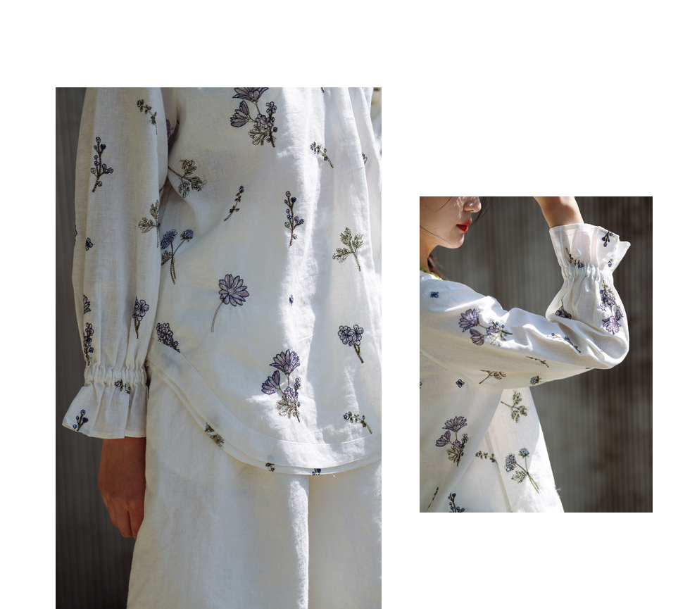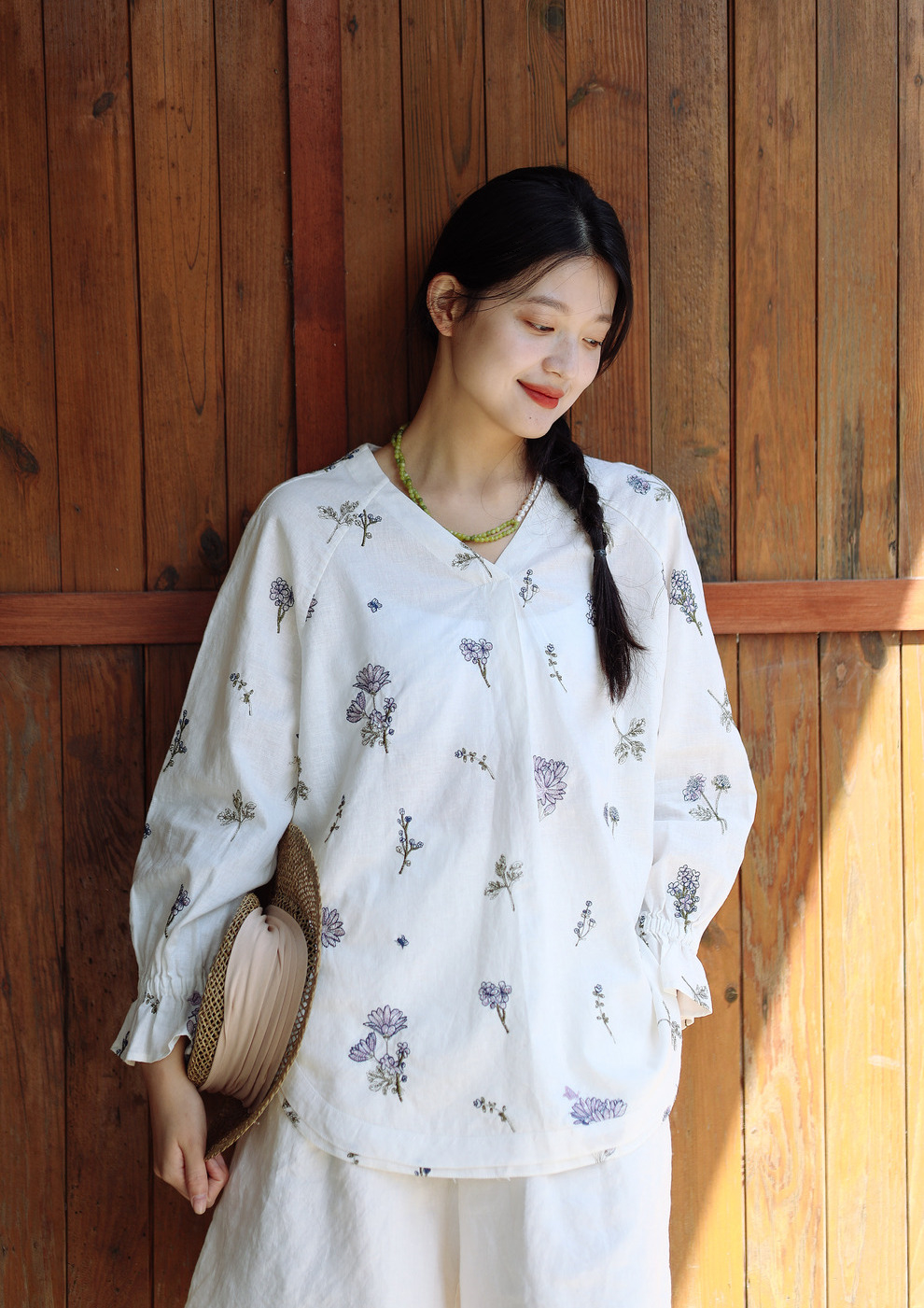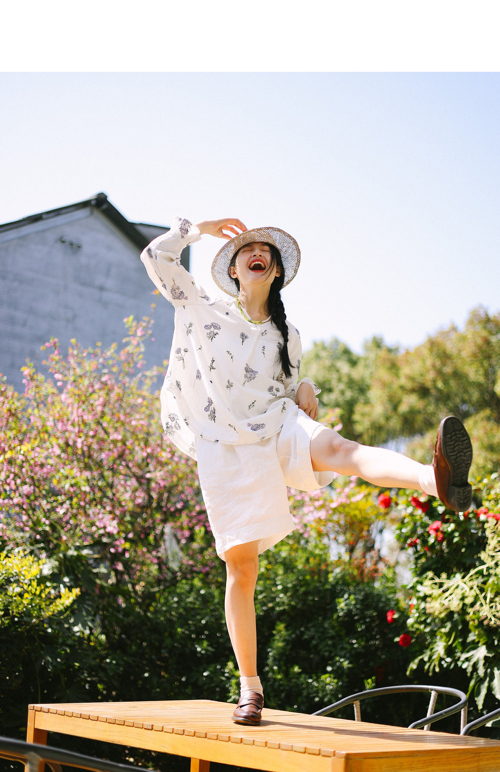 绽放245朵/白底刺绣亚麻衬衫旅游穿搭V领荷叶边下摆贴边长袖衬衣