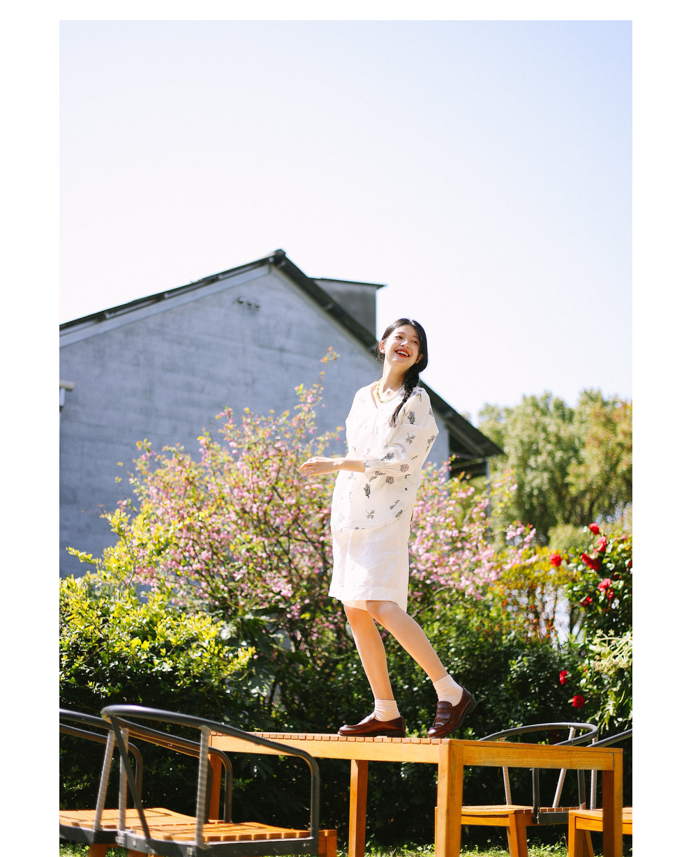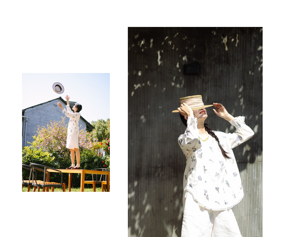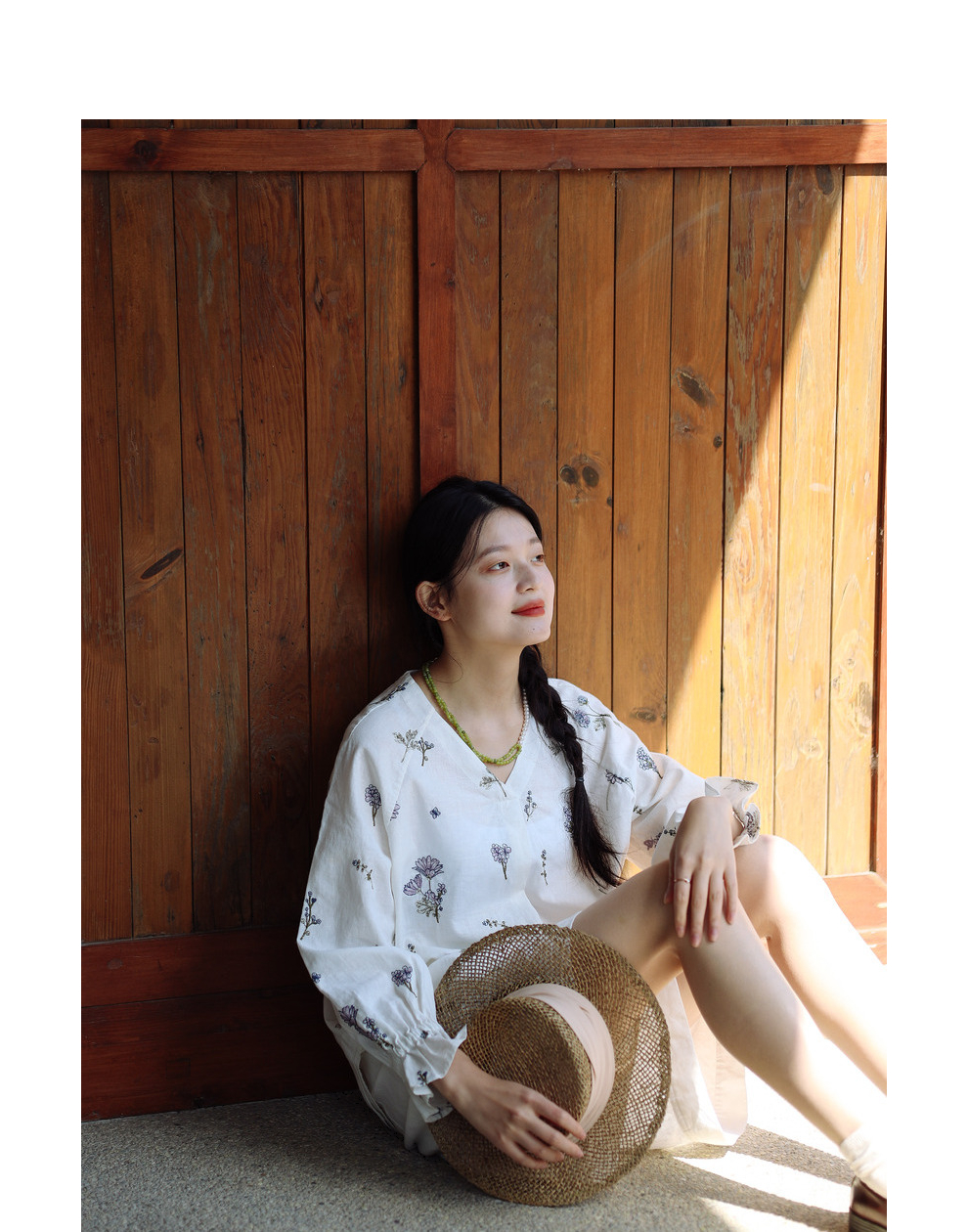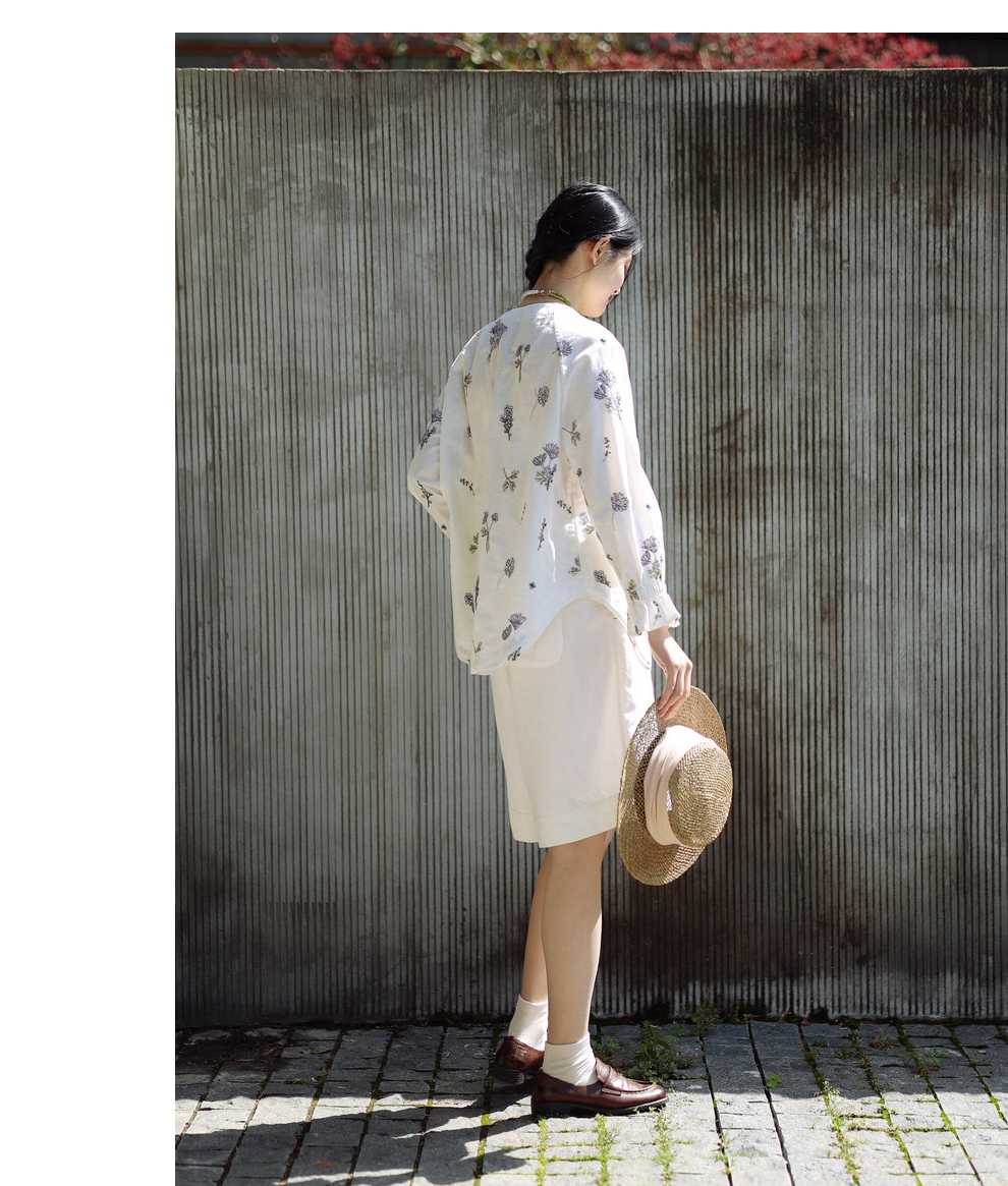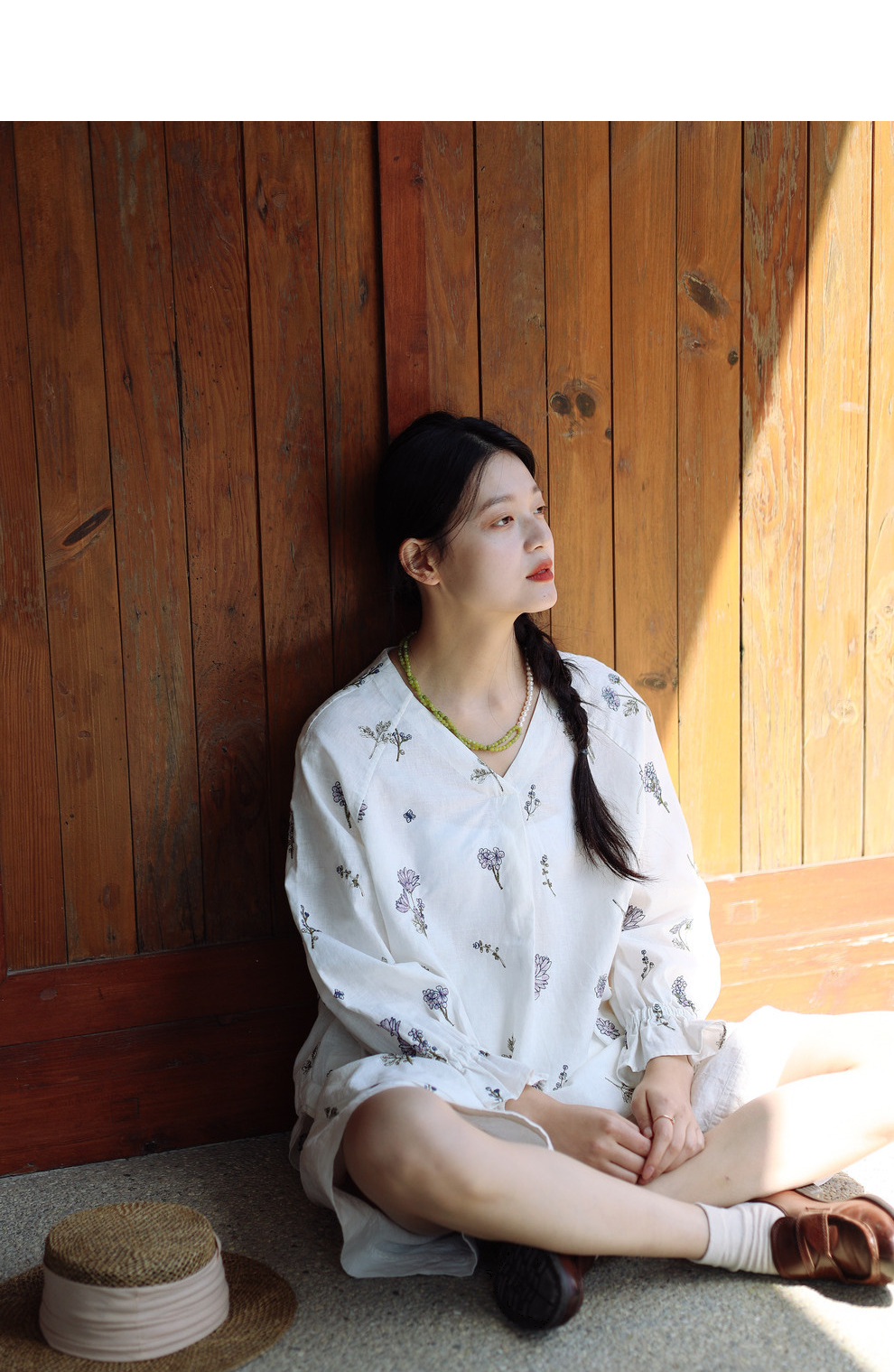 绽放245朵/白底刺绣亚麻衬衫旅游穿搭V领荷叶边下摆贴边长袖衬衣