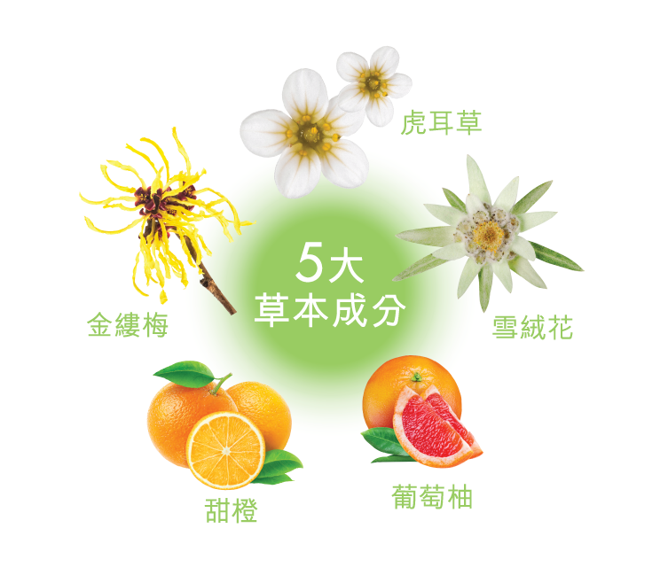 收細毛孔 5大草本成分全面调理肌肤,多效维他命C有助制造胶原蛋白,进一步收敛毛孔,让肌肤平滑紧致。