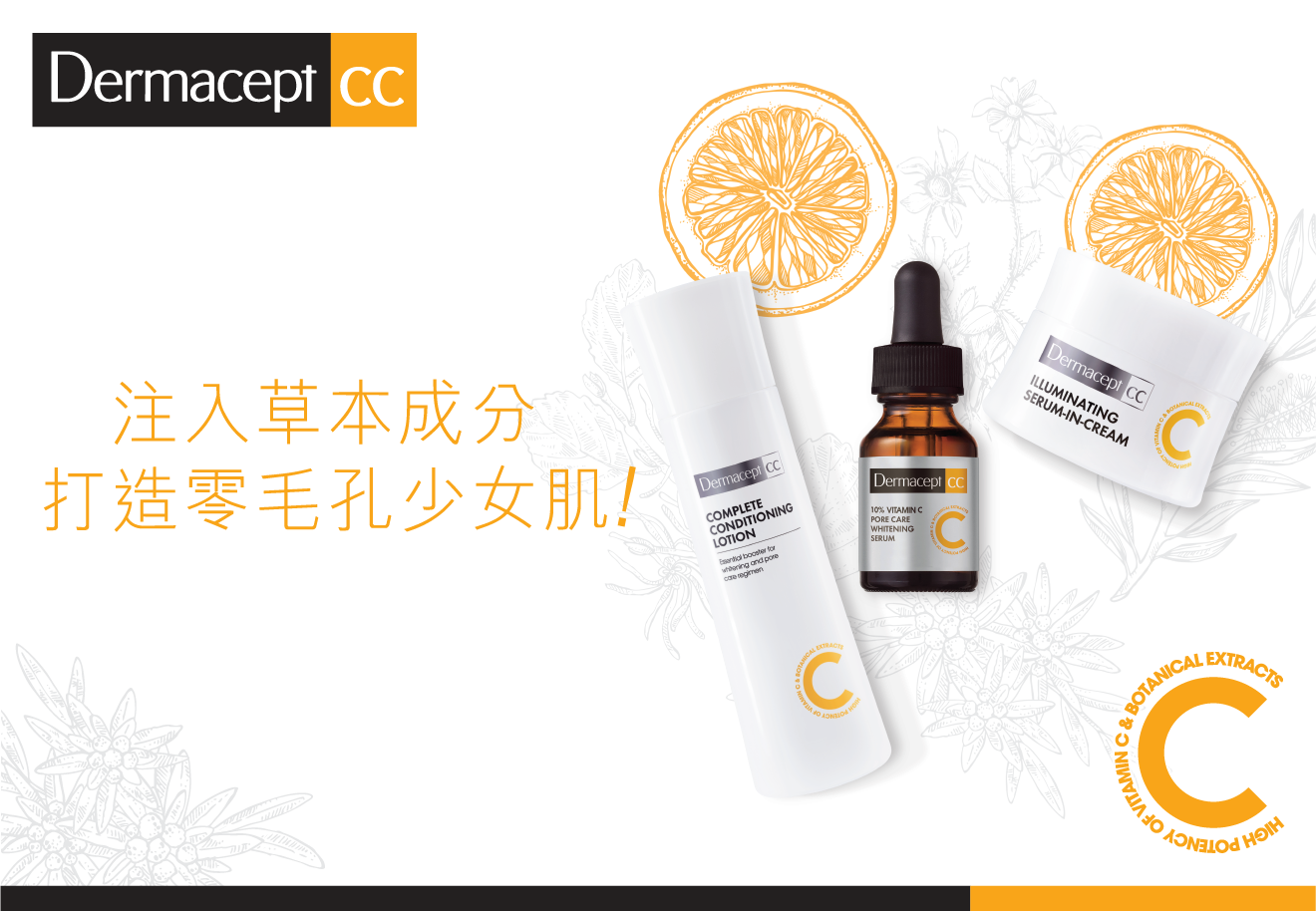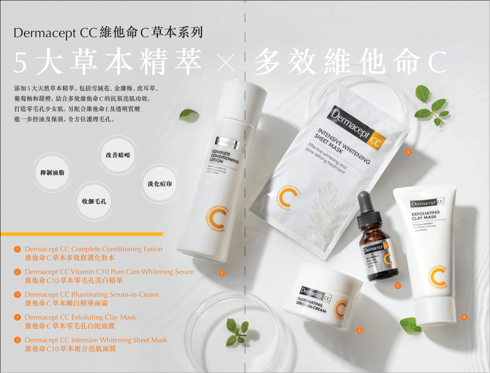 Dermacept坚守「皮肤健康再生」信念,以Zein Obagi, M.D.尖端护肤理念,研发Dermacept CC维他命C草本系列,专门针对毛孔粗大的肌肤问题,添加5大草本成分,包括雪绒花、 金缕梅、虎耳草、葡萄柚和甜橙及3种多效维他命C,打造零毛孔少女肌。另配合维他命E及透明质酸进一步控油及保湿,全方位护理毛孔。全系列不含人造色素、人造香料、Paraben和矿物油,安心使用。
