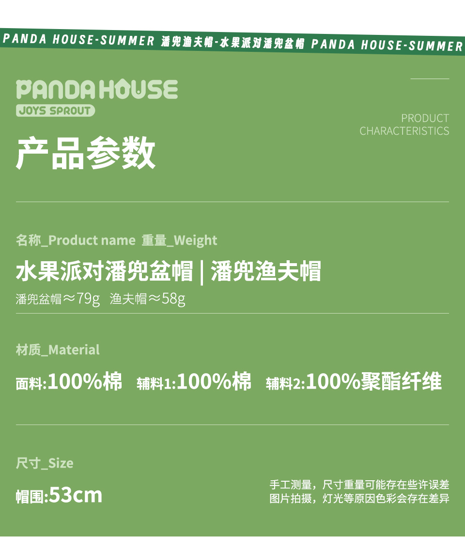 熊猫屋PANDAHOUSE 水果派对潘兜盆帽/潘兜渔夫帽-阳光假日 儿童款 多色可选