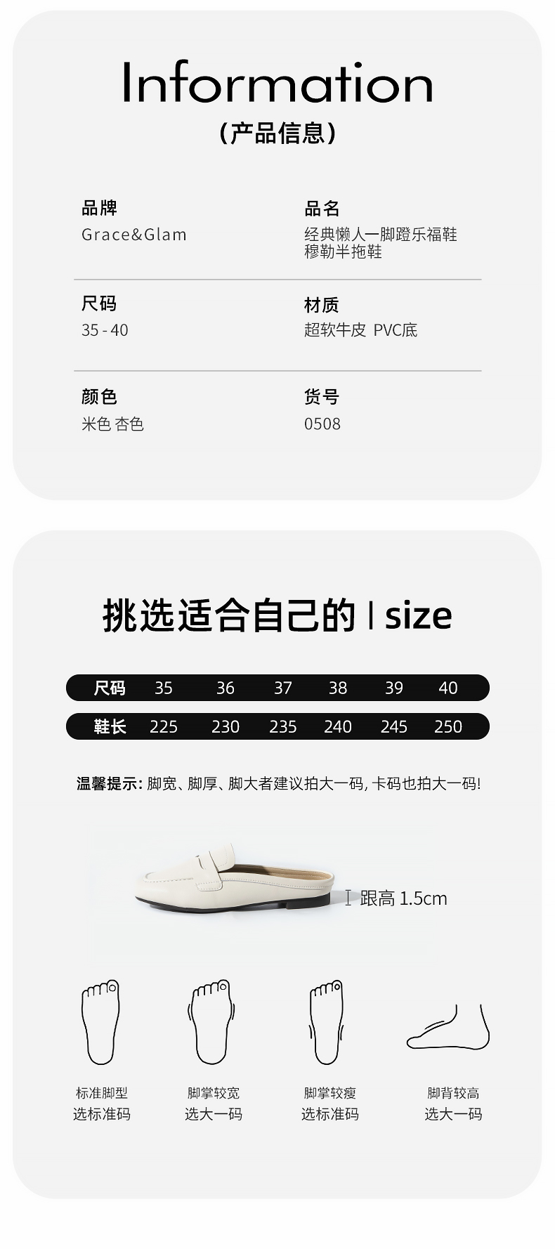 【品名】Grace&Glam 懒人一脚蹬乐福鞋 穆勒鞋 时尚百搭 通勤必备 【规格】米色、杏色 【尺码】35-40 【产地】国内 【发货包装】独立包装 【发货地】泉州 【发货快递】申通、邮政、韵达随机发 【不发货区域】新疆、西藏、港澳台 【发货时效】48-72小时,周末节假日顺延 |