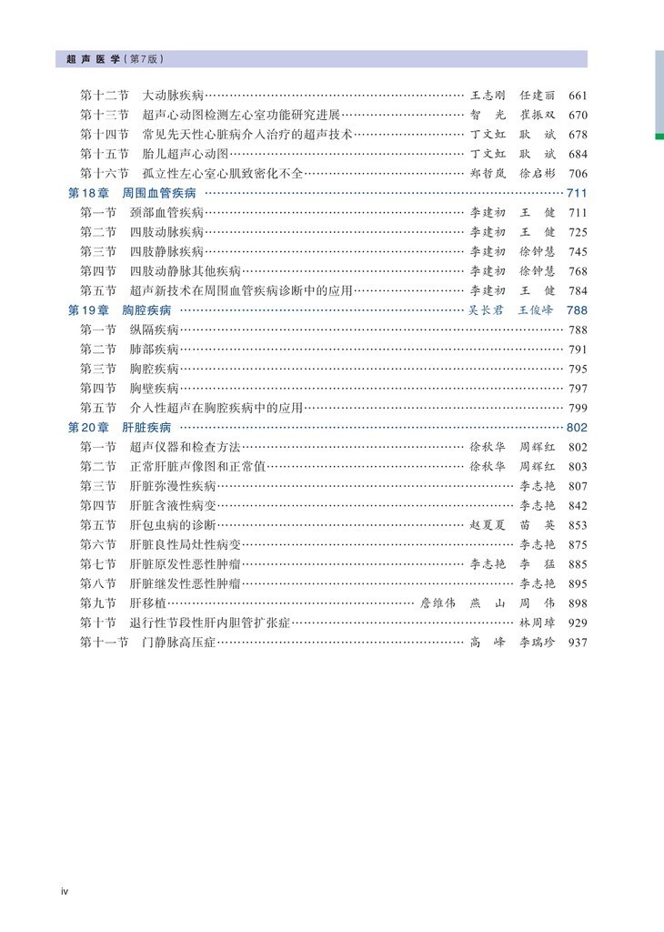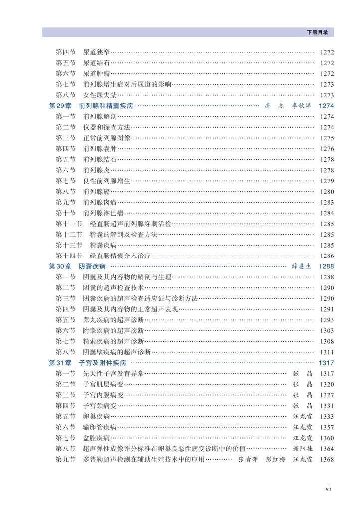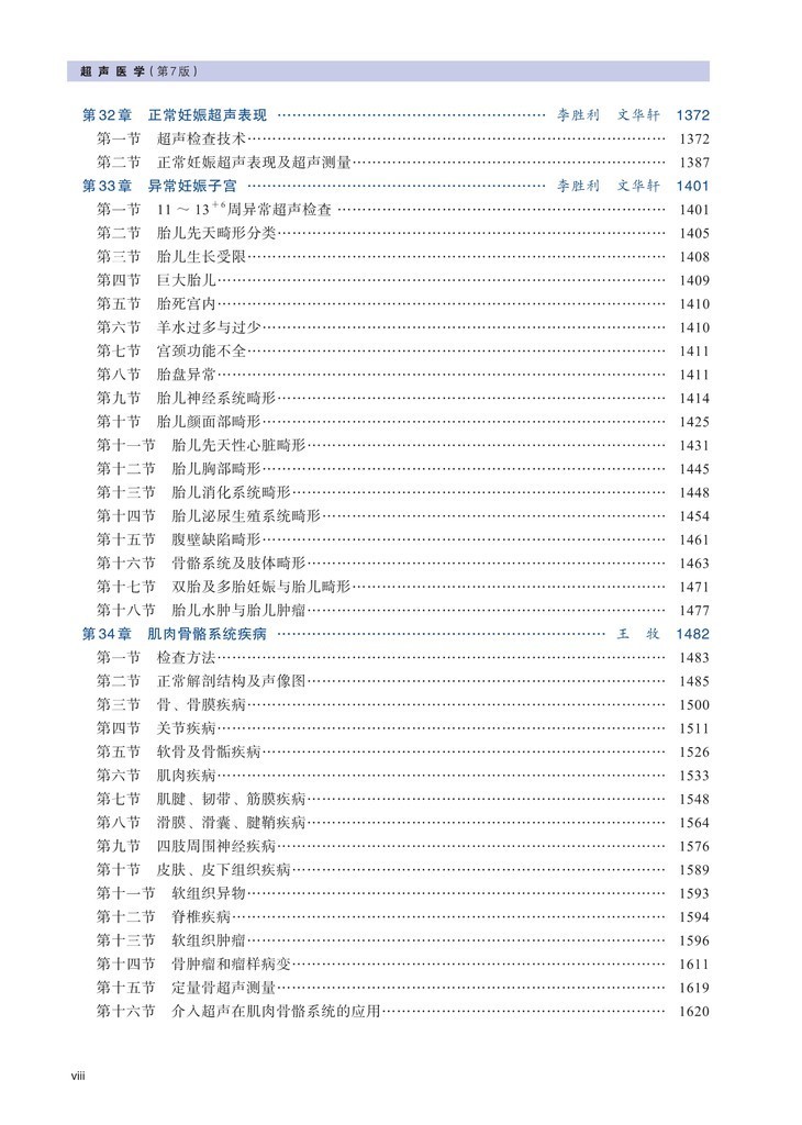 第二篇超声诊断,按照解剖部位论述了颅脑疾病、眼部疾病、颌面部疾病、甲状腺与甲状旁腺疾病、乳腺疾病、浅表淋巴结疾病、心血管疾病、周围血管疾病、胸腔疾病肝脏疾病、胆道系统疾病、脾脏疾病、胰腺疾病、胃肠疾病、肾上腺疾病、肾及输尿管疾病、膀胱疾病、尿道疾病、前列腺和精囊疾病、阴囊疾病、子宫及附件疾病、正常妇娠超声表现、异常妊娠子宫、肌肉骨骼系统疾病、腹膜后疾病等,专门论述了小儿疾病。