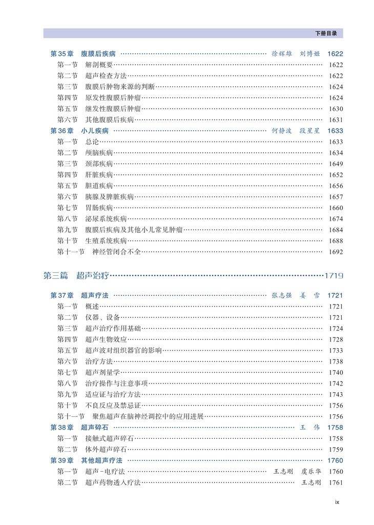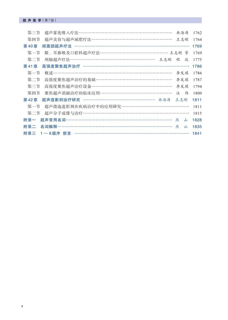 第三篇超声治疗,讲述了各种超声疗法、超声碎石、颅面部超声疗法、高强度聚焦超声治疗、超声造影剂治疗研究。