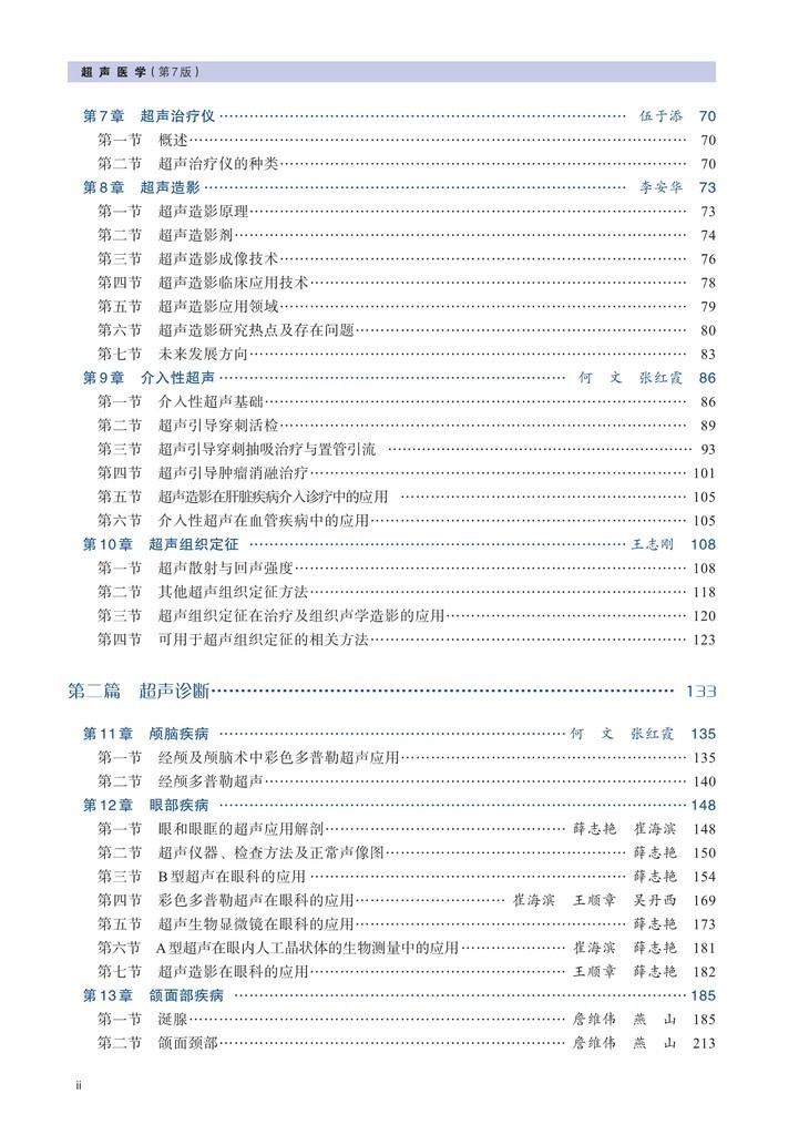 第一篇超声医学基础,阐述了超声医学概论、超声声学基础、超声生物物理学、超声测量和安全性、超声诊断原理及诊断基础、超声诊断仪、超声治疗仪、超声造影、介入性超声、超声组织定征。