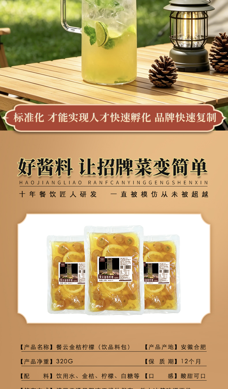 餐云金桔柠檬汁(饮品料包)餐饮特色饮品创新推荐 餐饮=餐+饮 餐云饮品研发团队历时三年研发成果