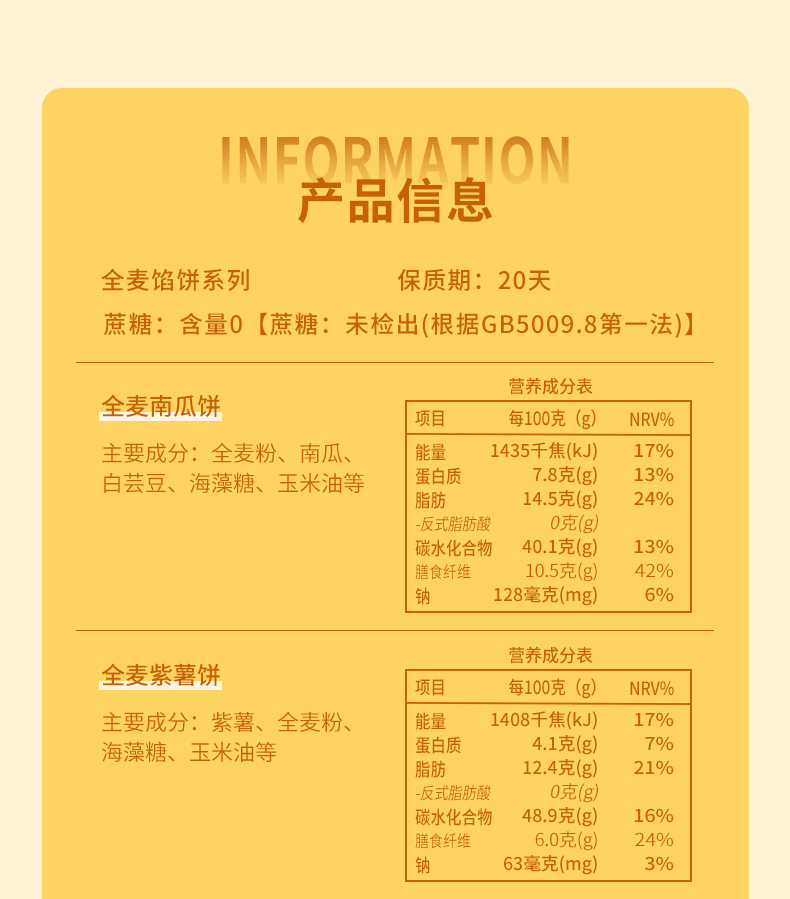 【不含蔗糖-全麦粗粮】天鲜萌全麦馅饼 840g/箱 一箱约20个 南瓜/紫薯/芋泥/绿豆4种口味 无蔗糖 饼皮薄而松软 含膳食纤维 健康饱腹 全家都能吃的零食