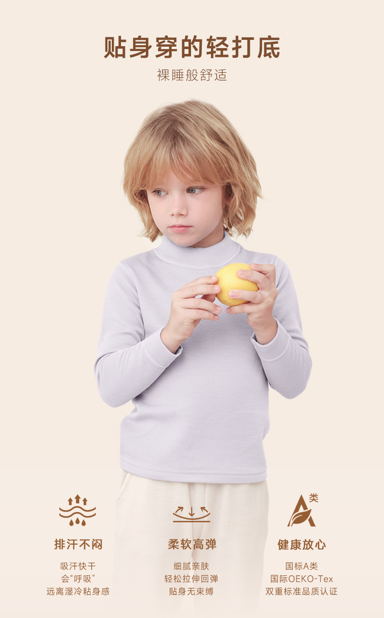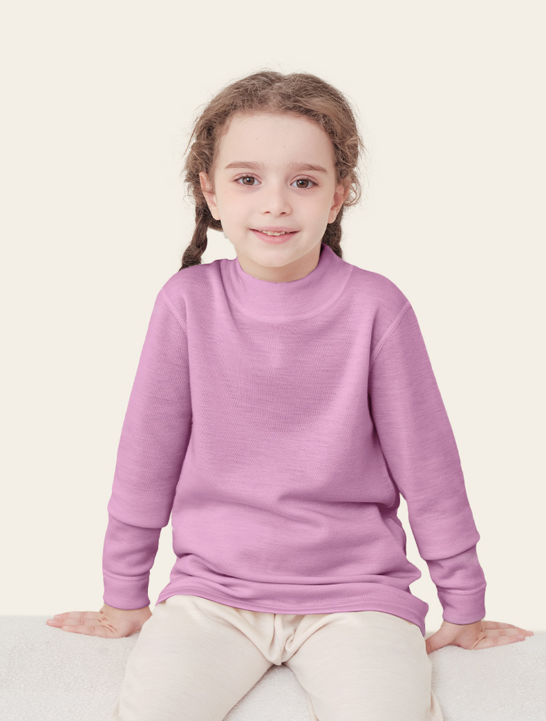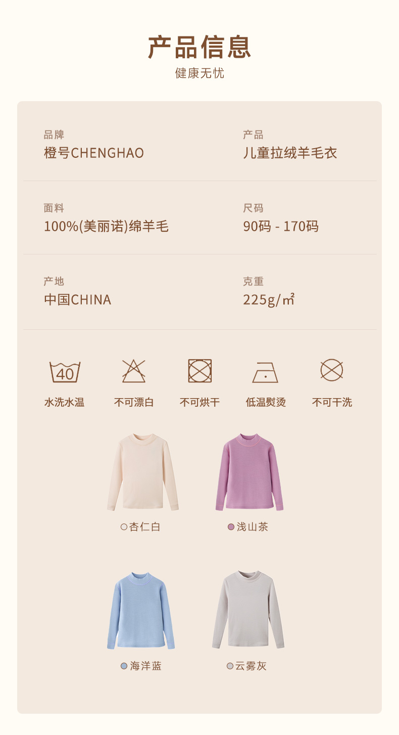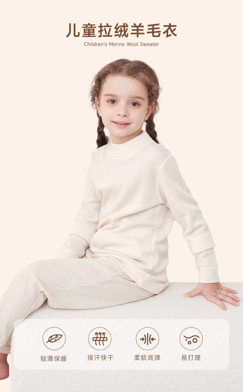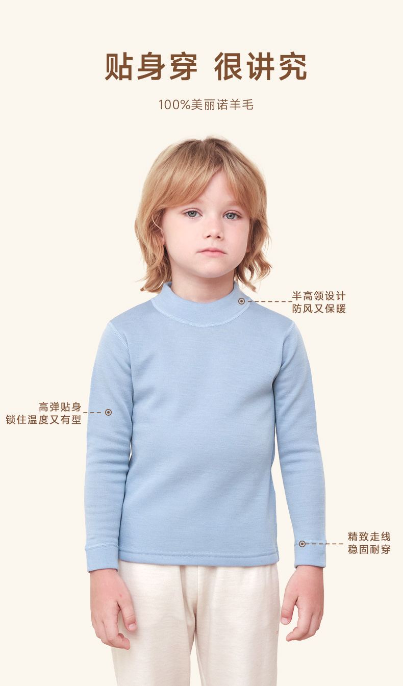 低于双12【90-170】橙号100%美丽诺羊毛儿童小高领内拉绒加厚秋衣打底衫2025年 克重225g/㎡