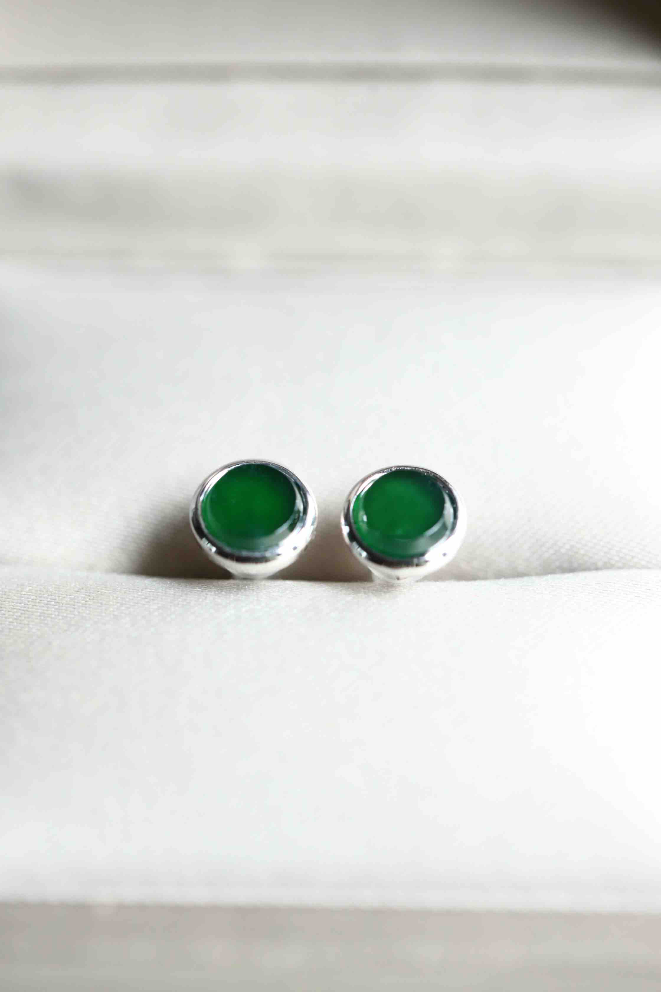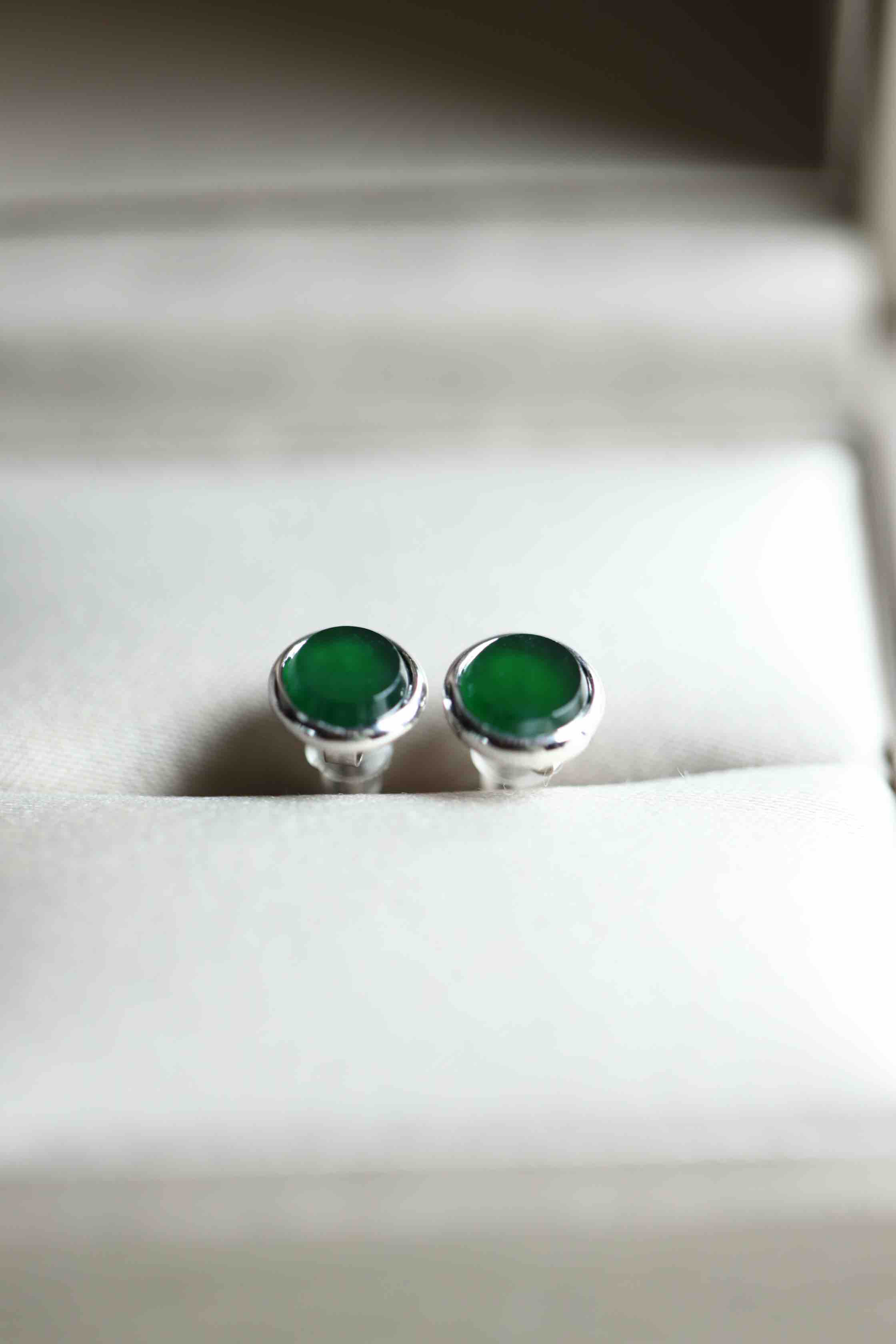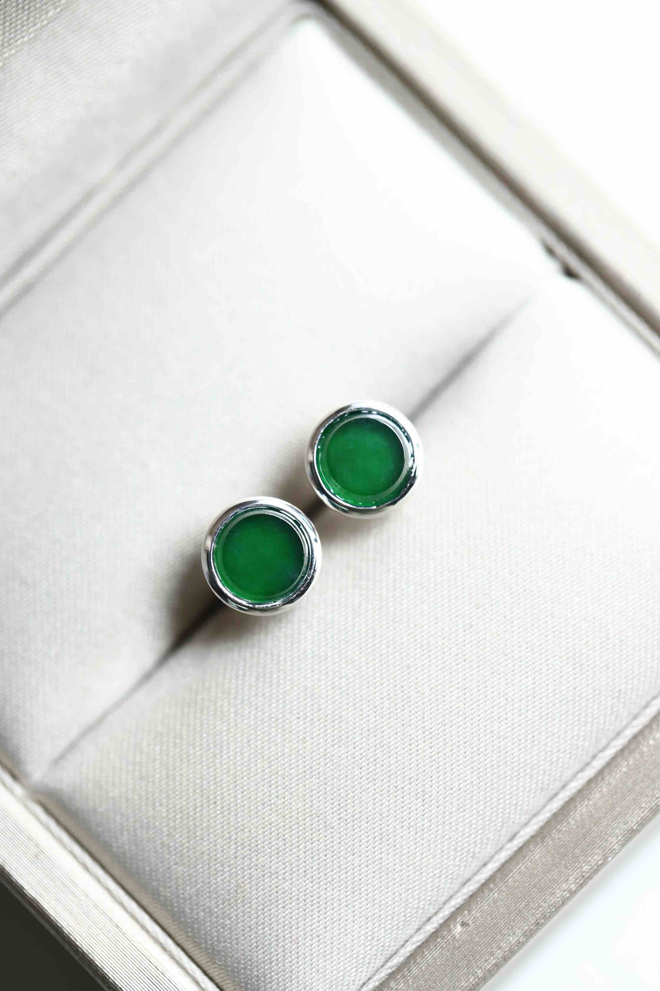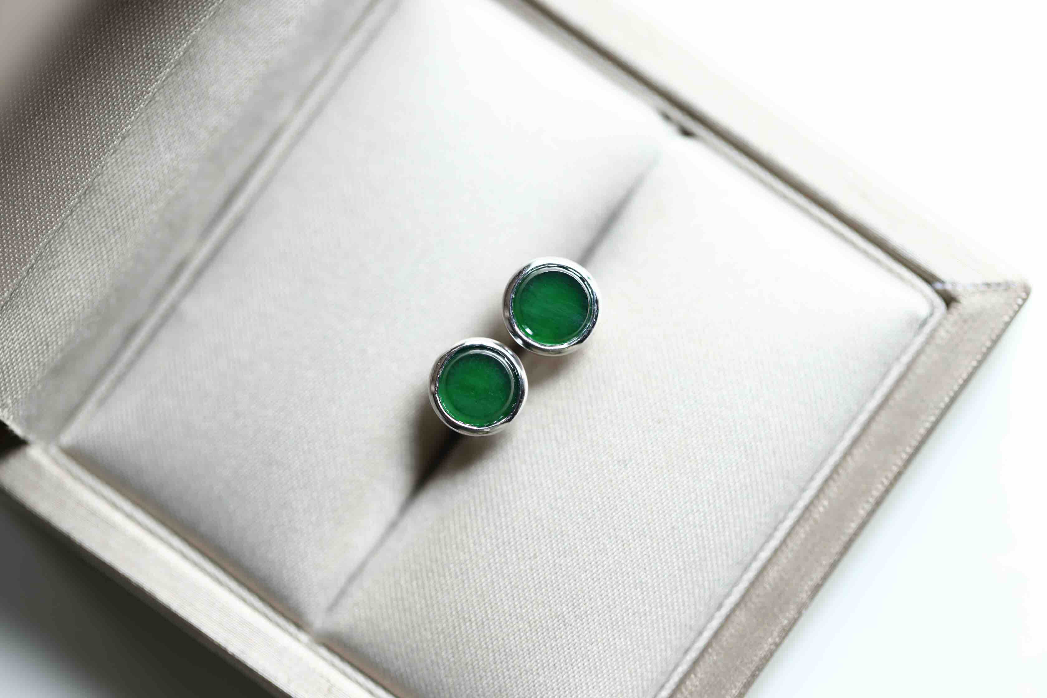高冰种湖水绿翡翠圆盘耳钉18k白金镶嵌