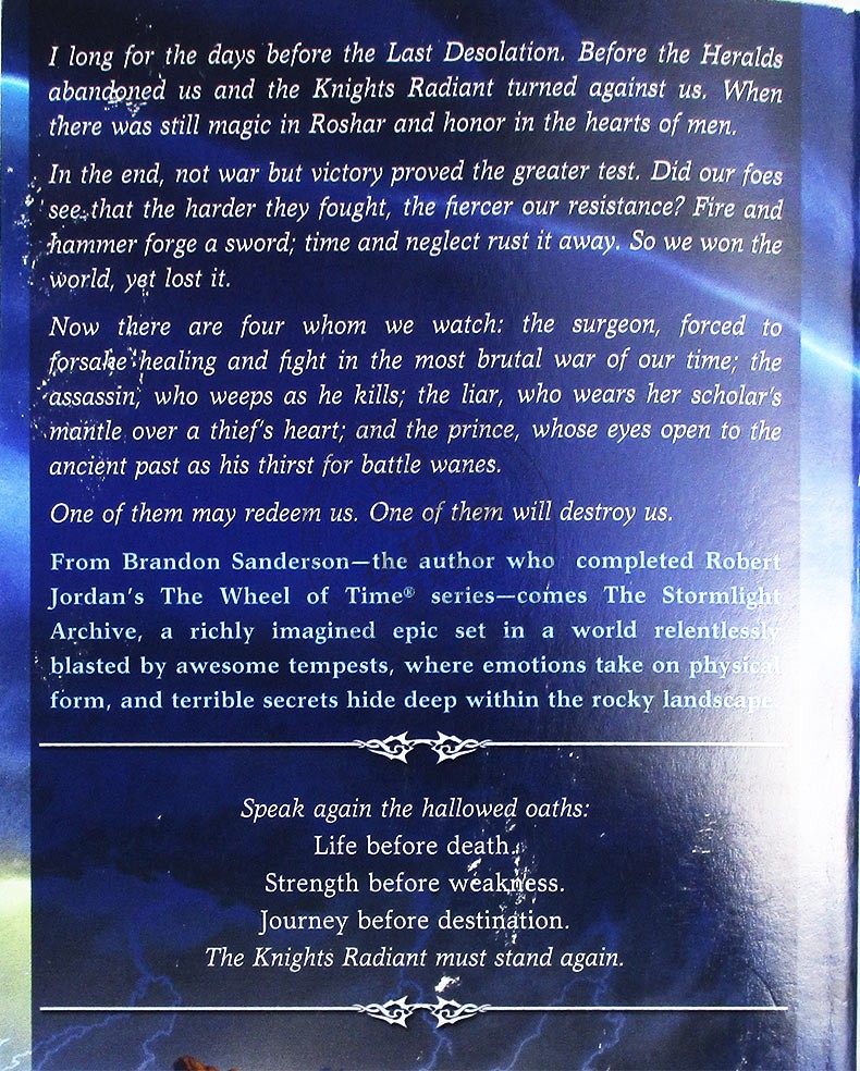 Brightlord Dalinar Kholin commands one of those other armies. Like his brother, the late king, he is fascinated by an ancient text called The Way of Kings. Troubled by over-powering visions of ancient times and the Knights Radiant, he has begun to doubt his own sanity.