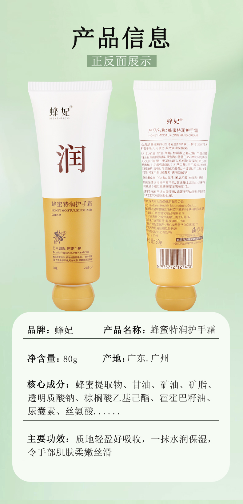 蜂妃蜂蜜特润护手霜80g 滋润修护淡手纹补充水份男女士防干裂手部护肤 官方正品