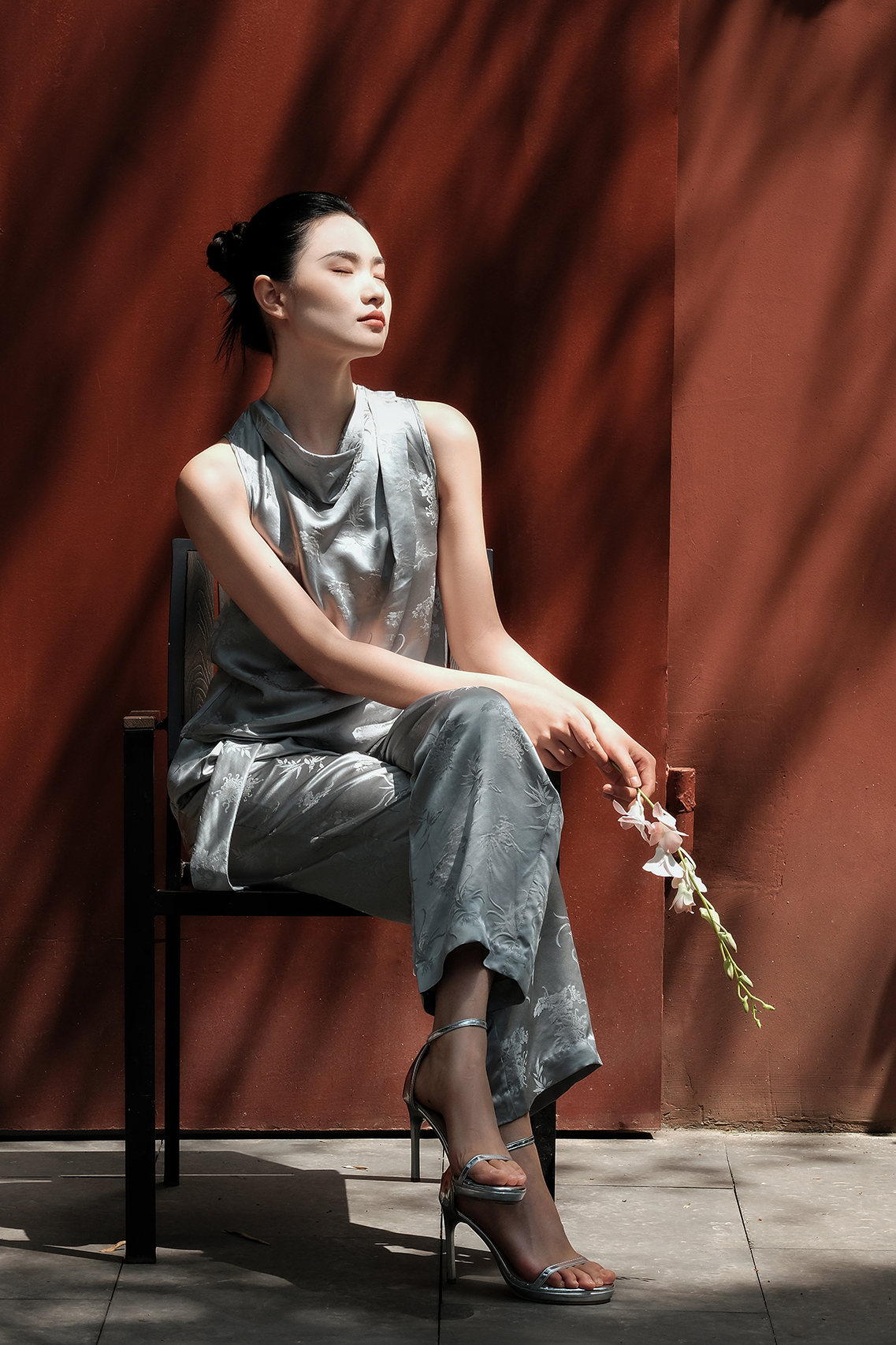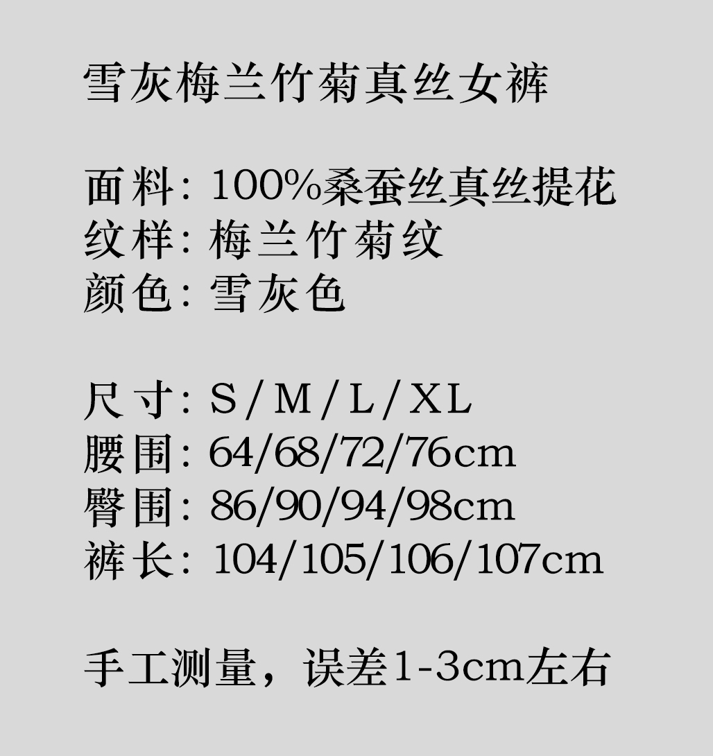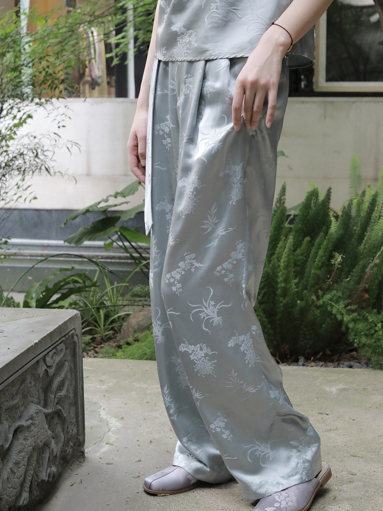 盛唐牡丹 |雪灰梅兰竹菊真丝女裤