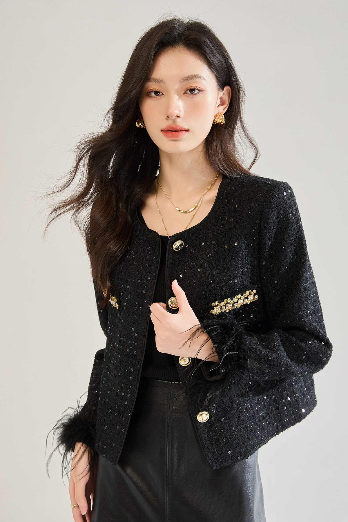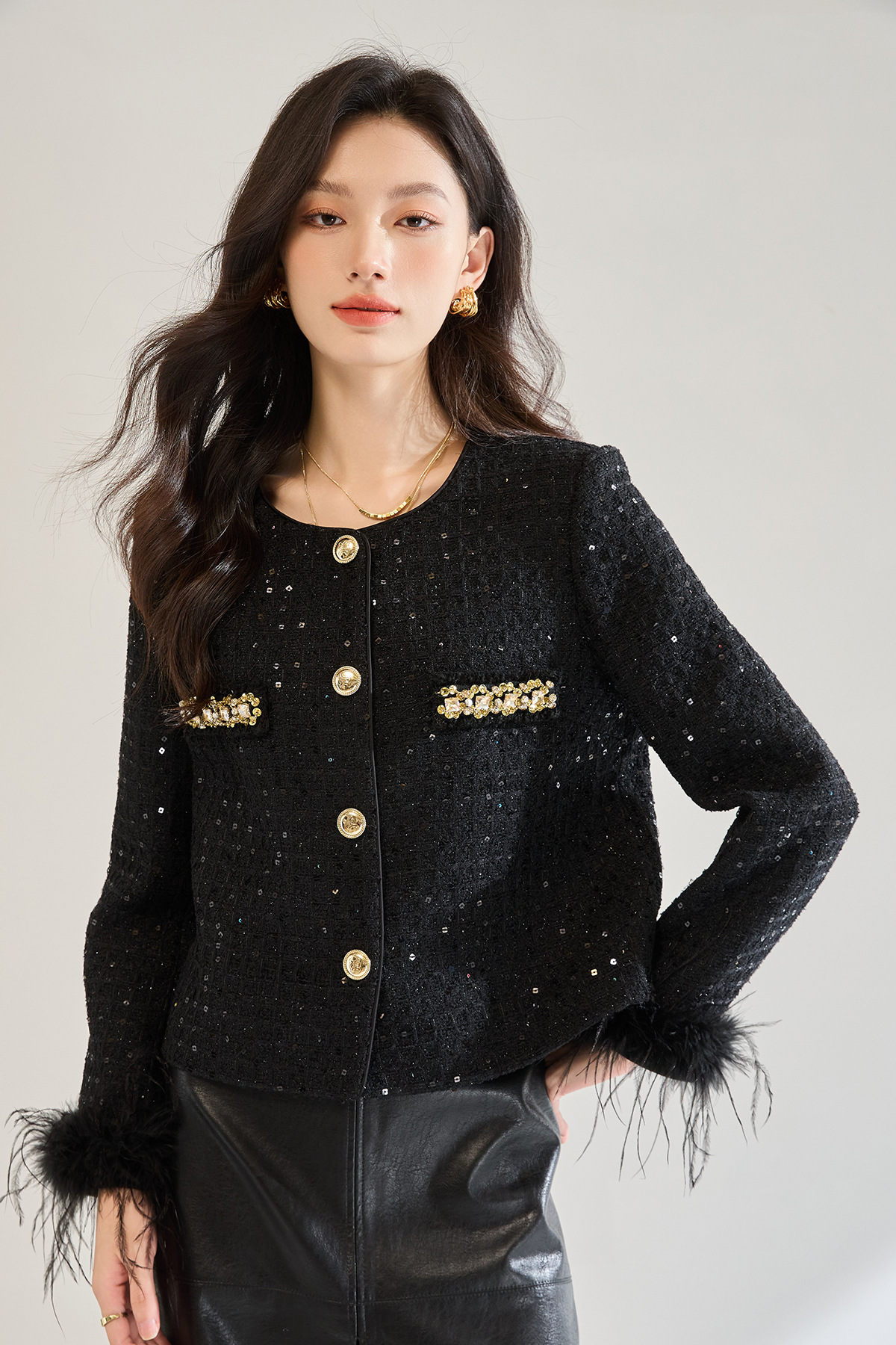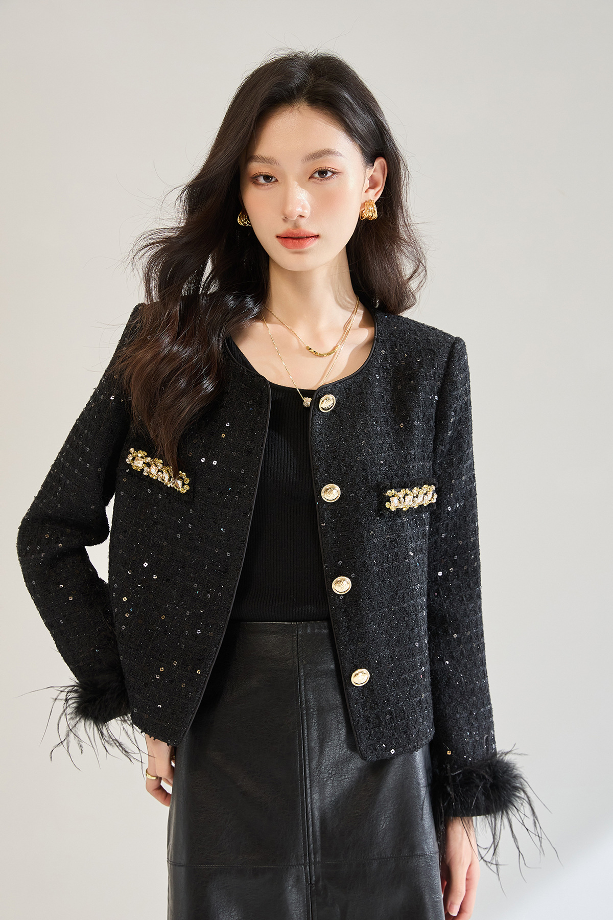 「高货sh」全新升级【铂金会员441/天猫599/差价158】(02645)洛诗琳新款可拆卸鸵鸟毛编织外套2025秋季气质小香风外套sh02645