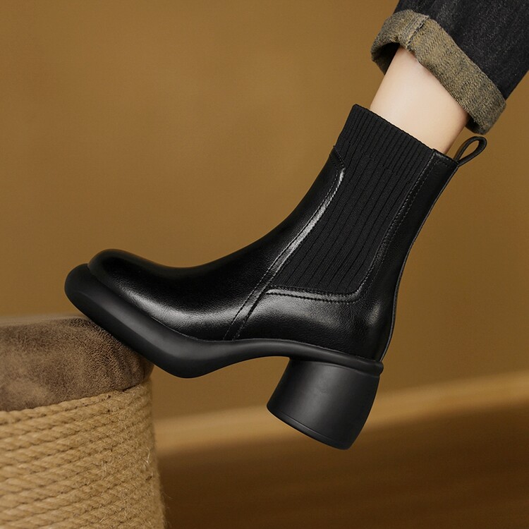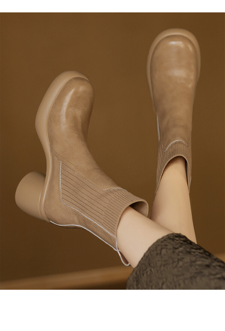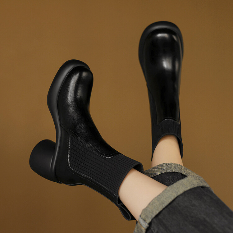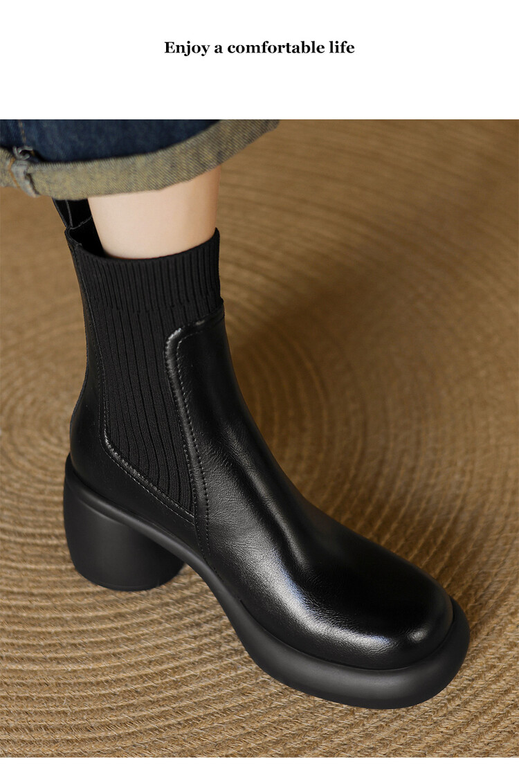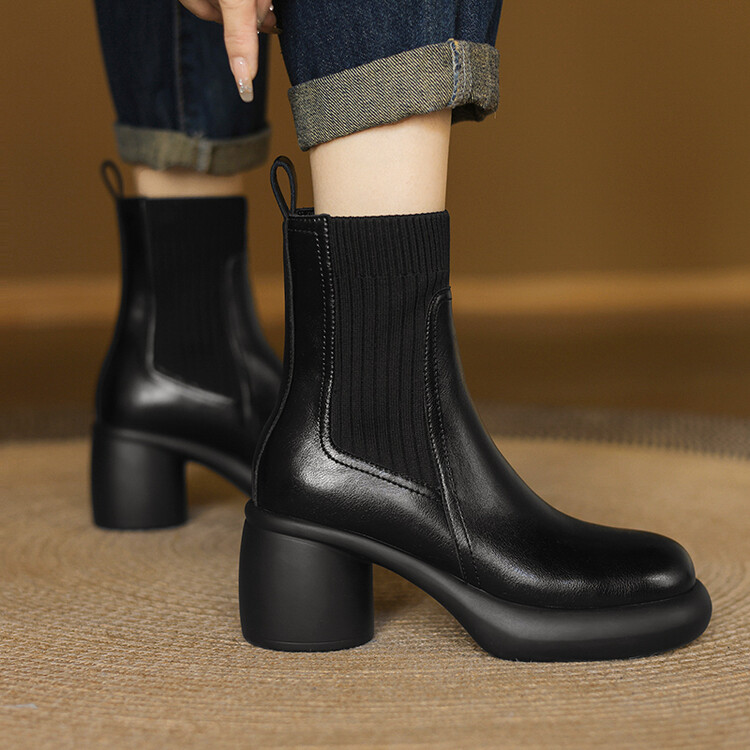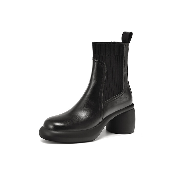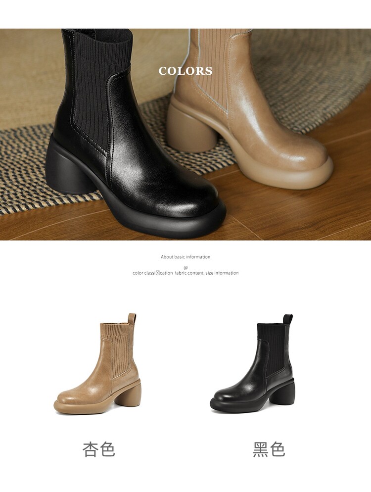 牛皮拼接毛线口高跟短靴女秋冬新款粗跟厚底休闲马丁靴百搭弹力靴DTN&X312-11