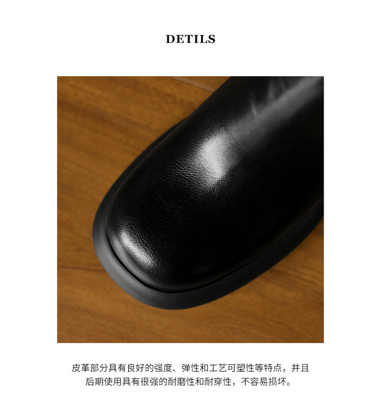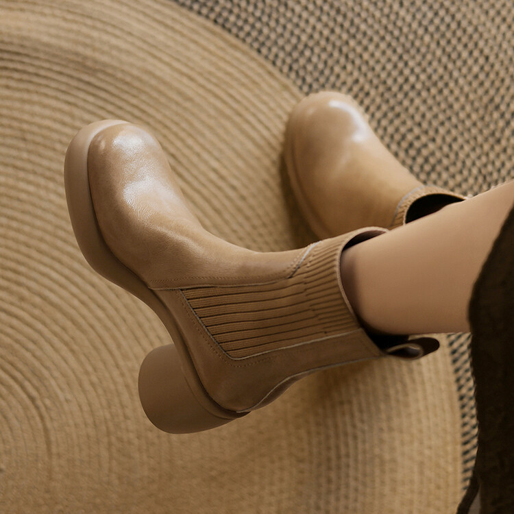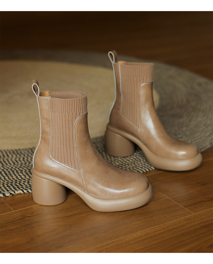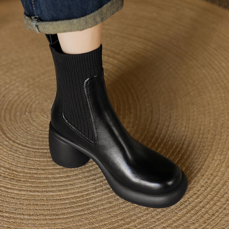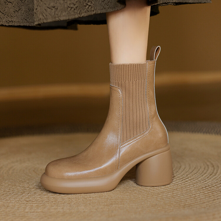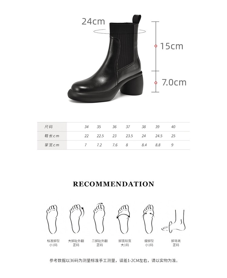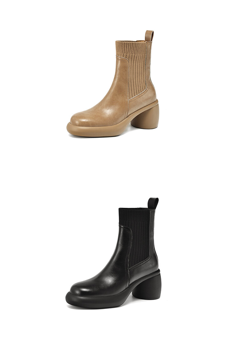 牛皮拼接毛线口高跟短靴女秋冬新款粗跟厚底休闲马丁靴百搭弹力靴DTN&X312-11