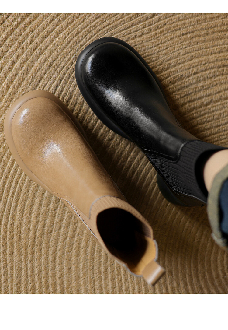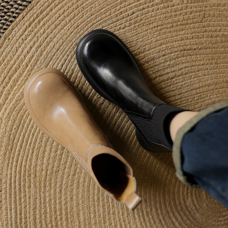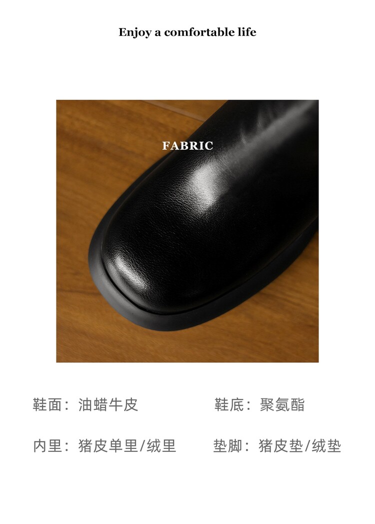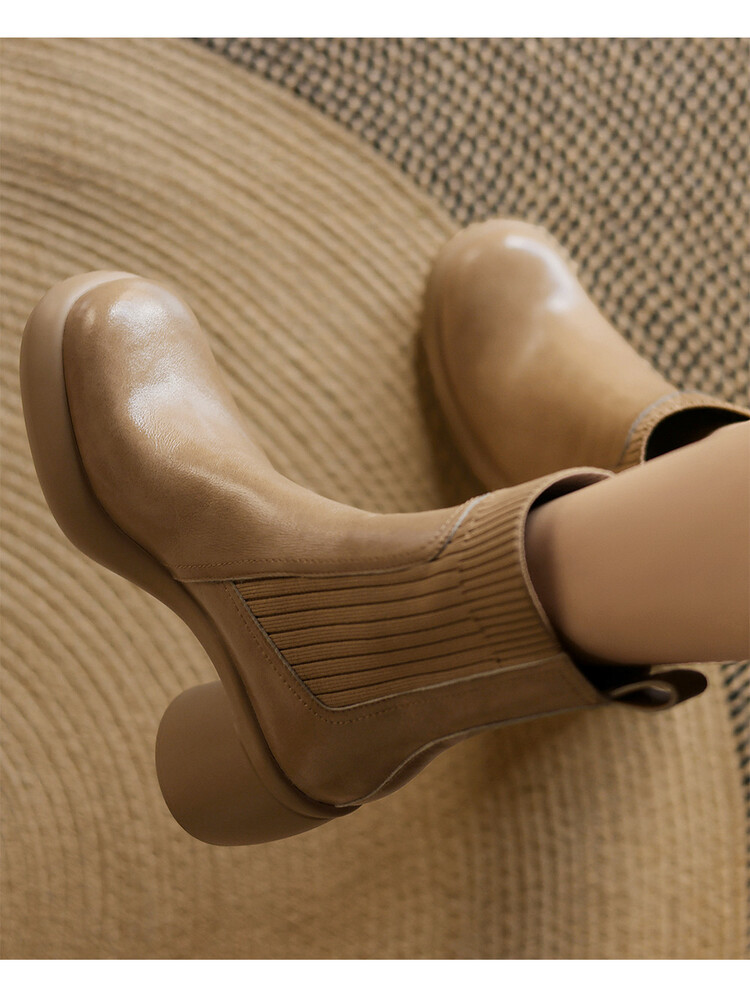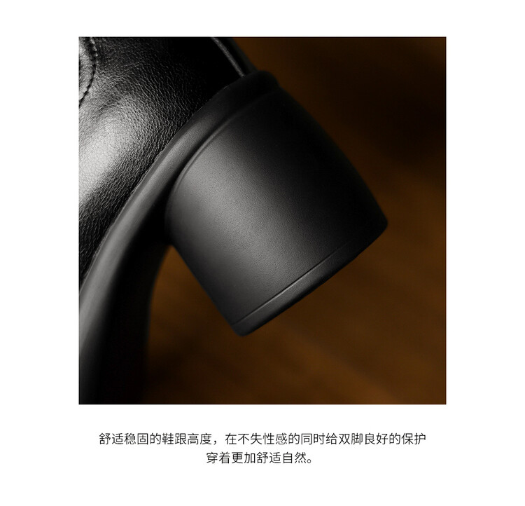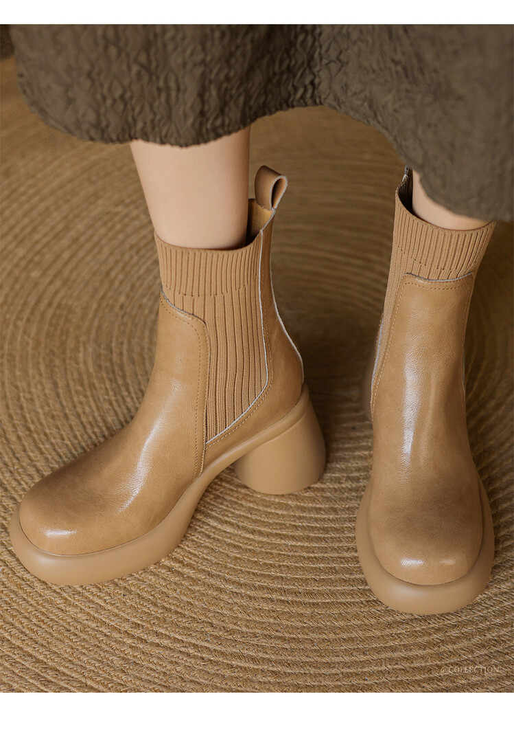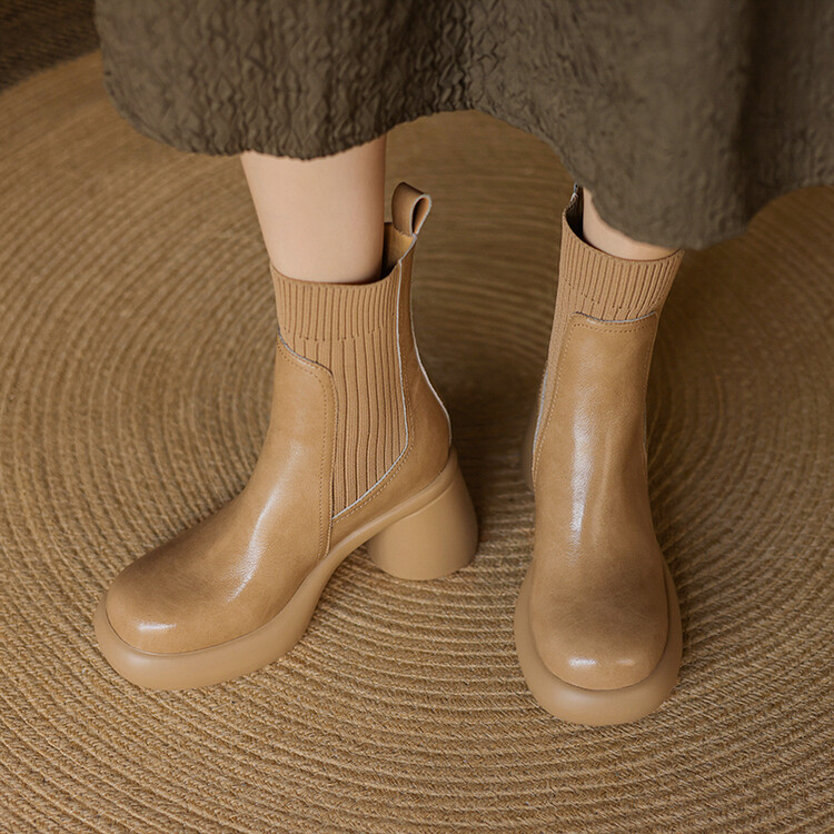 牛皮拼接毛线口高跟短靴女秋冬新款粗跟厚底休闲马丁靴百搭弹力靴DTN&X312-11