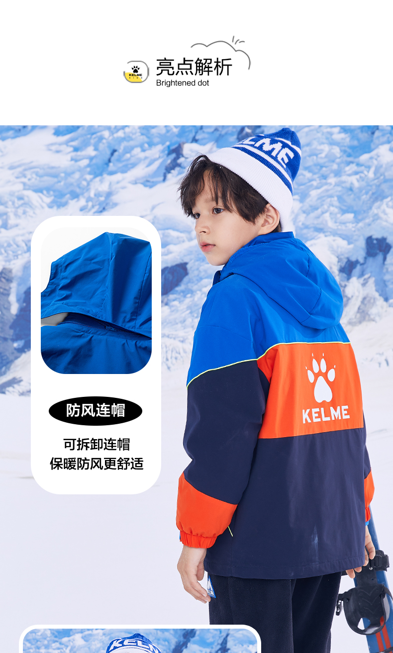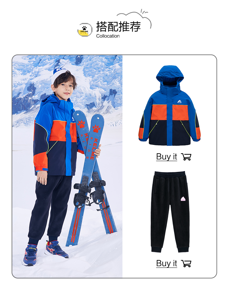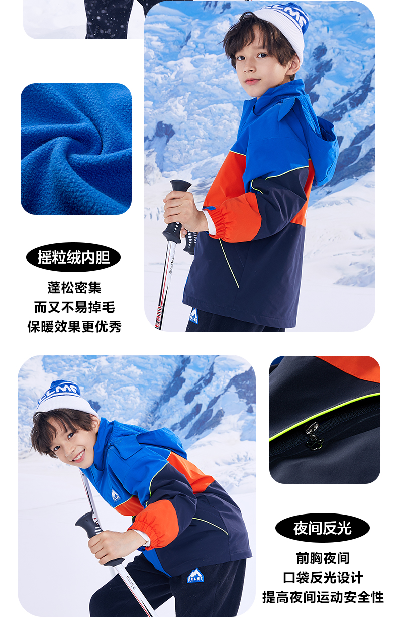 卡尔美 男童运动外套冬装三合一可拆卸儿童冲锋外套两件套