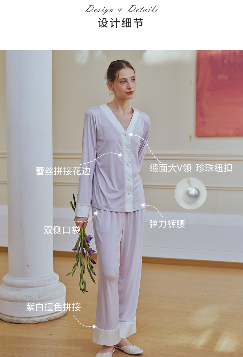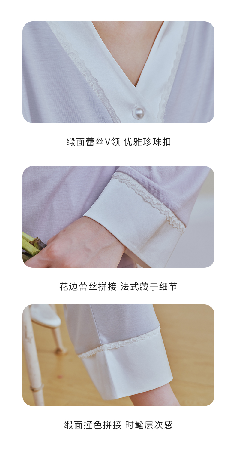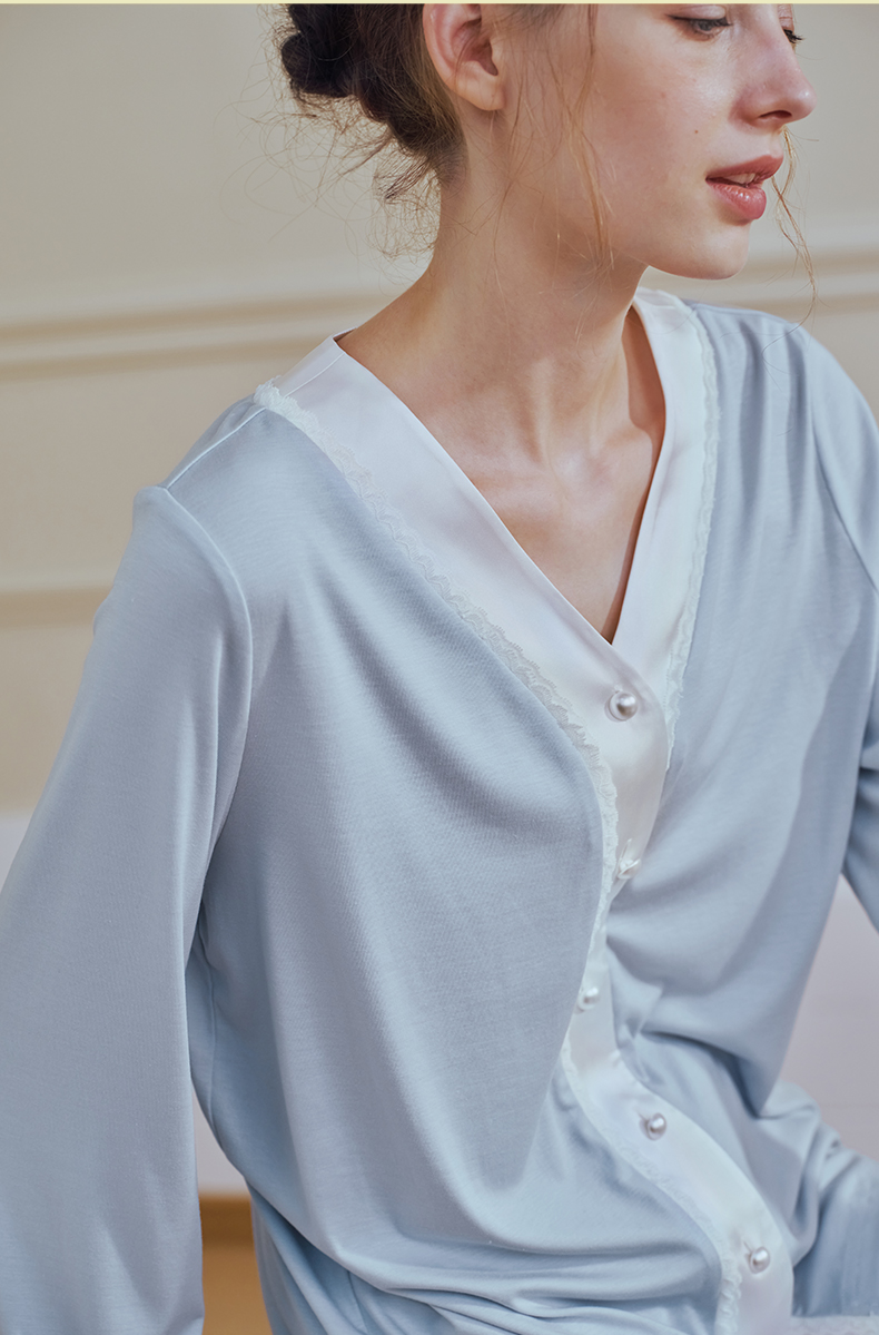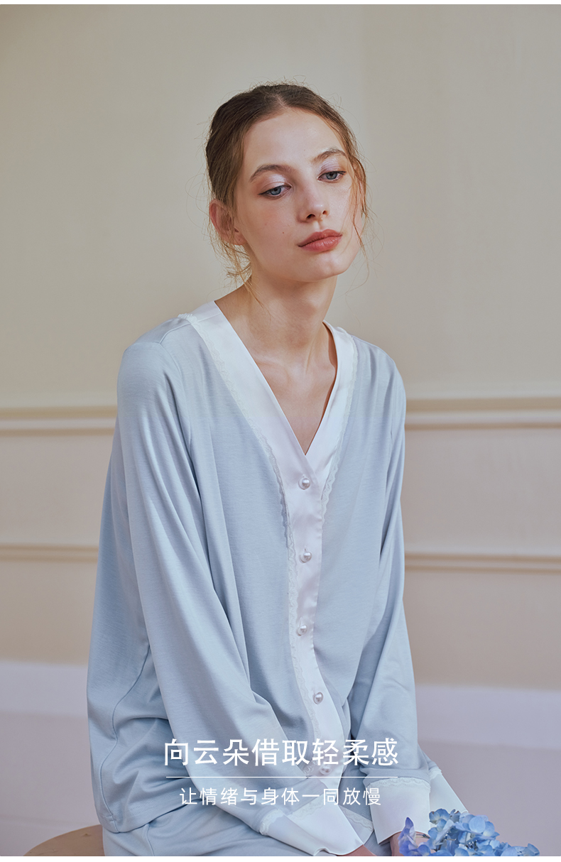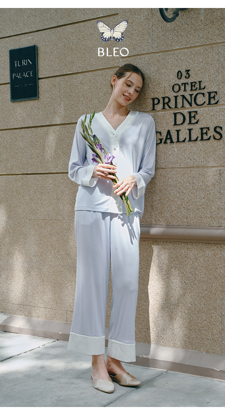 BLEO 莱赛尔天丝拼接缎面珍珠扣长袖长裤套装