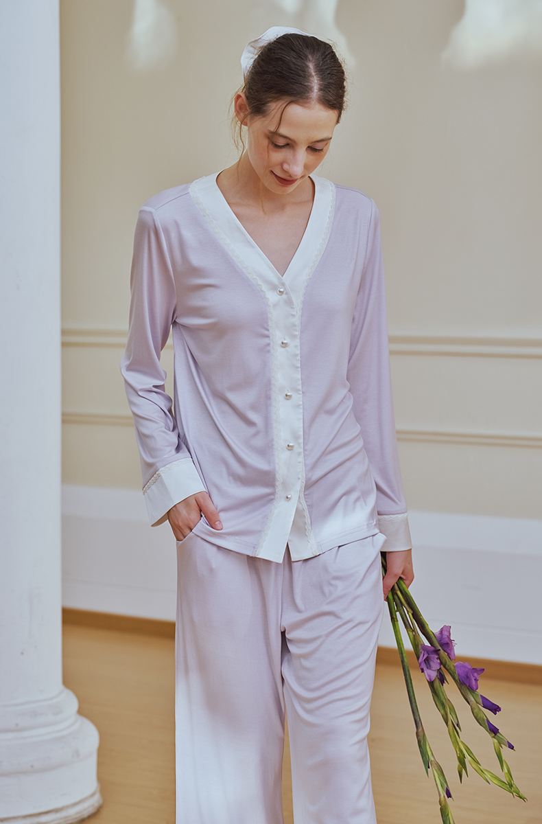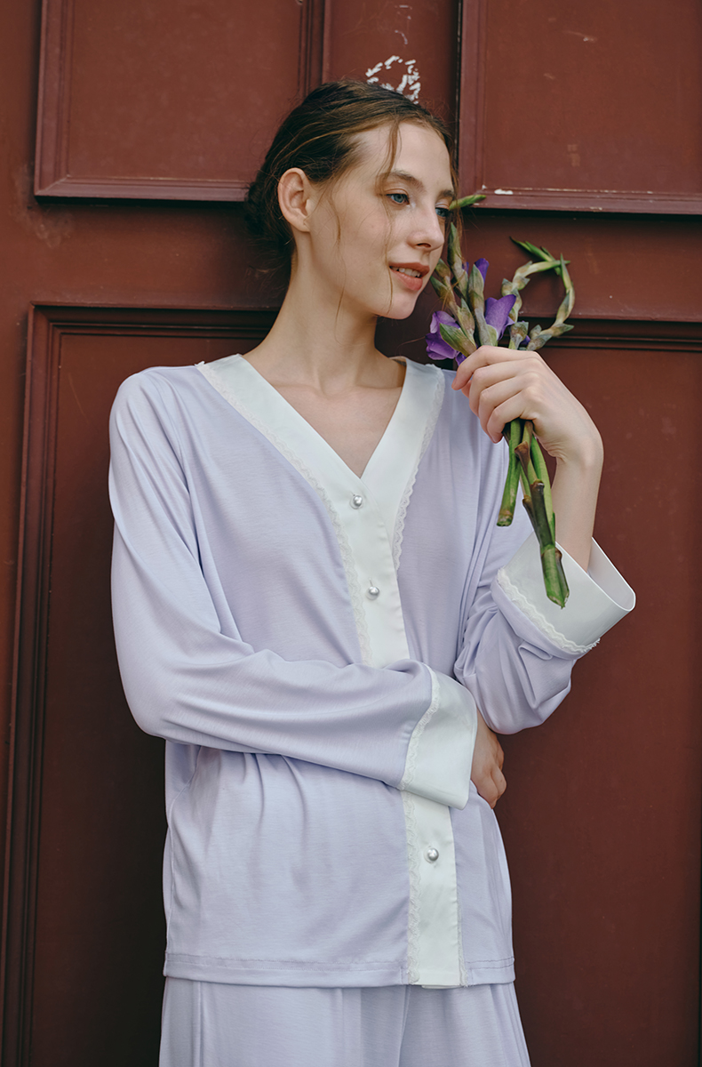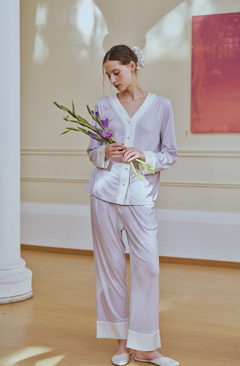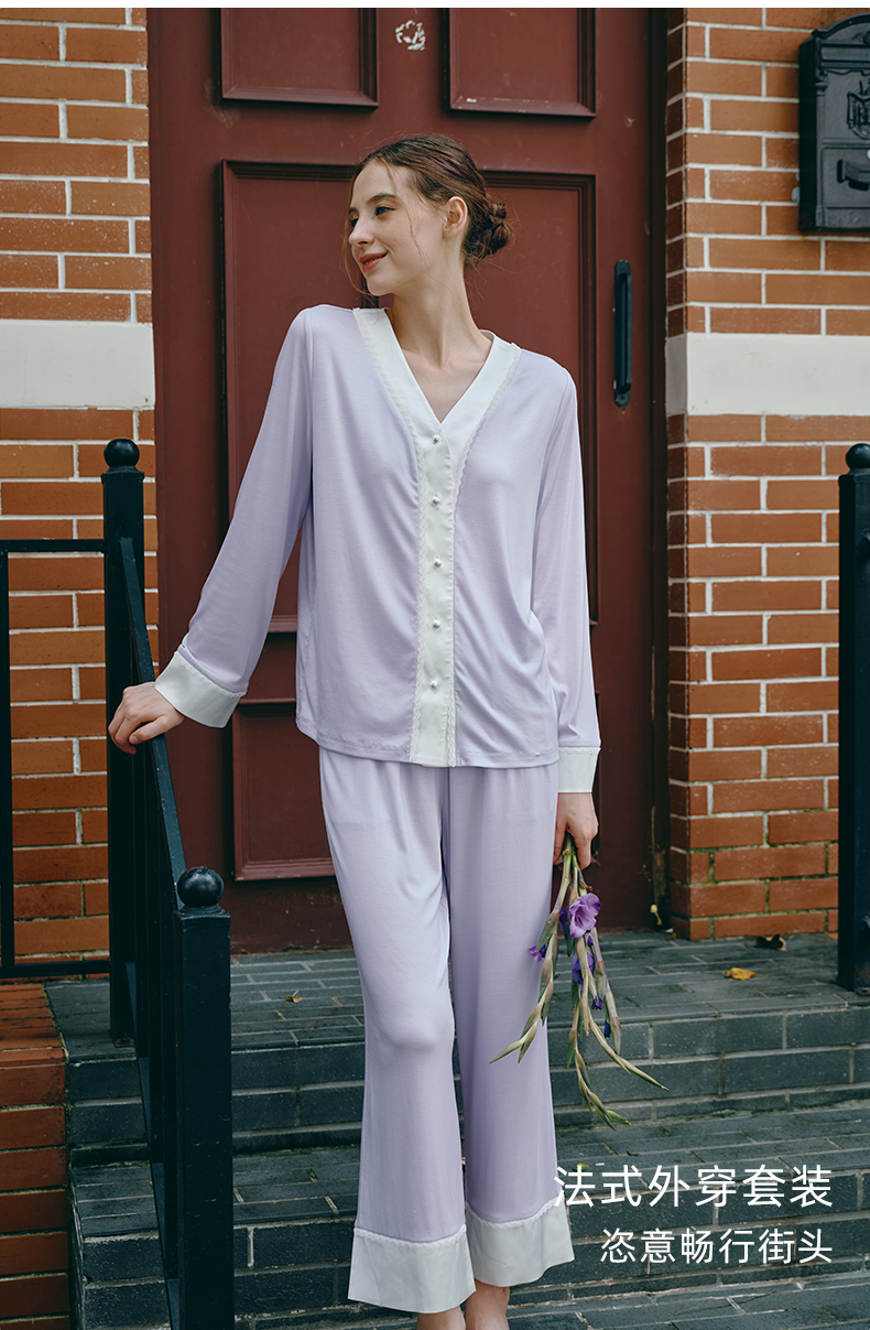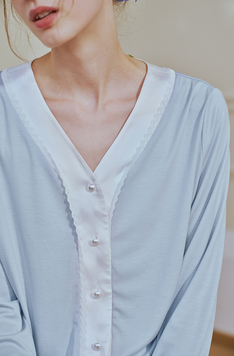 BLEO 莱赛尔天丝拼接缎面珍珠扣长袖长裤套装