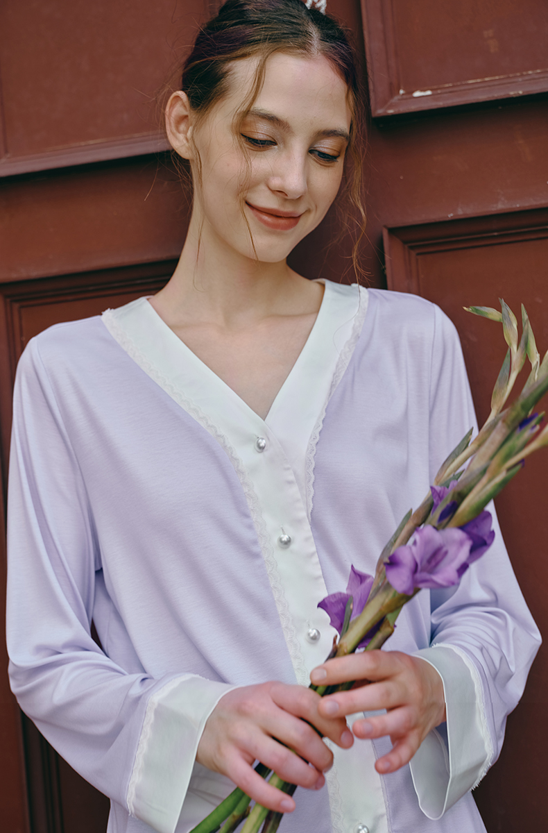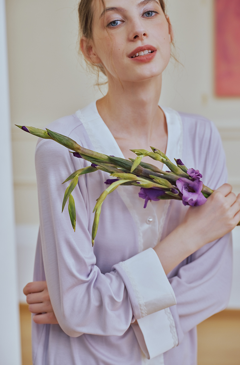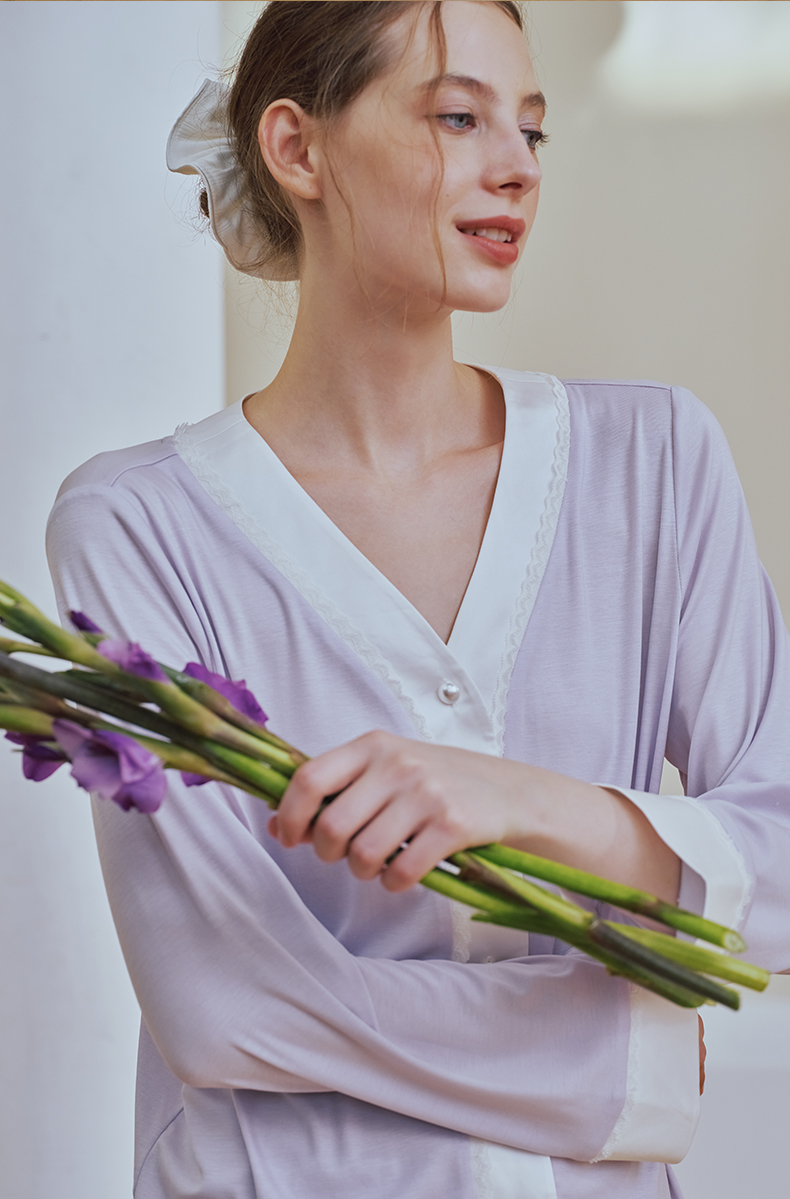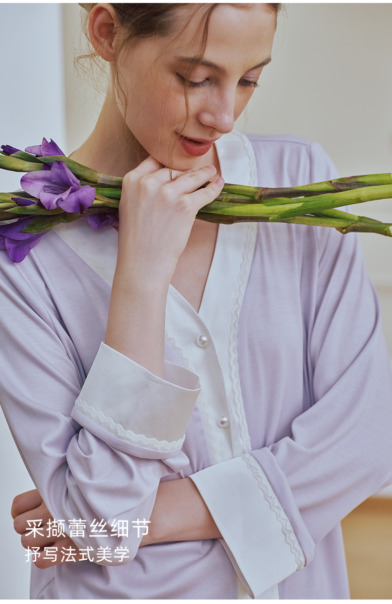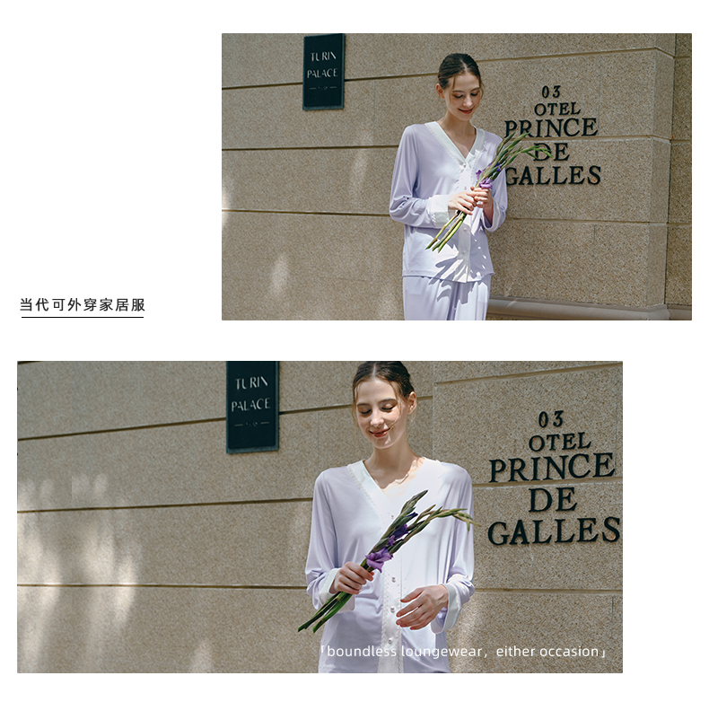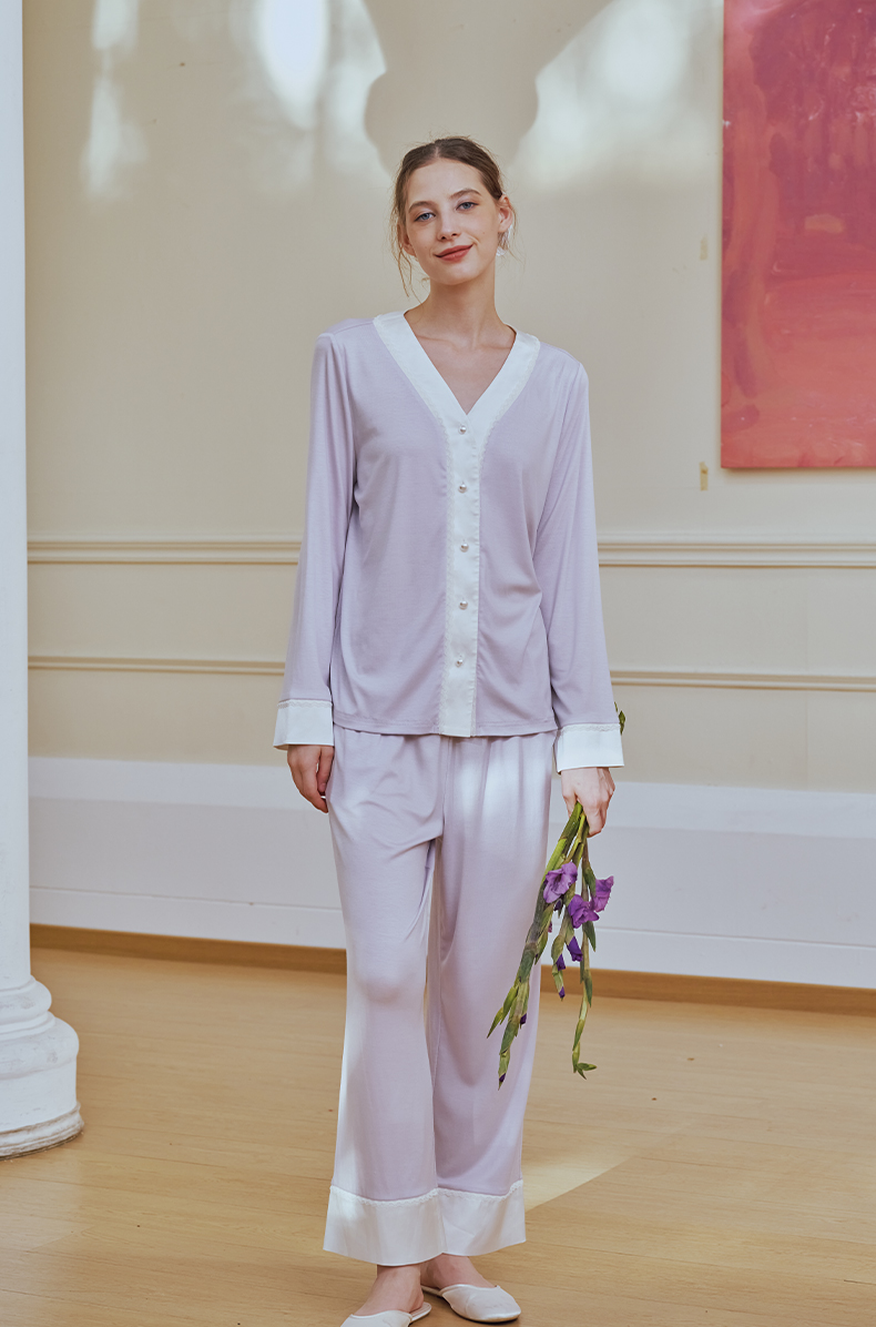 BLEO 莱赛尔天丝拼接缎面珍珠扣长袖长裤套装