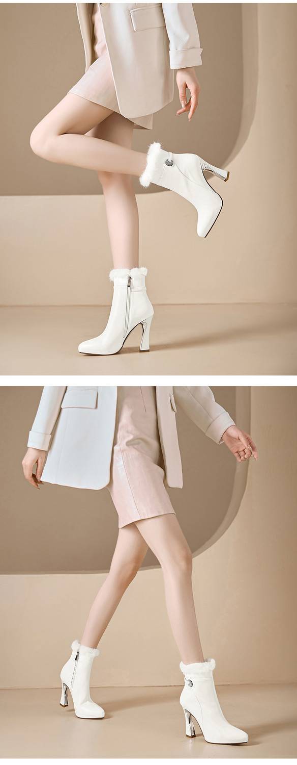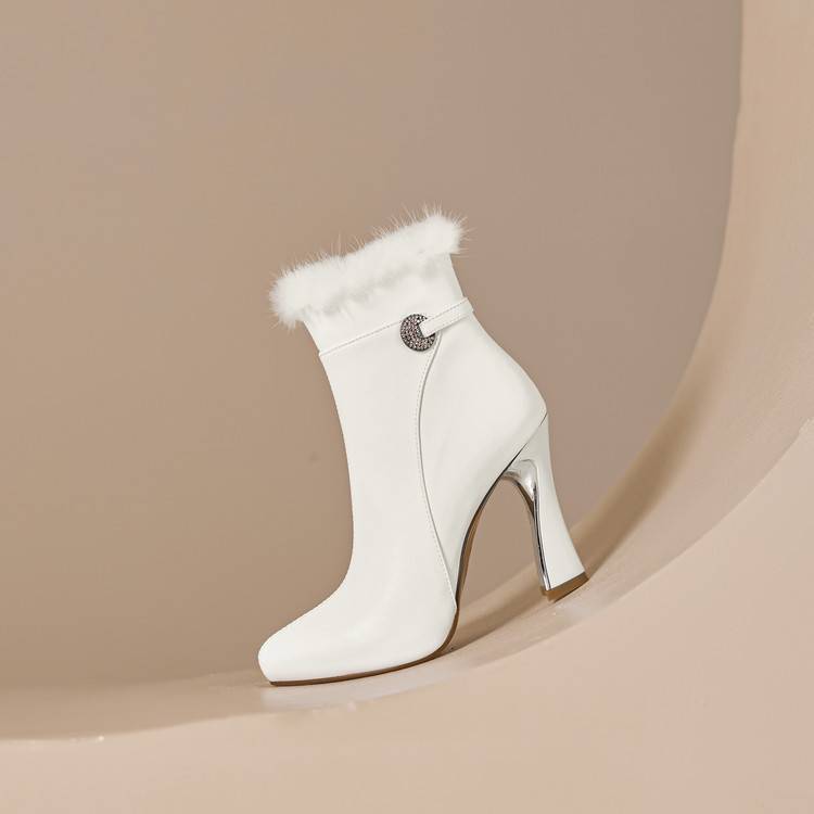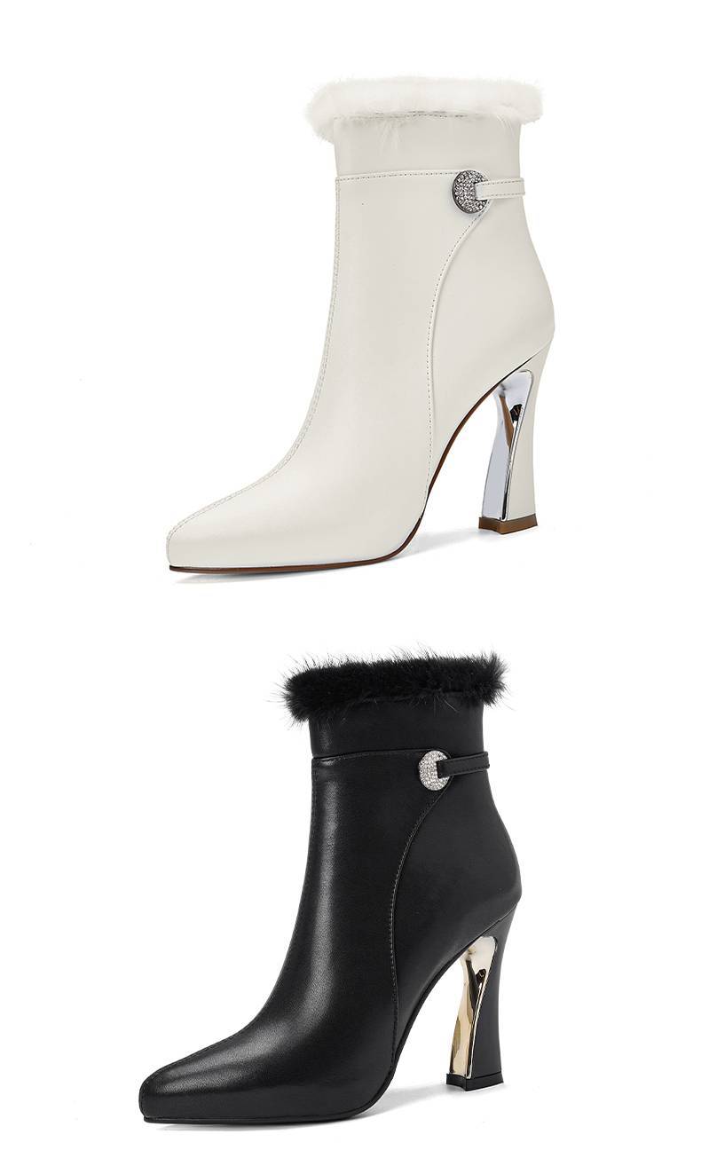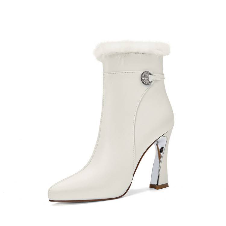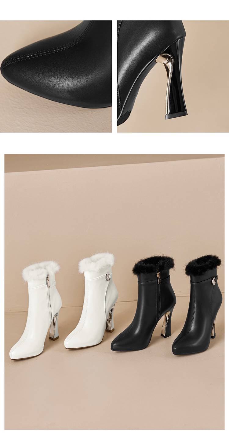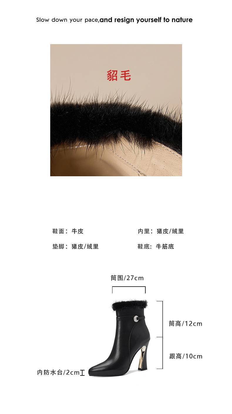 【预售5天】白色真皮防水台高跟短靴女秋冬季新款加绒貂毛裸靴尖头粗跟马丁靴DS&1912