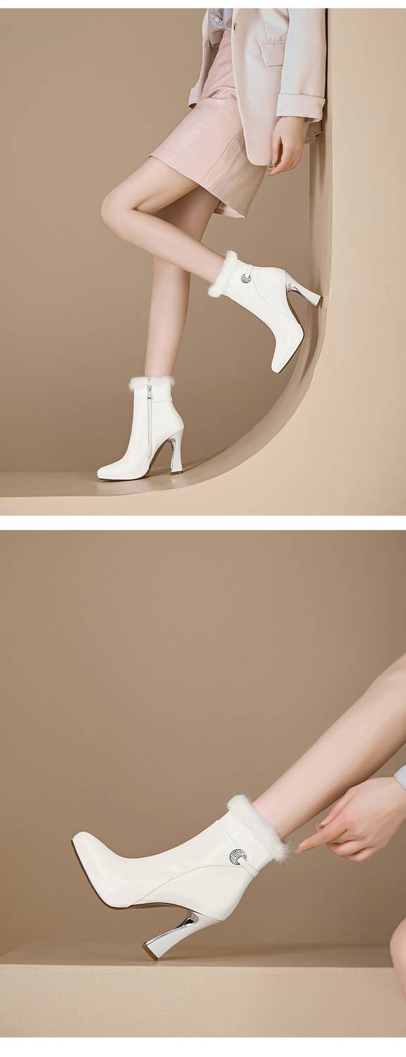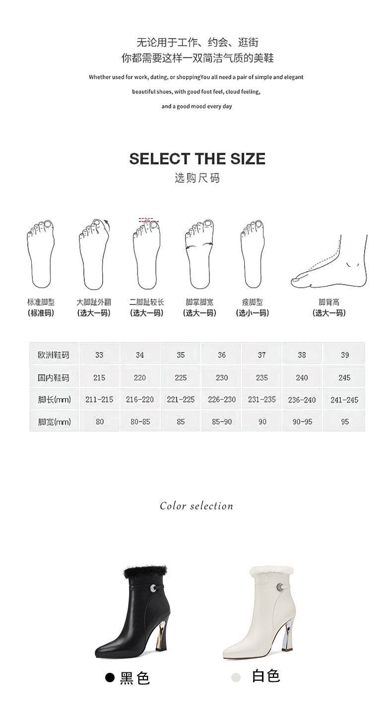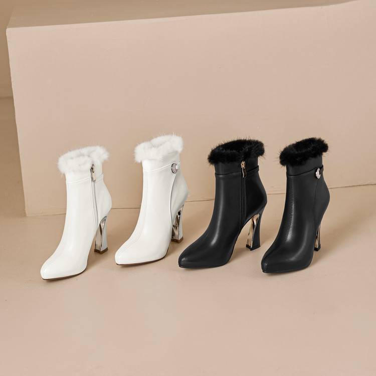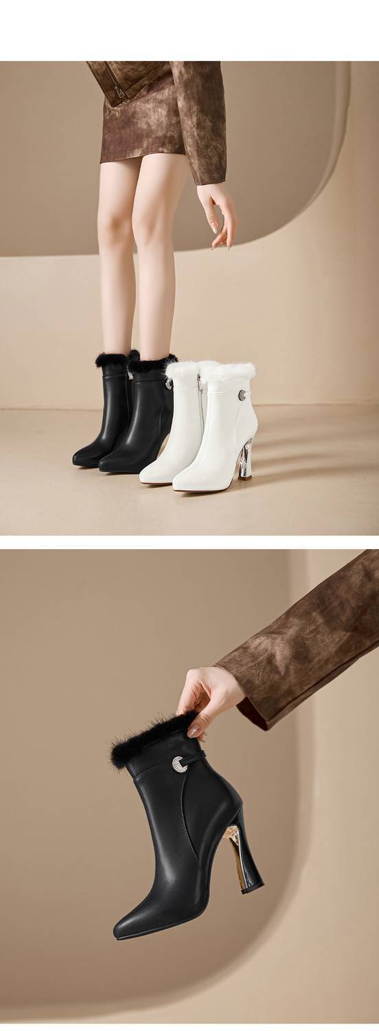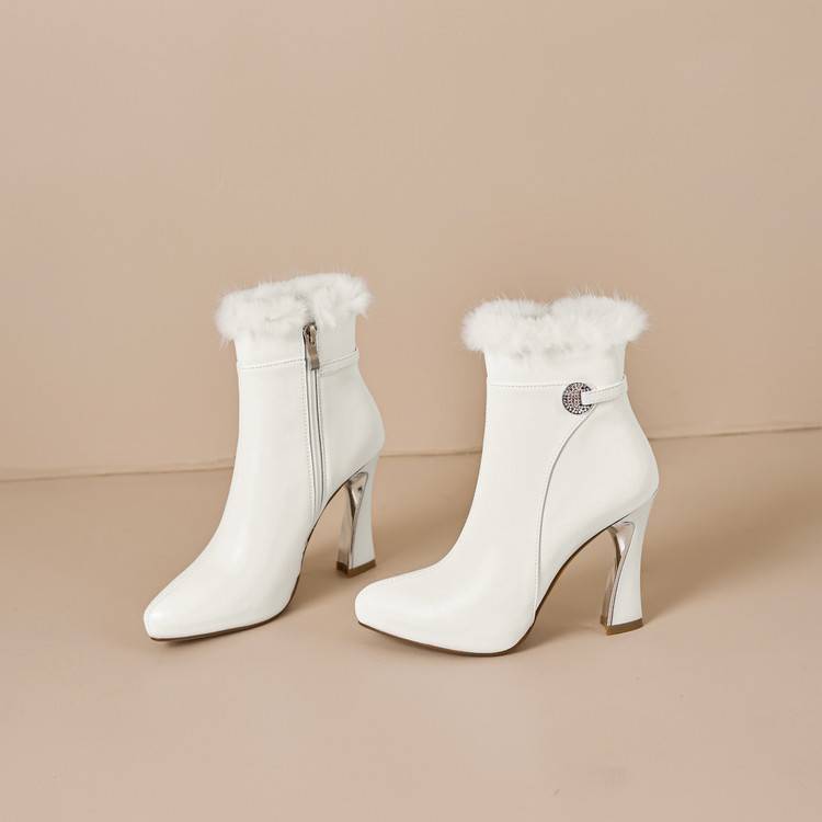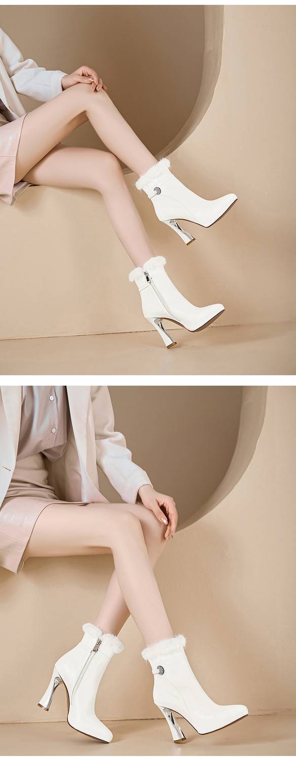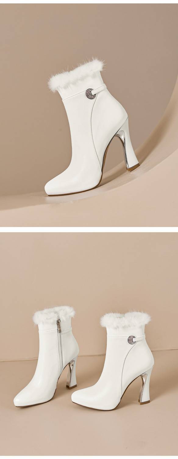 【预售5天】白色真皮防水台高跟短靴女秋冬季新款加绒貂毛裸靴尖头粗跟马丁靴DS&1912